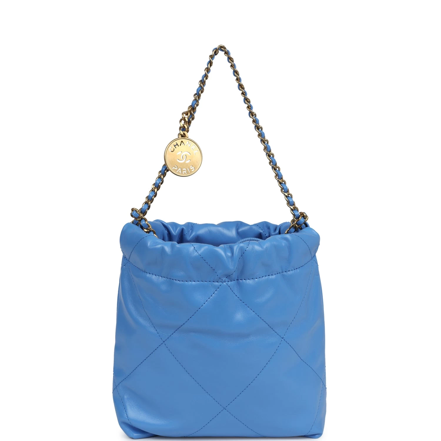 This Chanel Mini 22 Bag is in blue calfskin leather with gold hardware, has the signature diamond quilt, gold metal “Chanel” logo on front of bag, Chanel Paris metal hang tag, chain link interwoven with leather and one long leather cord act as shoulder and cross body strap.