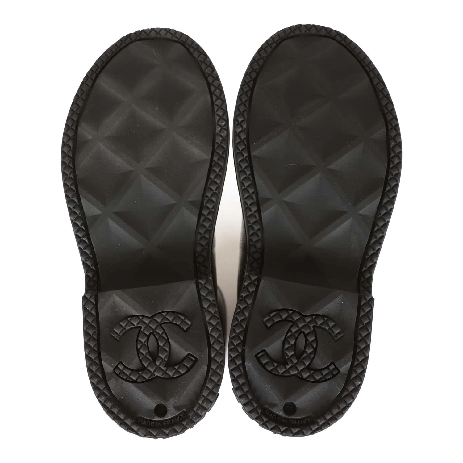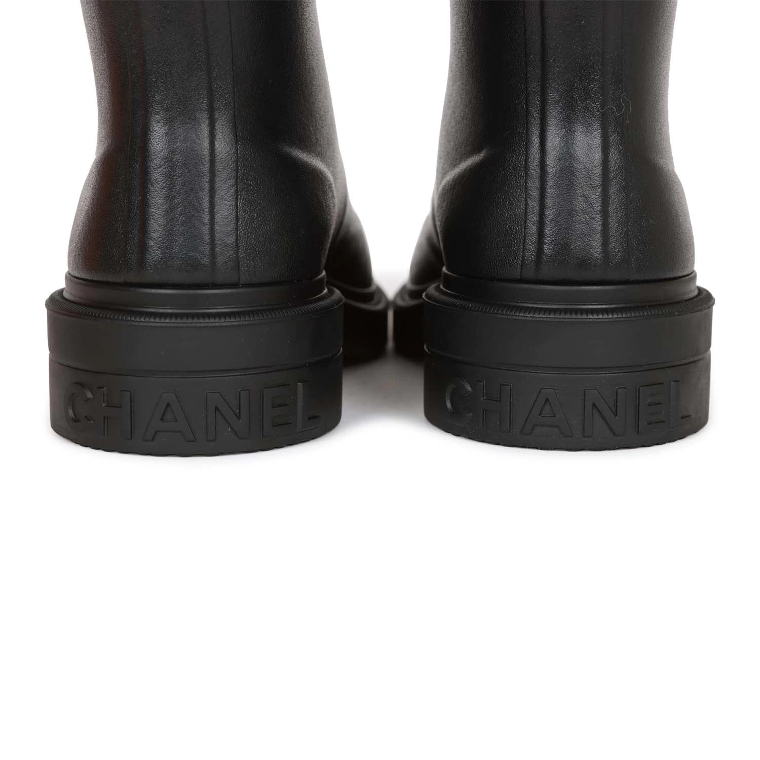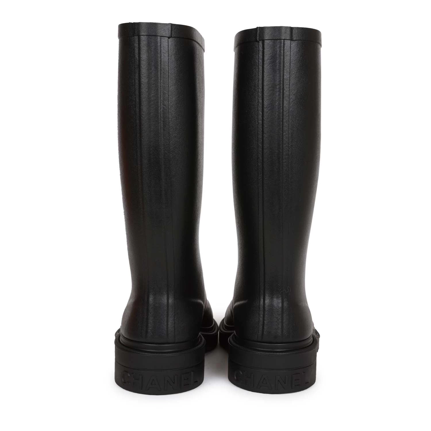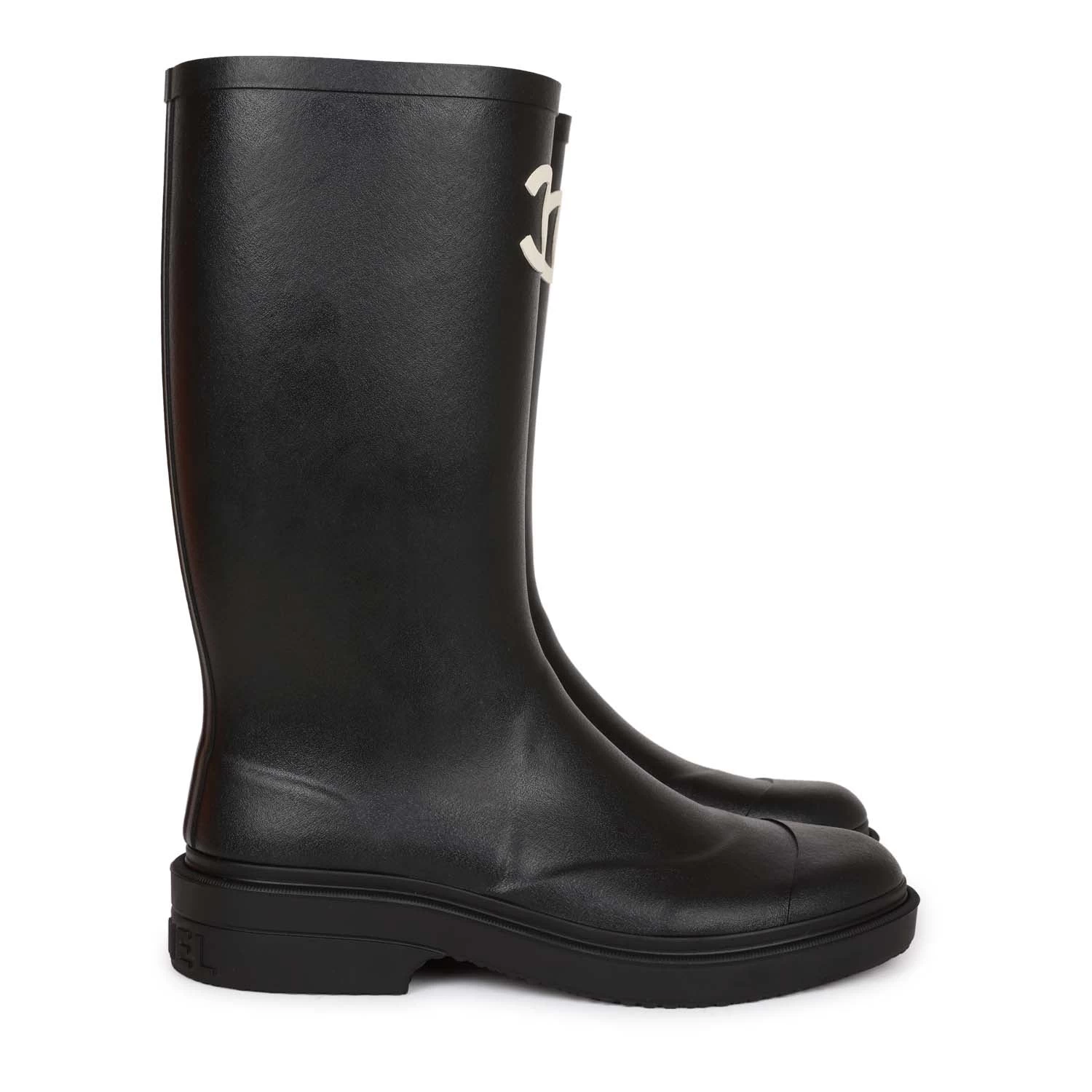 This pair of Chanel Black High Caoutchouc CC boots are in black rubber with CC design and have black leather soles.