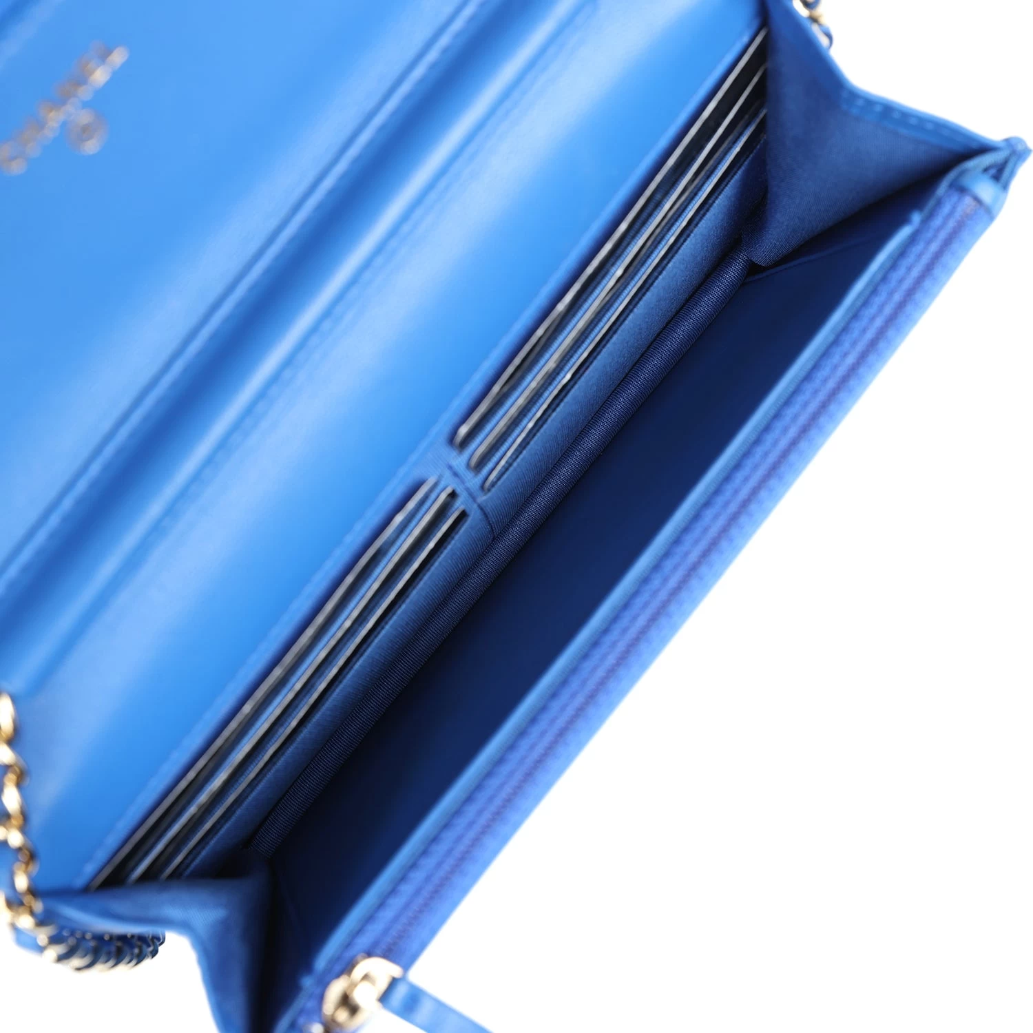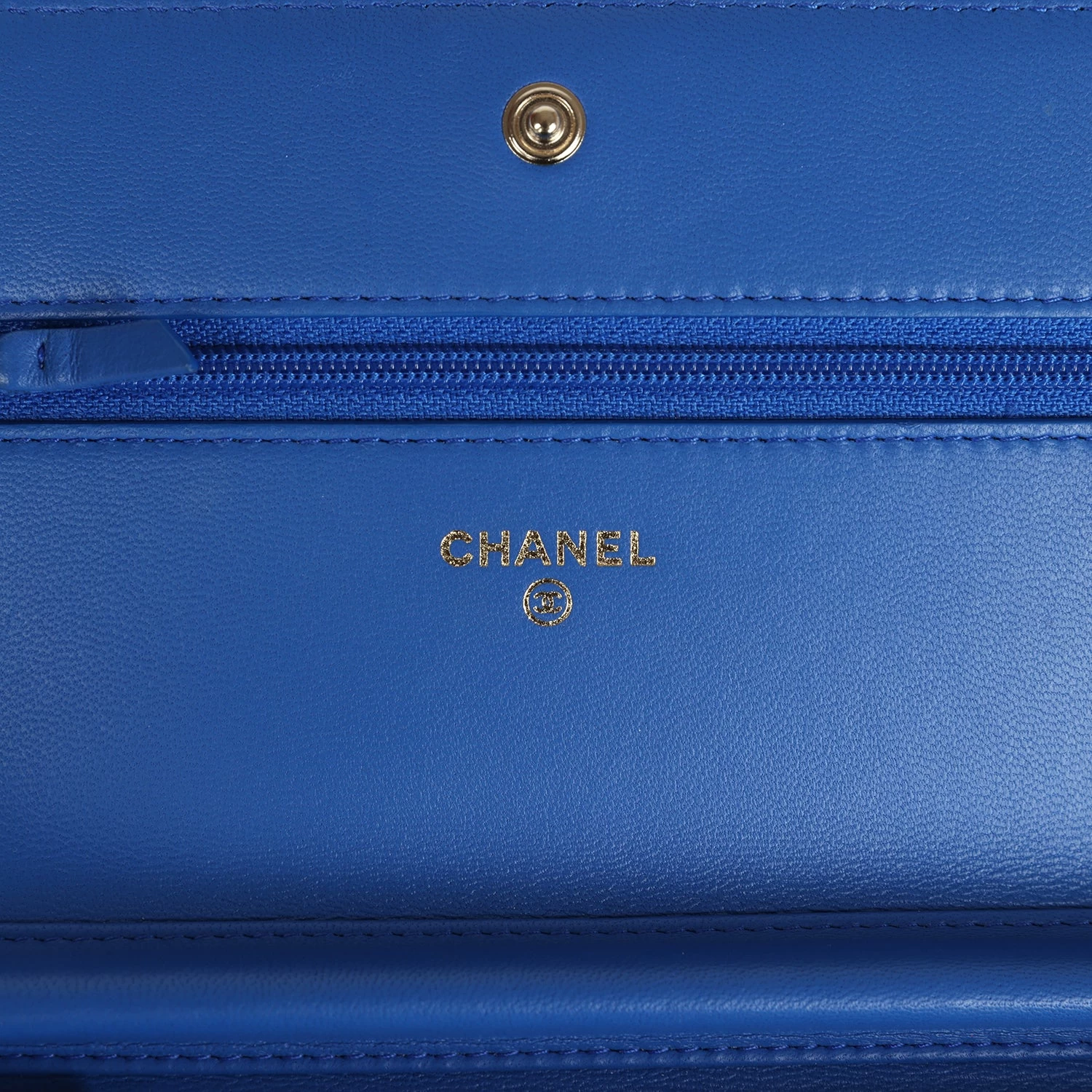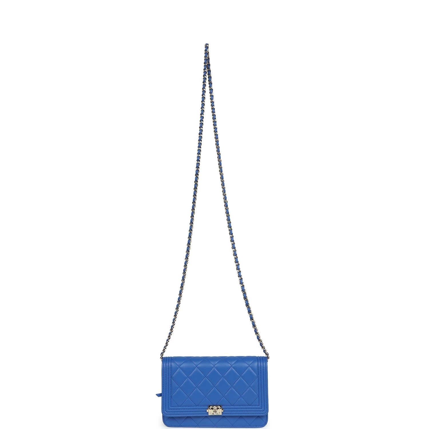 This Chanel Boy Wallet On Chain is in Electric Blue lambskin leather with Light Gold hardware, has tonal stitching, a front flap with Le Boy CC emblem snap closure, and long Light Gold tone metal and Electric Blue leather crossbody/shoulder chain strap.