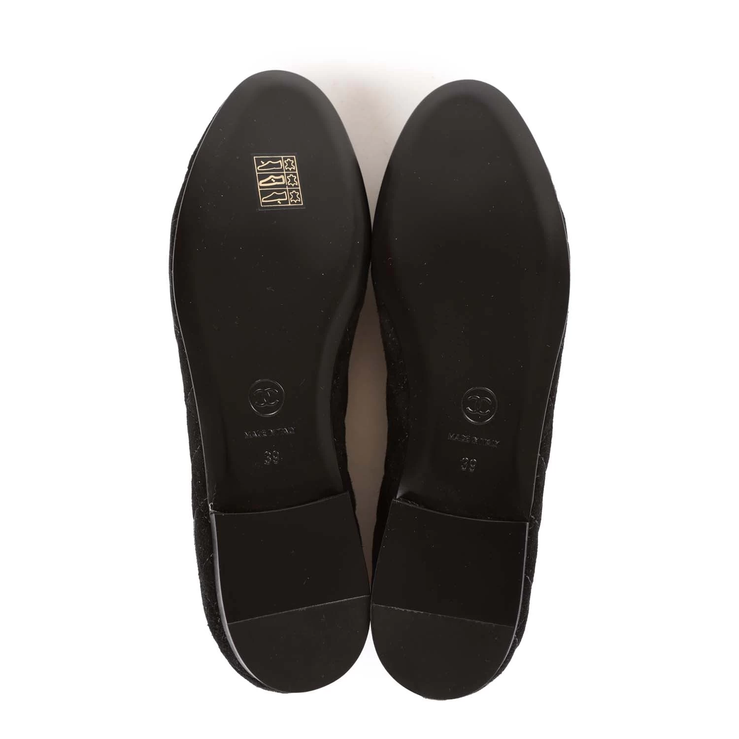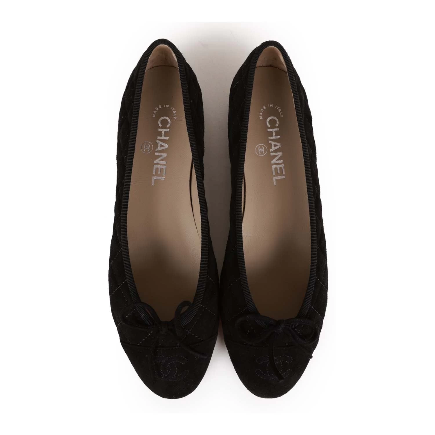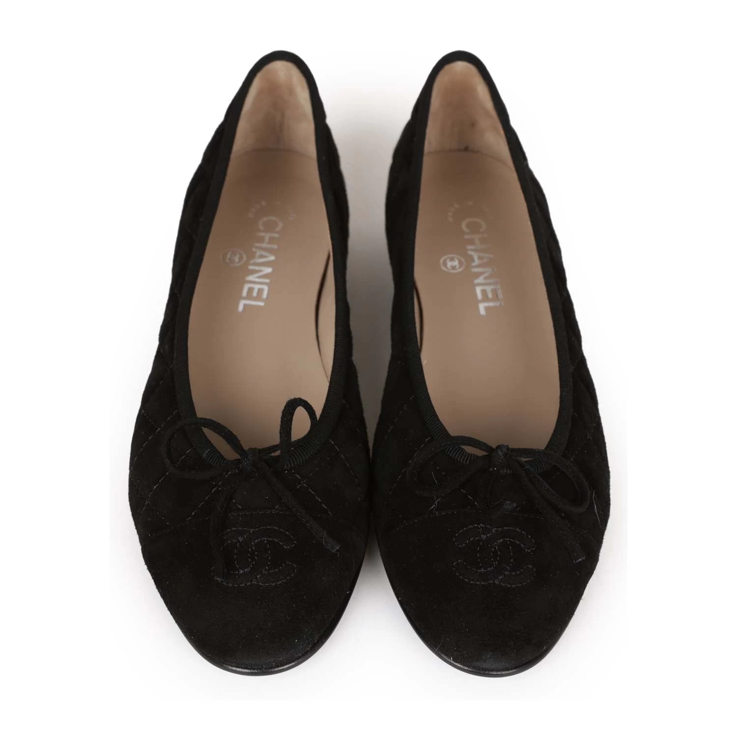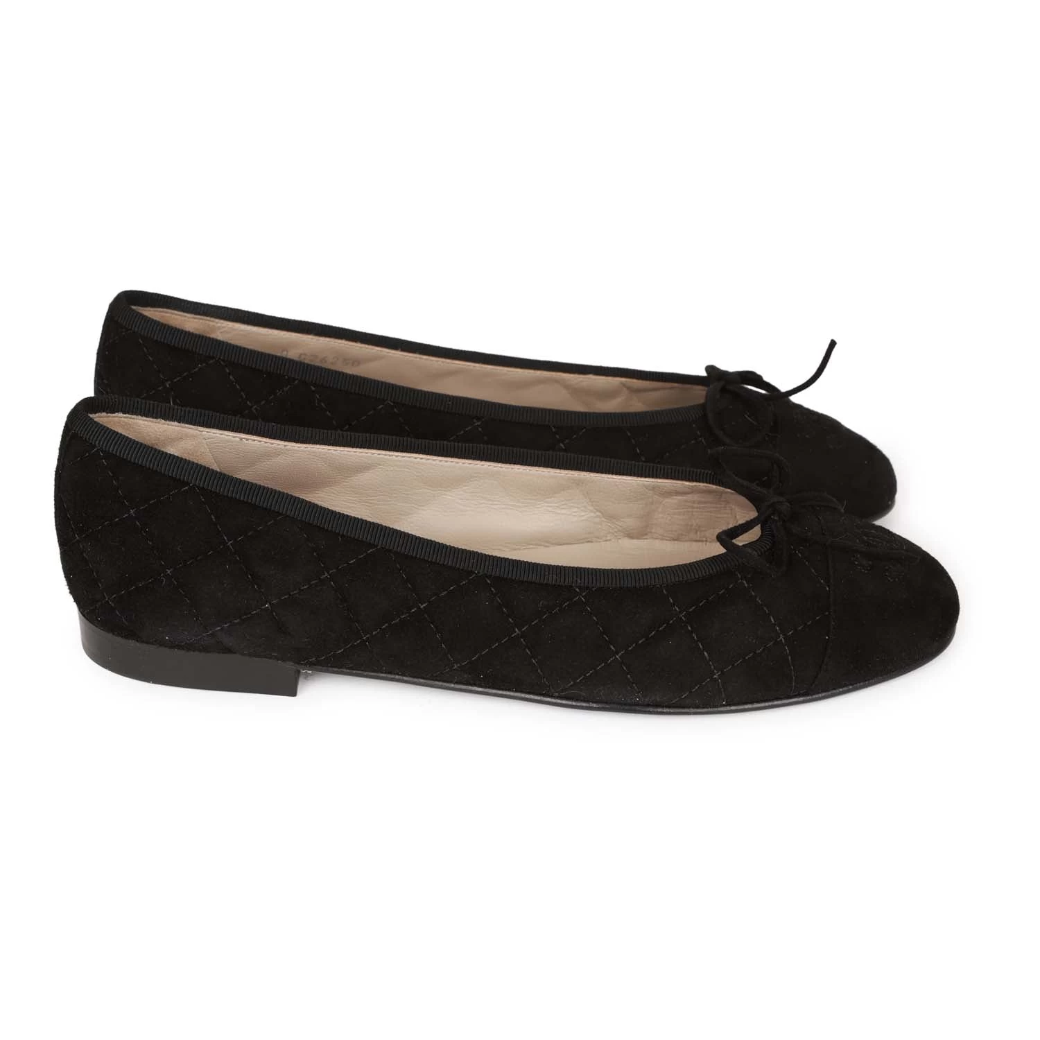 This pair of CC Ballet flats are in Black quilted suede with a Black suede “CC” logo at the toes, tie front, tonal stitching, and black leather soles.