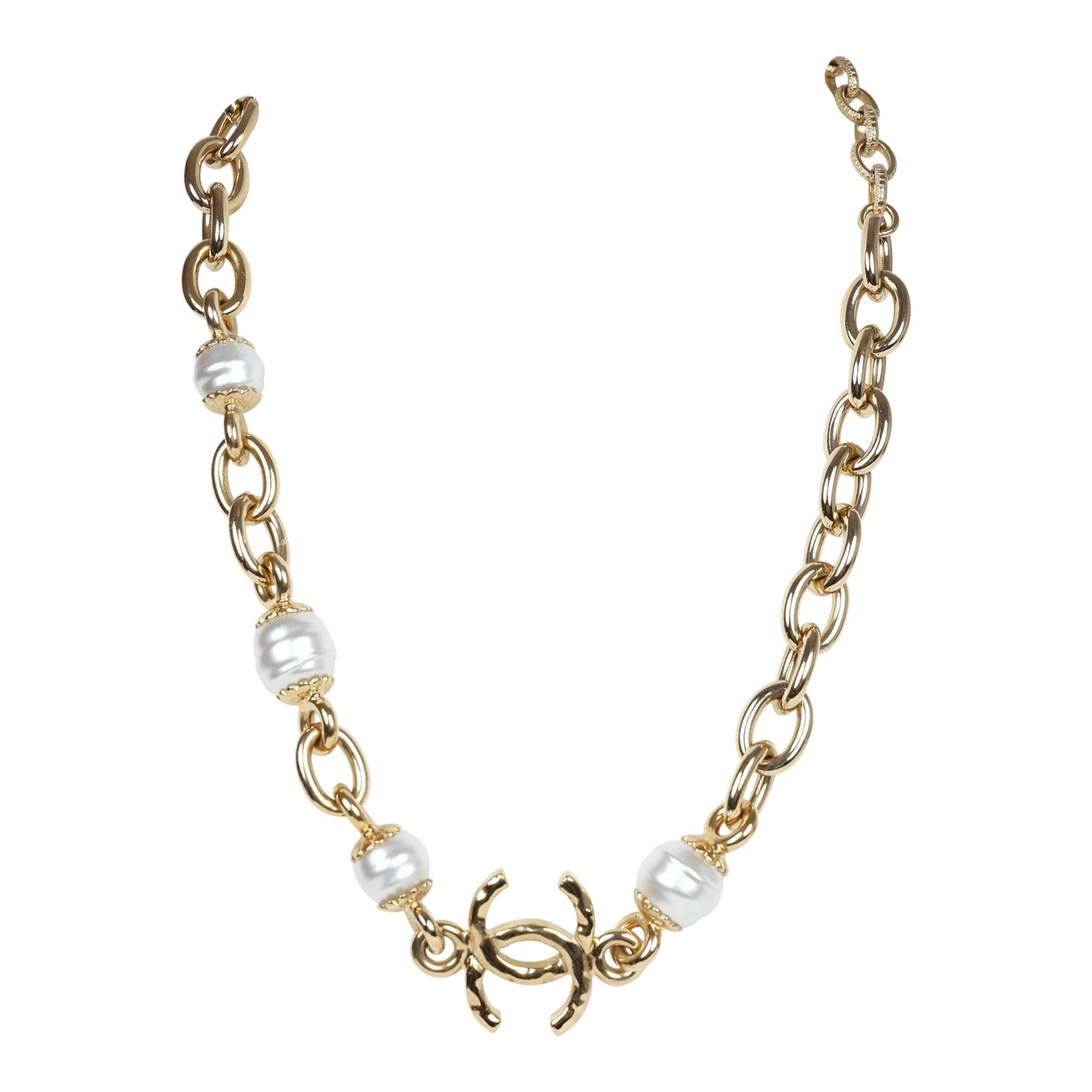 This necklace features a signature CC logo charm with large pearls, a gold tone link chain and gold lobster clasp closure.