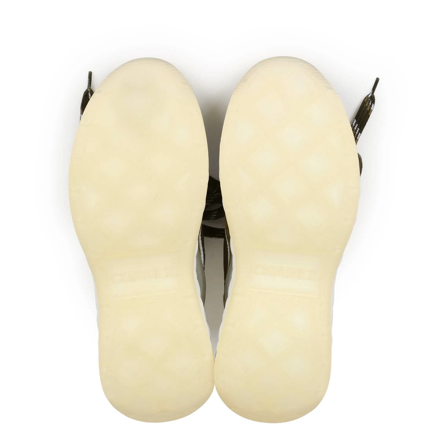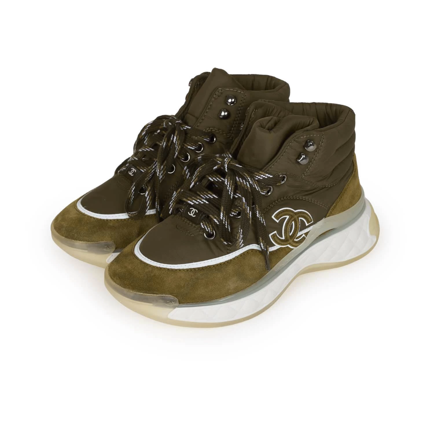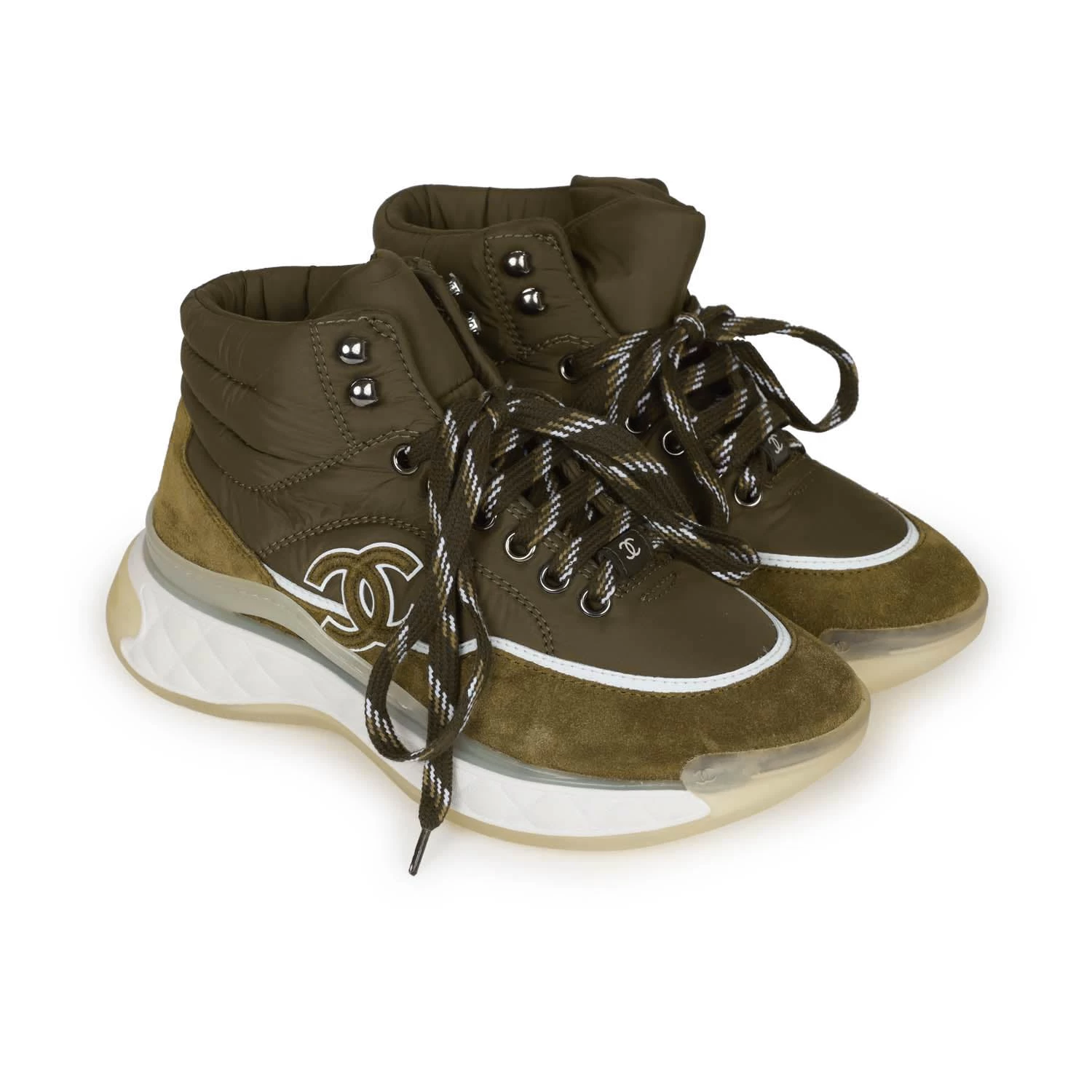 This pair of Chanel CC Hightop Winter Sneakers are in Olive Green Nylon and Suede with CC design and chunky rubber sole in size 35 EU.