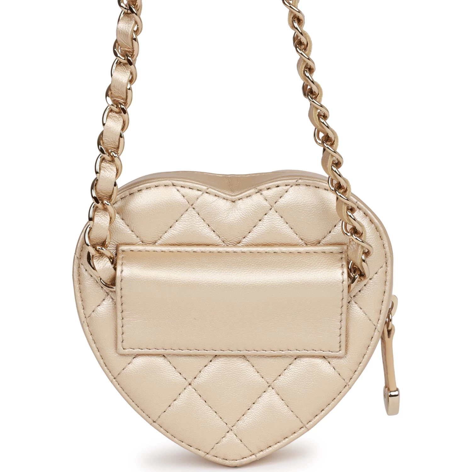 This CC In Love Heart Belt Bag is in gold lambskin leather with light gold tone hardware and features a front flap with signature CC turnlock closure and an interwoven light gold tone chain link and gold leather adjustable belt strap.