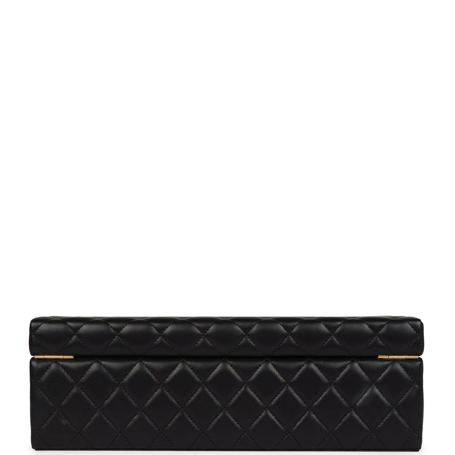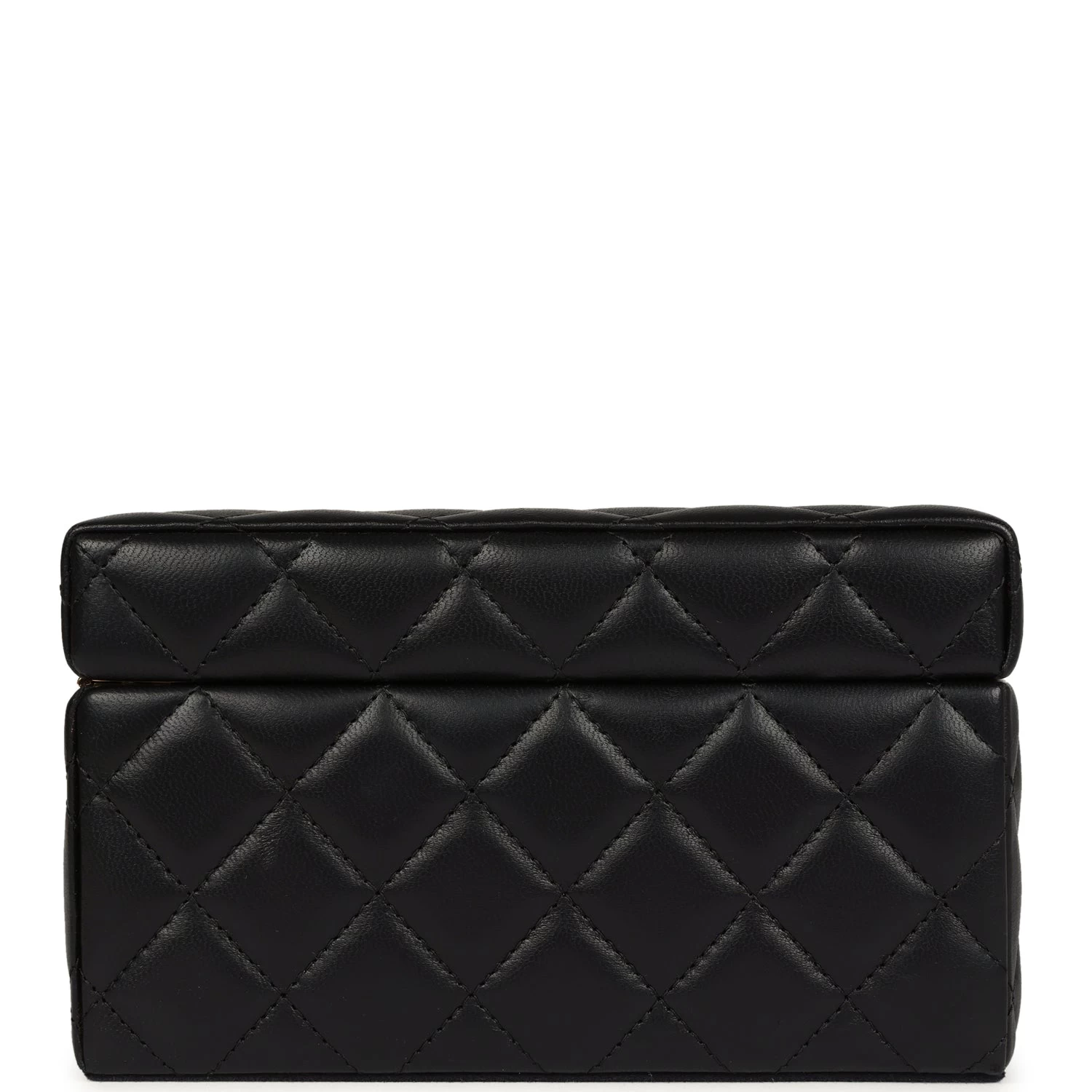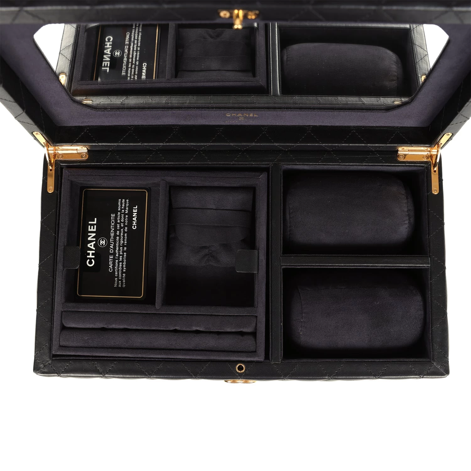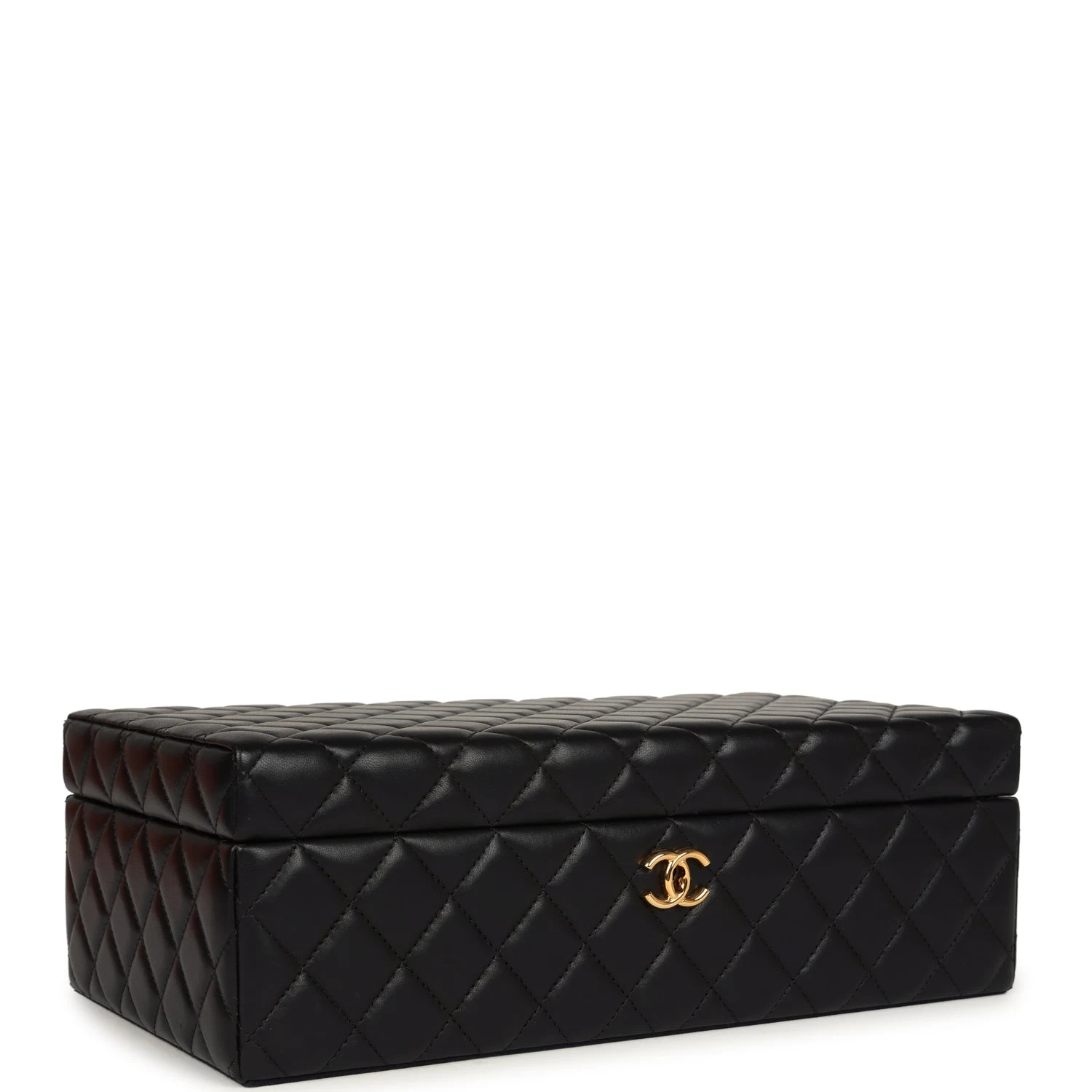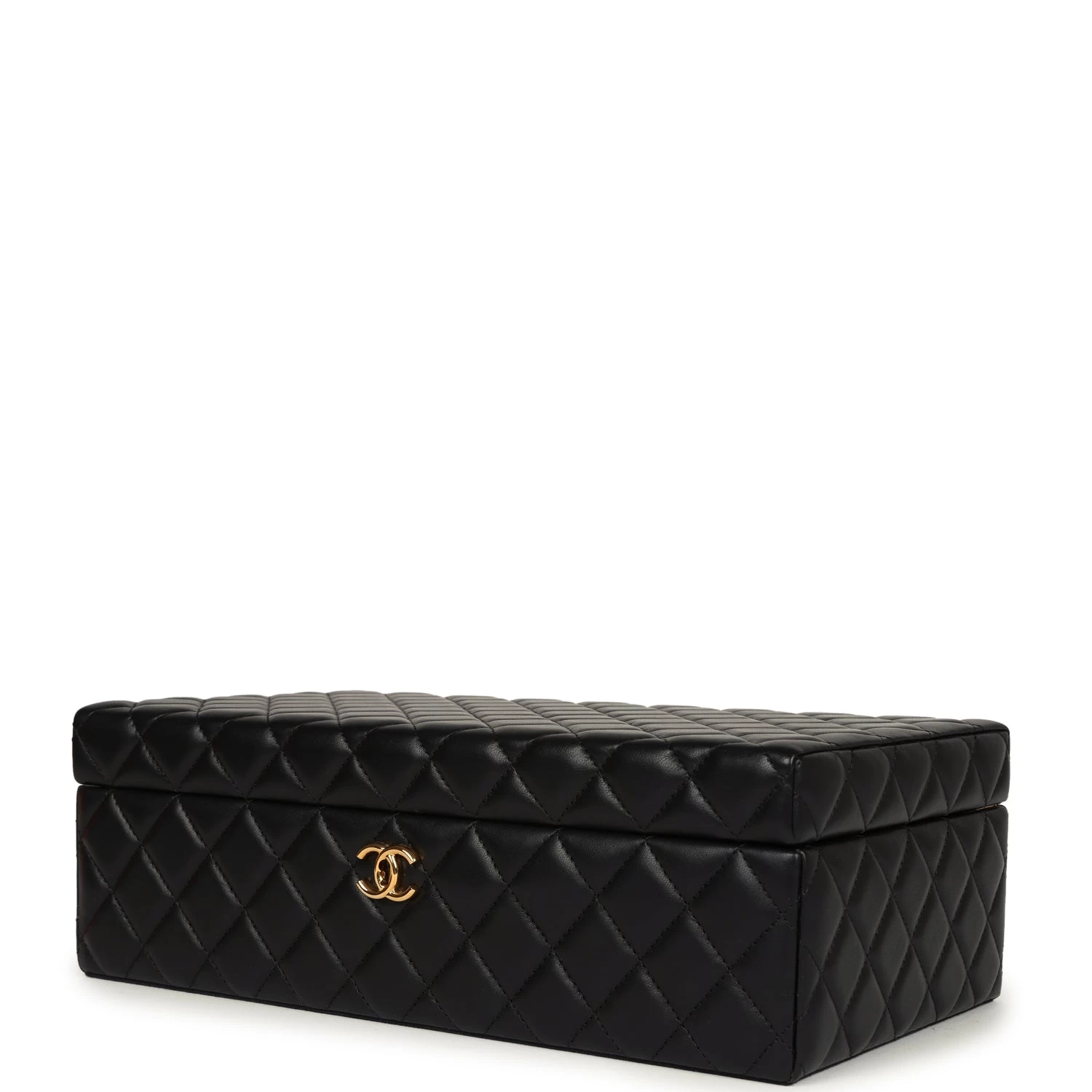 This Chanel Jewelry Box is in black quilted lambskin with gold tone hardware and features a fold over top with signature CC push-lock fastening closure.