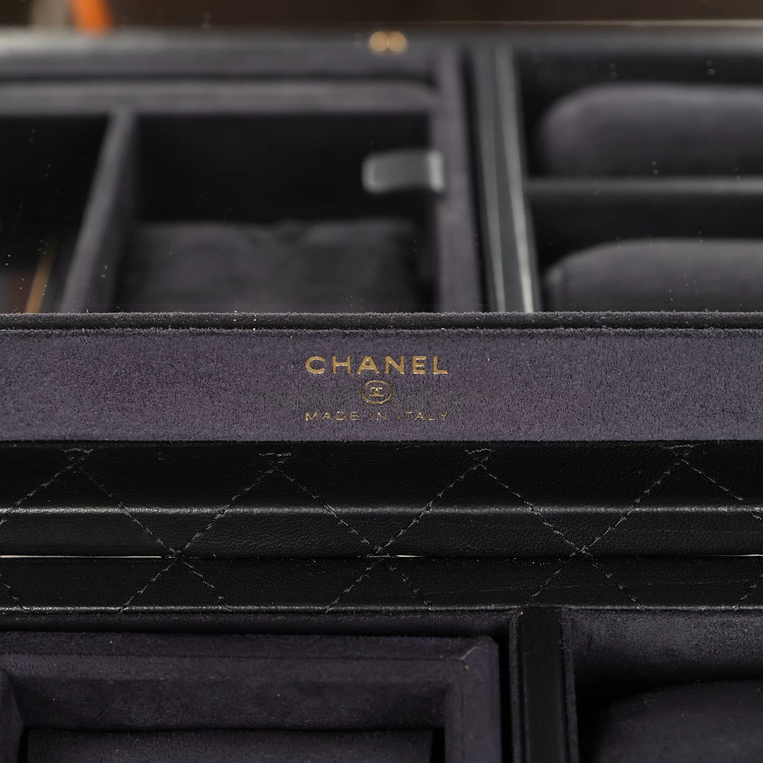 The interior is lined in black fabric and leather with an internal mirror, along with 6 jewelry compartments, 2 bracelet cushions, and a partitioned compartment.