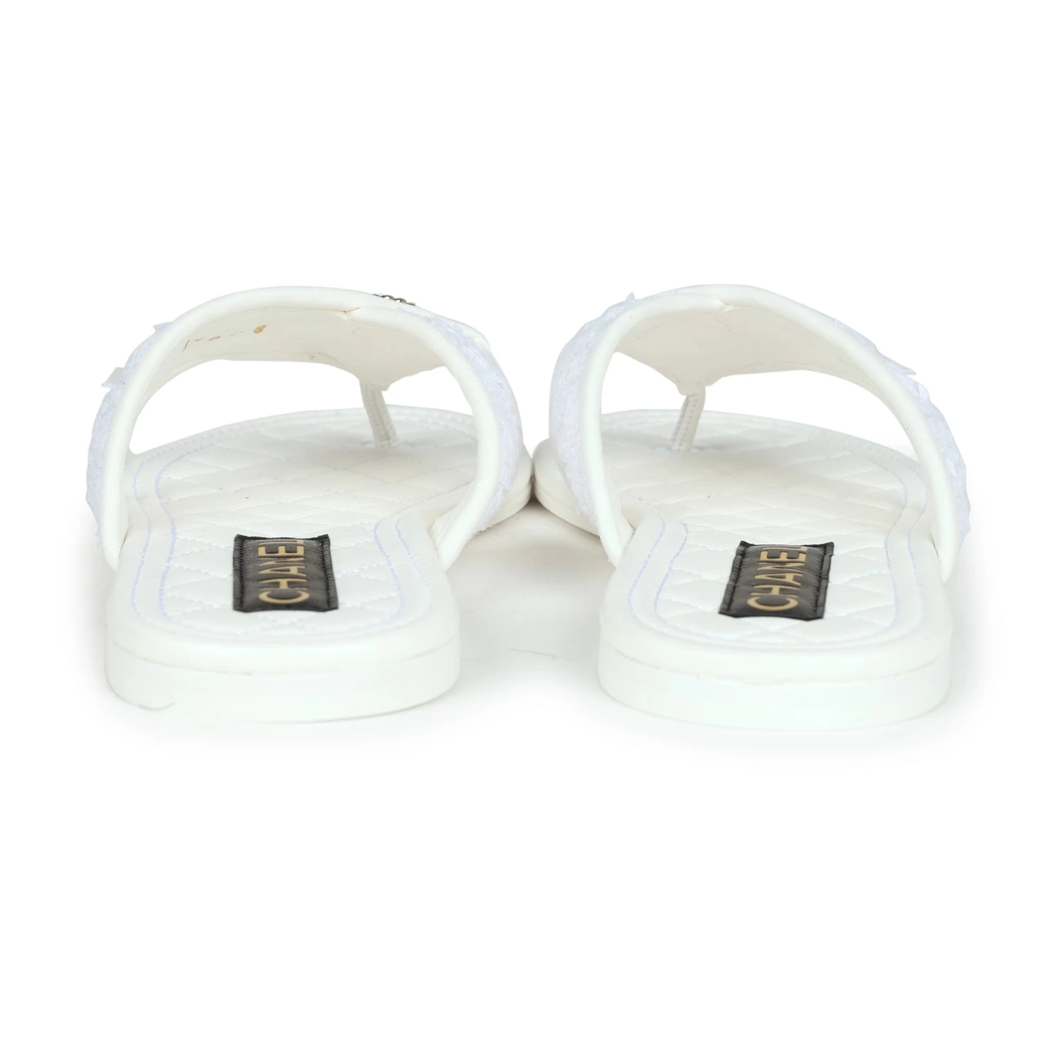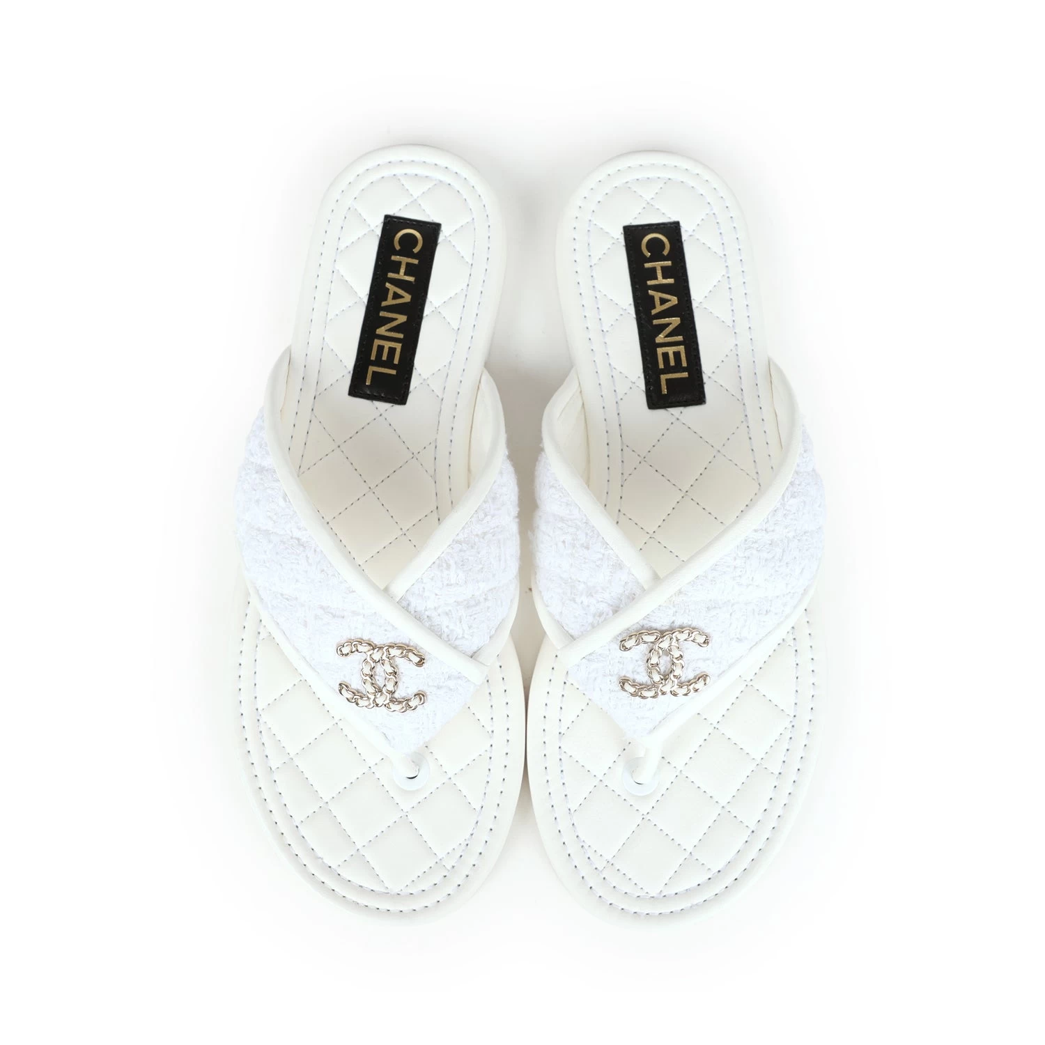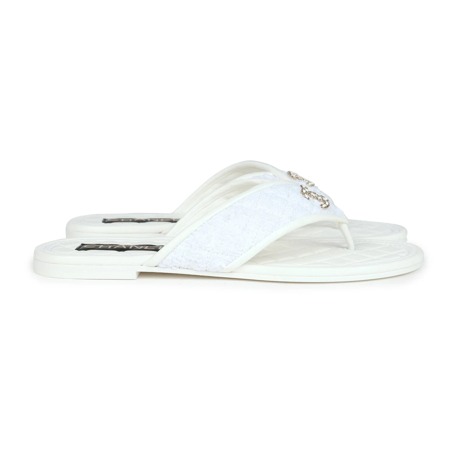 These Chanel CC logo thong sandals are made of White lambskin leather and White tweed fabric with Gold hardware and feature a Gold chainlink CC logo on the front, tonal stitching, a mixture of tweed and lambskin thong straps, and a White natural leather insole.