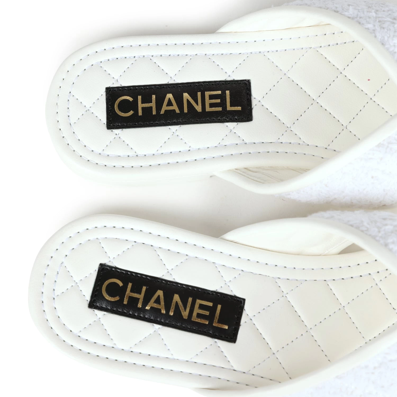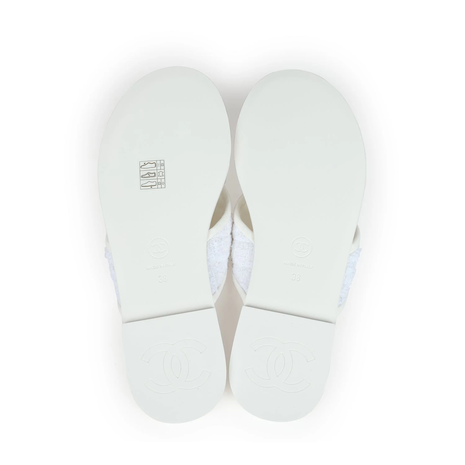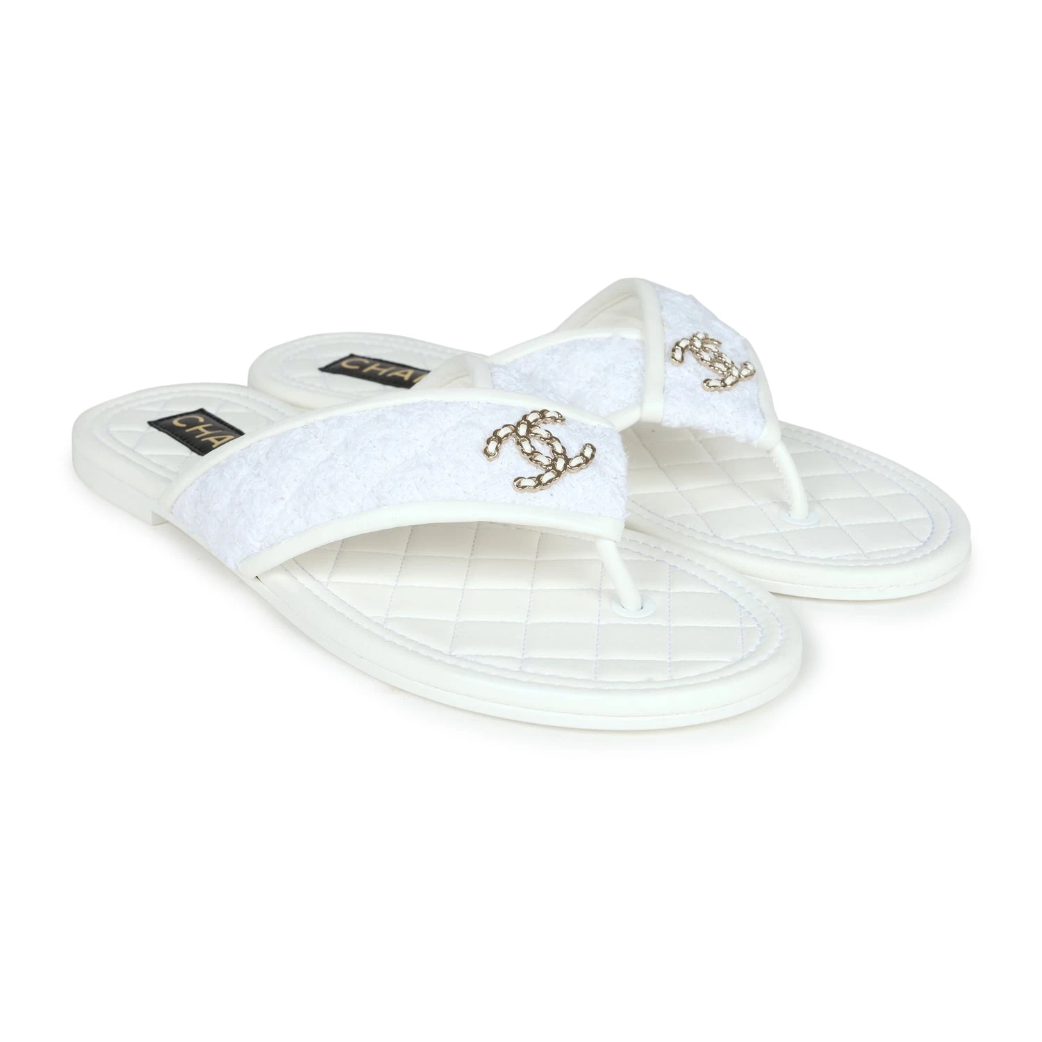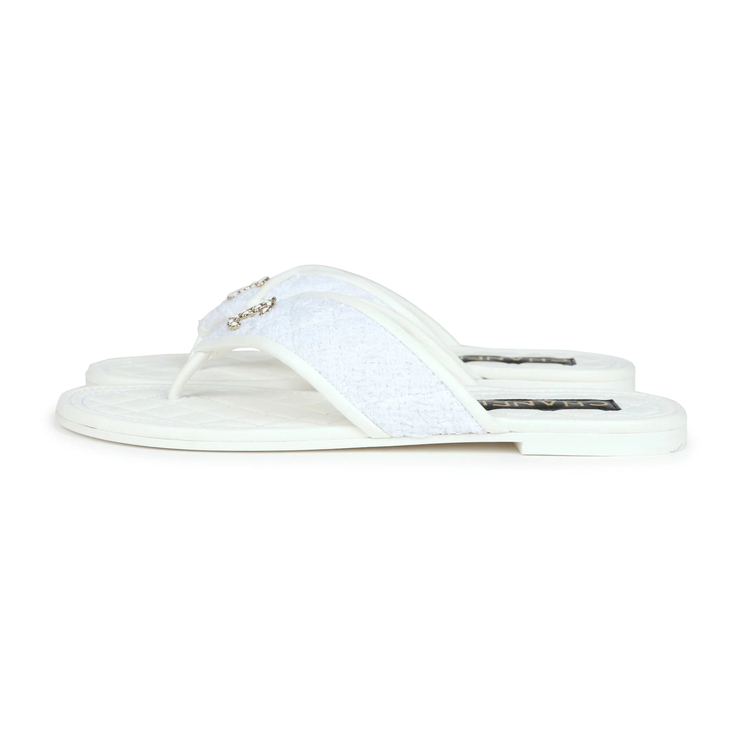 These Chanel CC logo thong sandals are made of White lambskin leather and White tweed fabric with Gold hardware and feature a Gold chainlink CC logo on the front, tonal stitching, a mixture of tweed and lambskin thong straps, and a White natural leather insole.