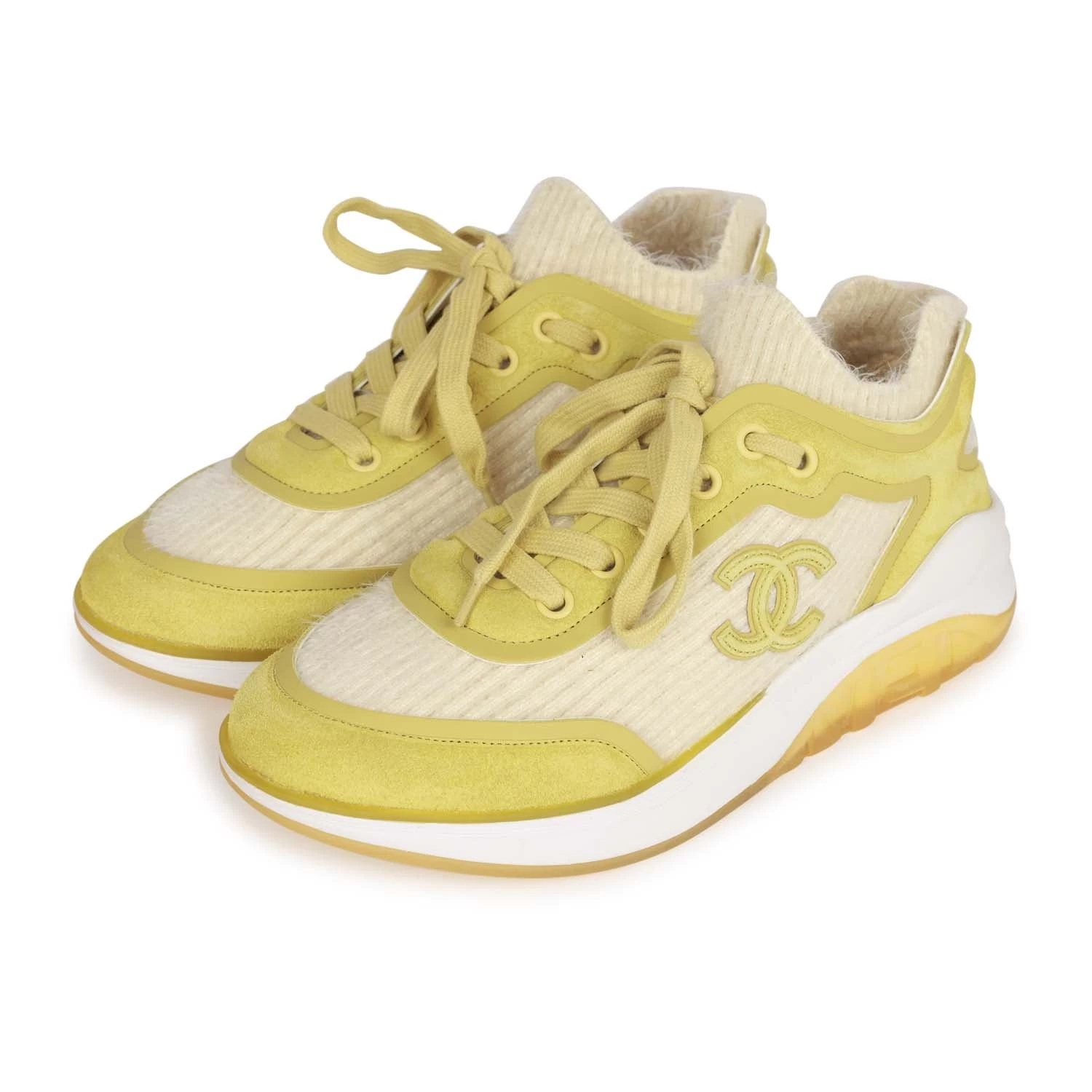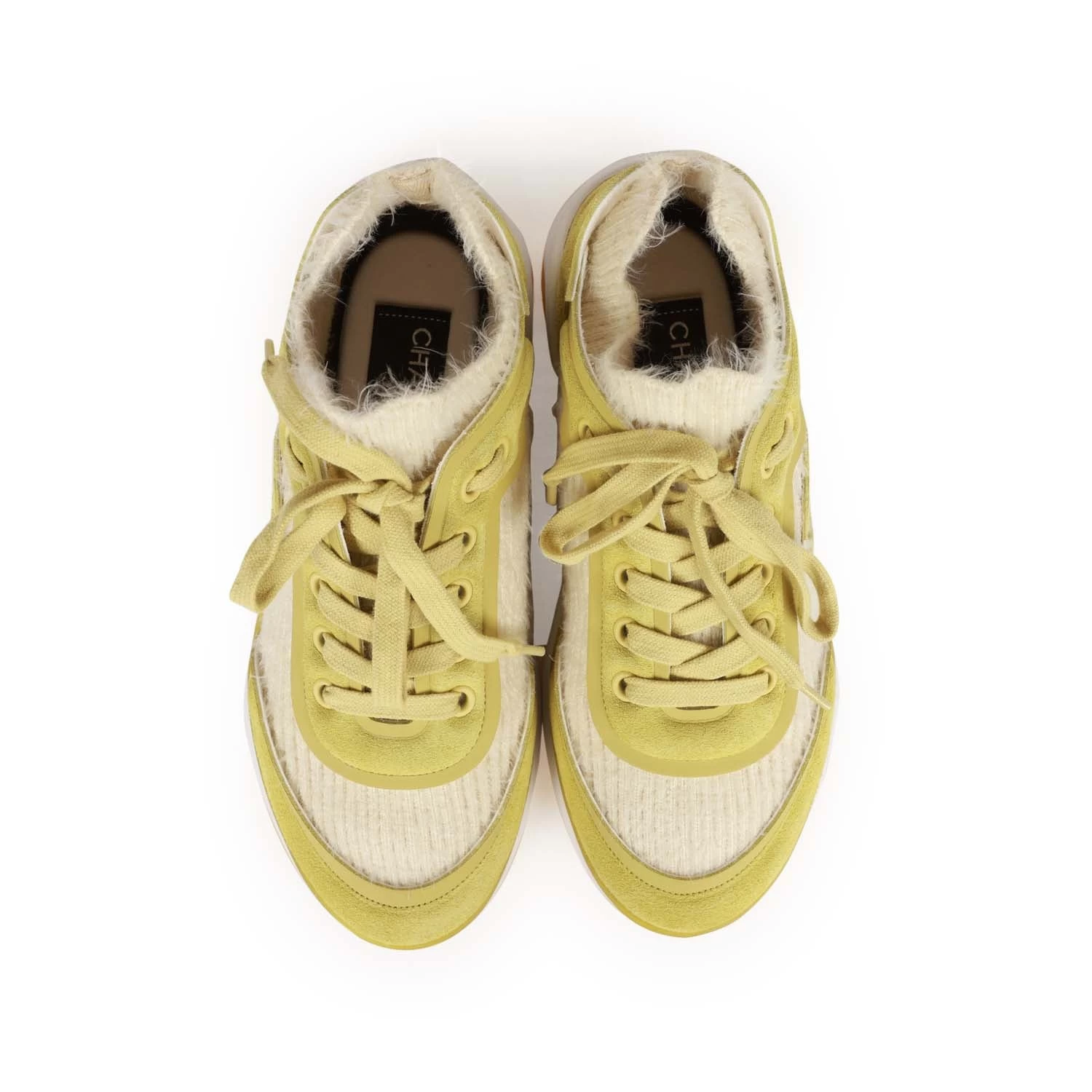 This pair of Lowtop Sneakers in Light Green Suede and Off-White Knit with CC logo and a chunky rubber sole is in size 35EU.