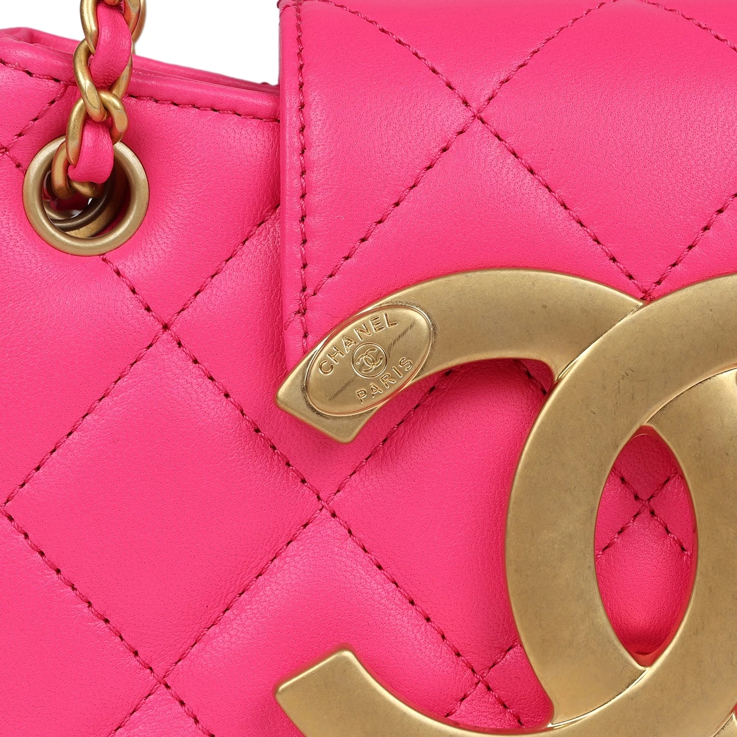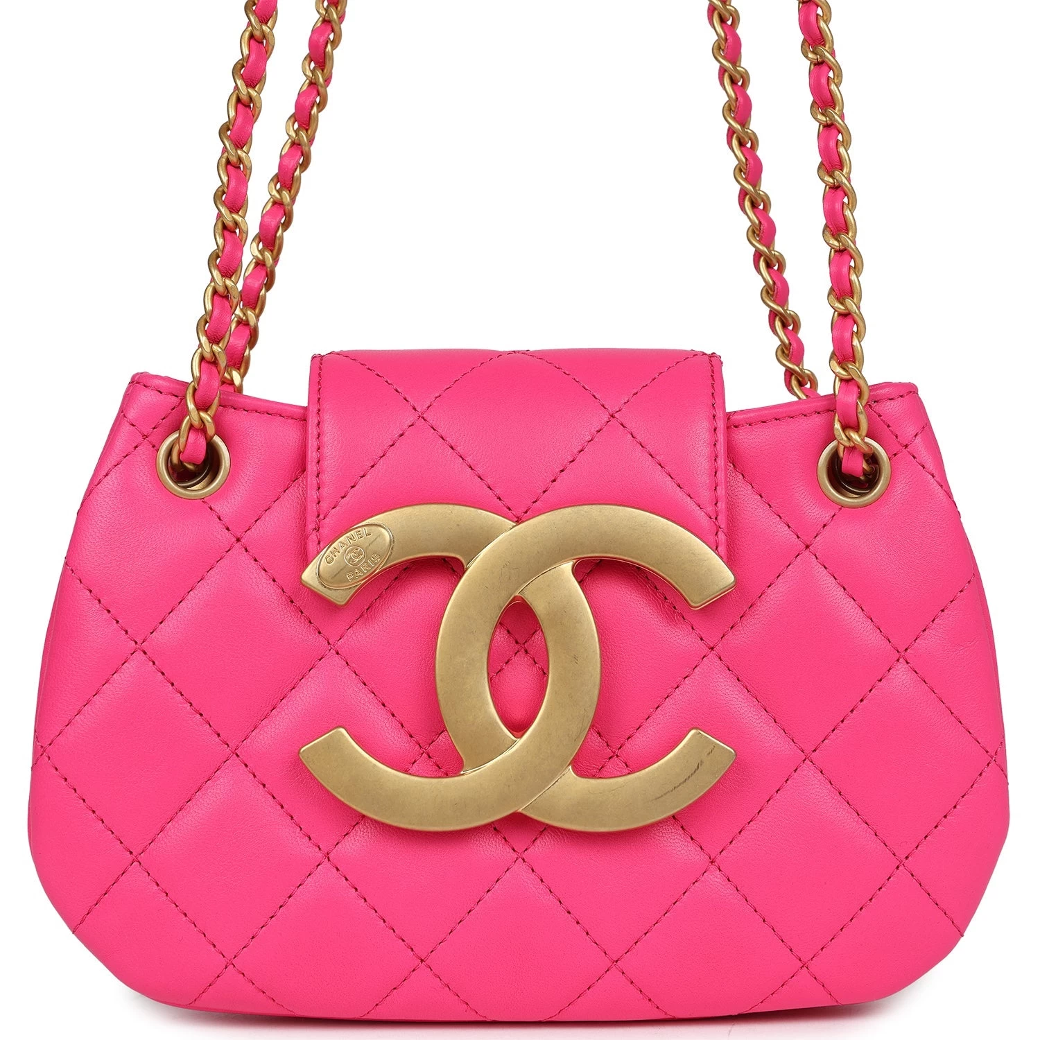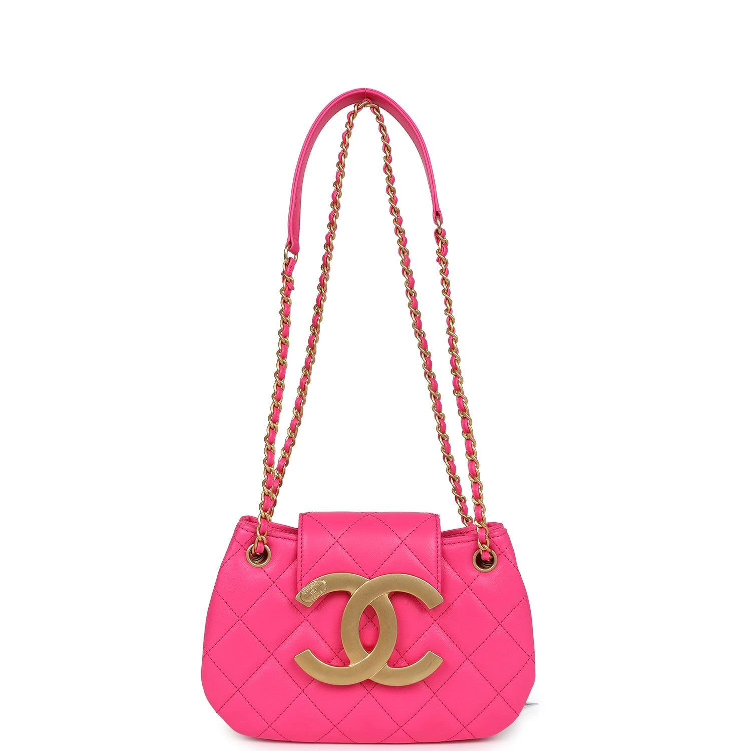 This CC Shoulder Bag Fuchsia Lambskin leather with Antique Gold Hardware, features tonal stitching, round shape structure, large antique gold CC tab snap closurethat folds over front top of bag.