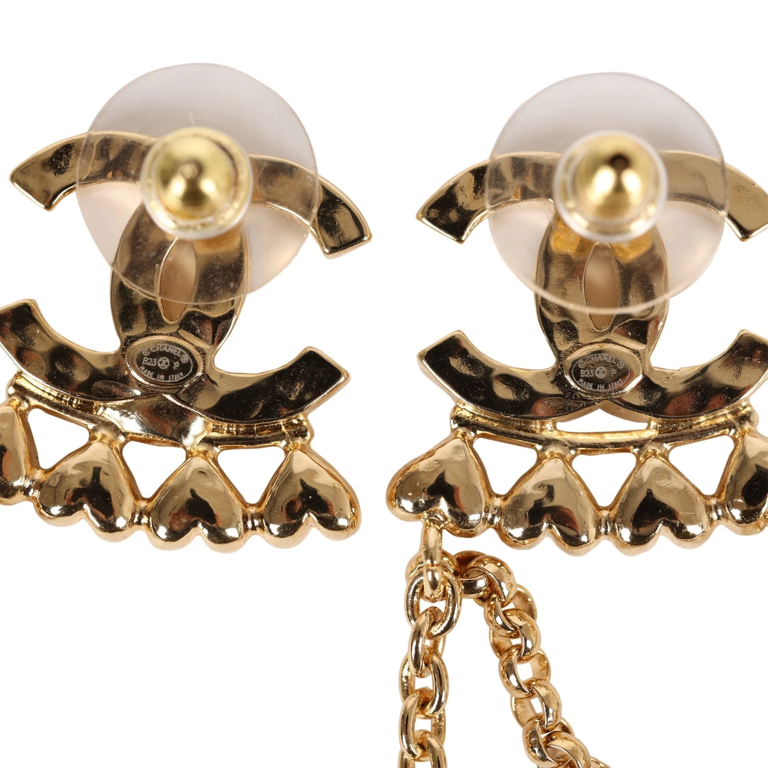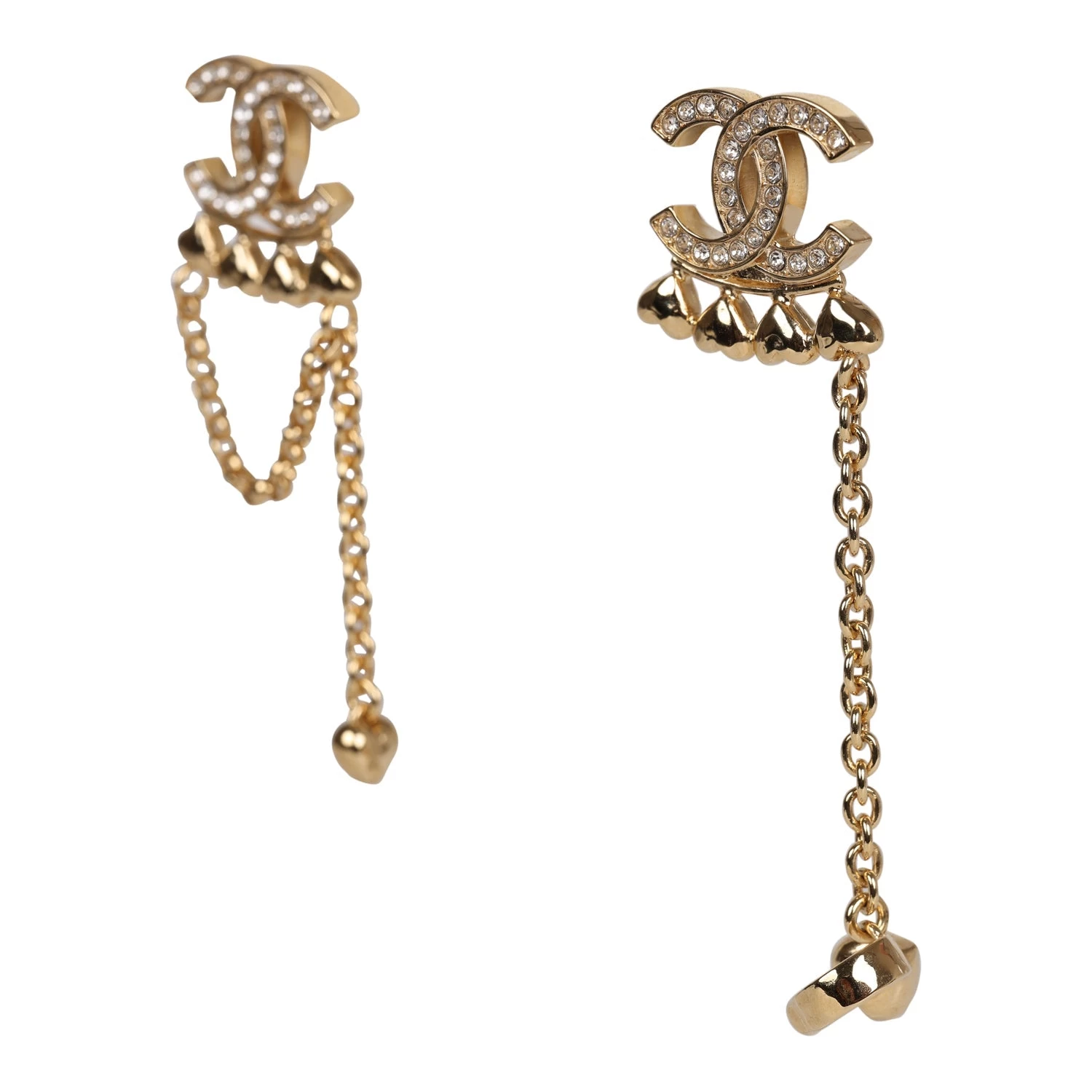 These Chanel CC Dangle Ear Cuff Earrings are in Rhinestone and Gold Metal, both earrings have a rhinestone CC sitting atop a row of upside down hearts with a dangling chain.