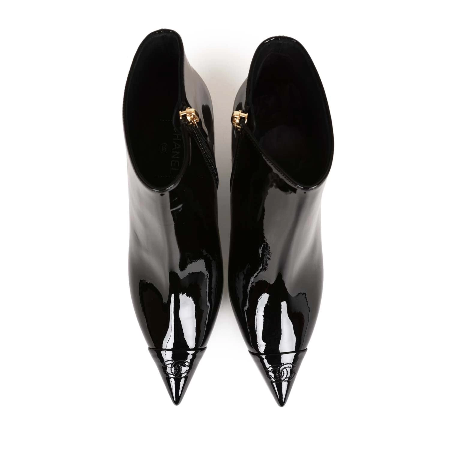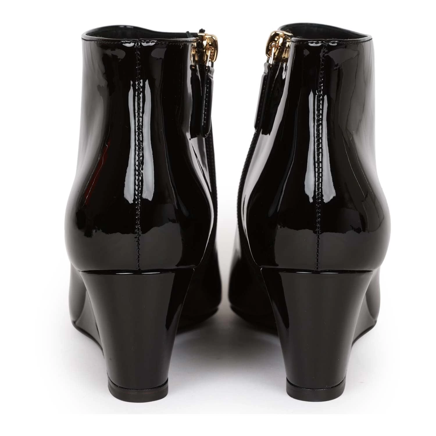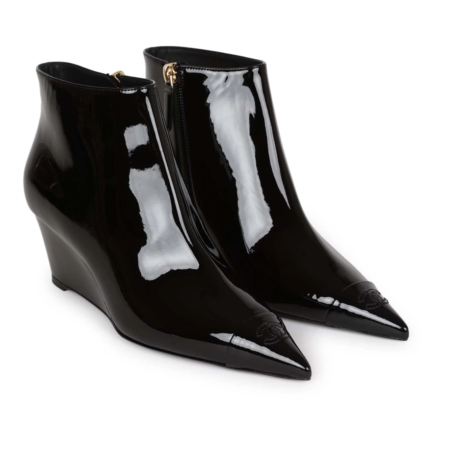 This pair of CC Ankle Boots are in Black patent leather with a wedge heel, CC stitch at the point toes, and a zip up closure.