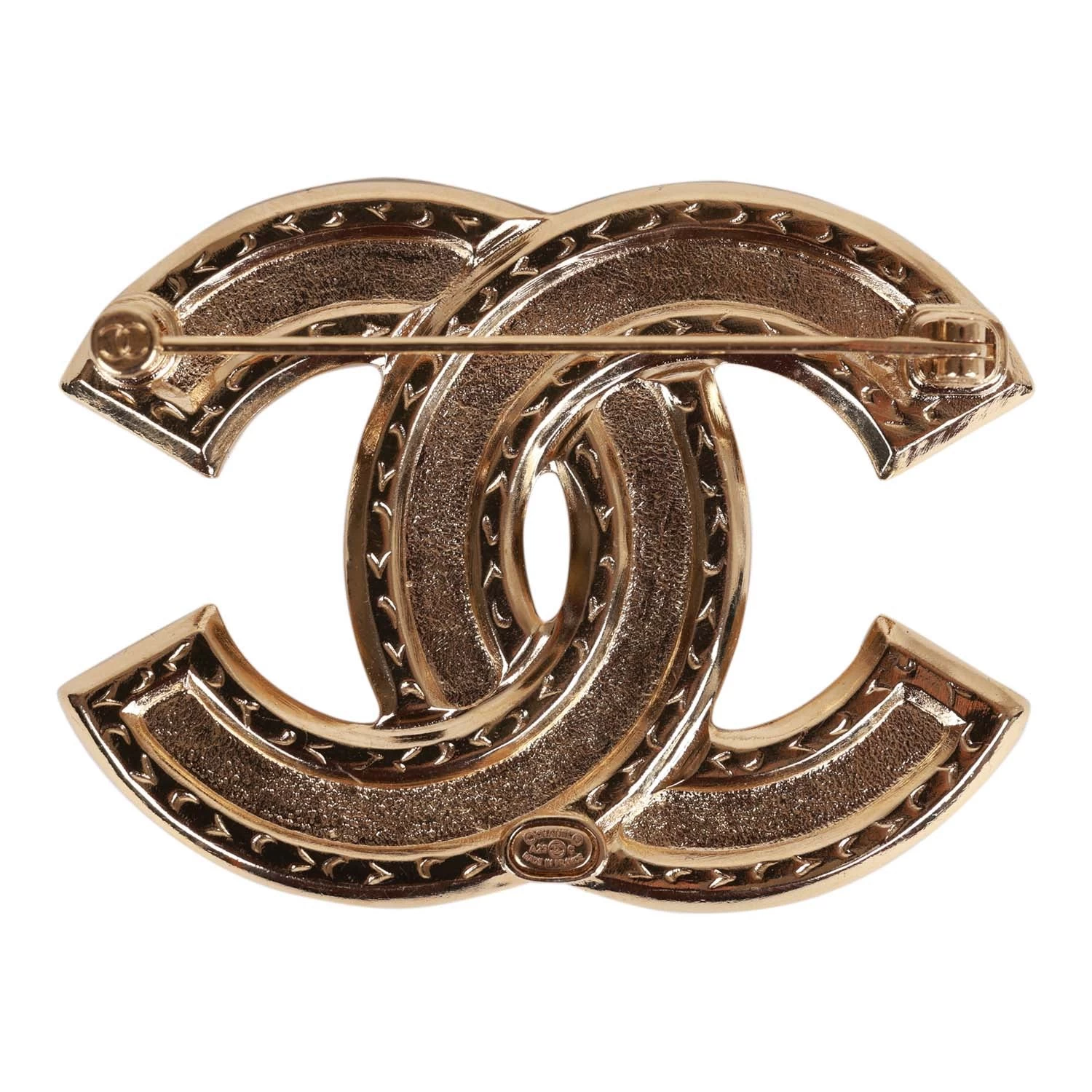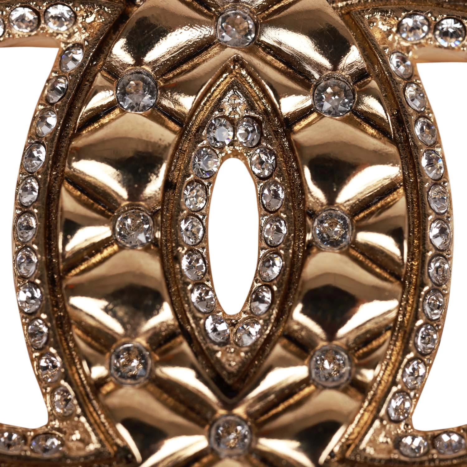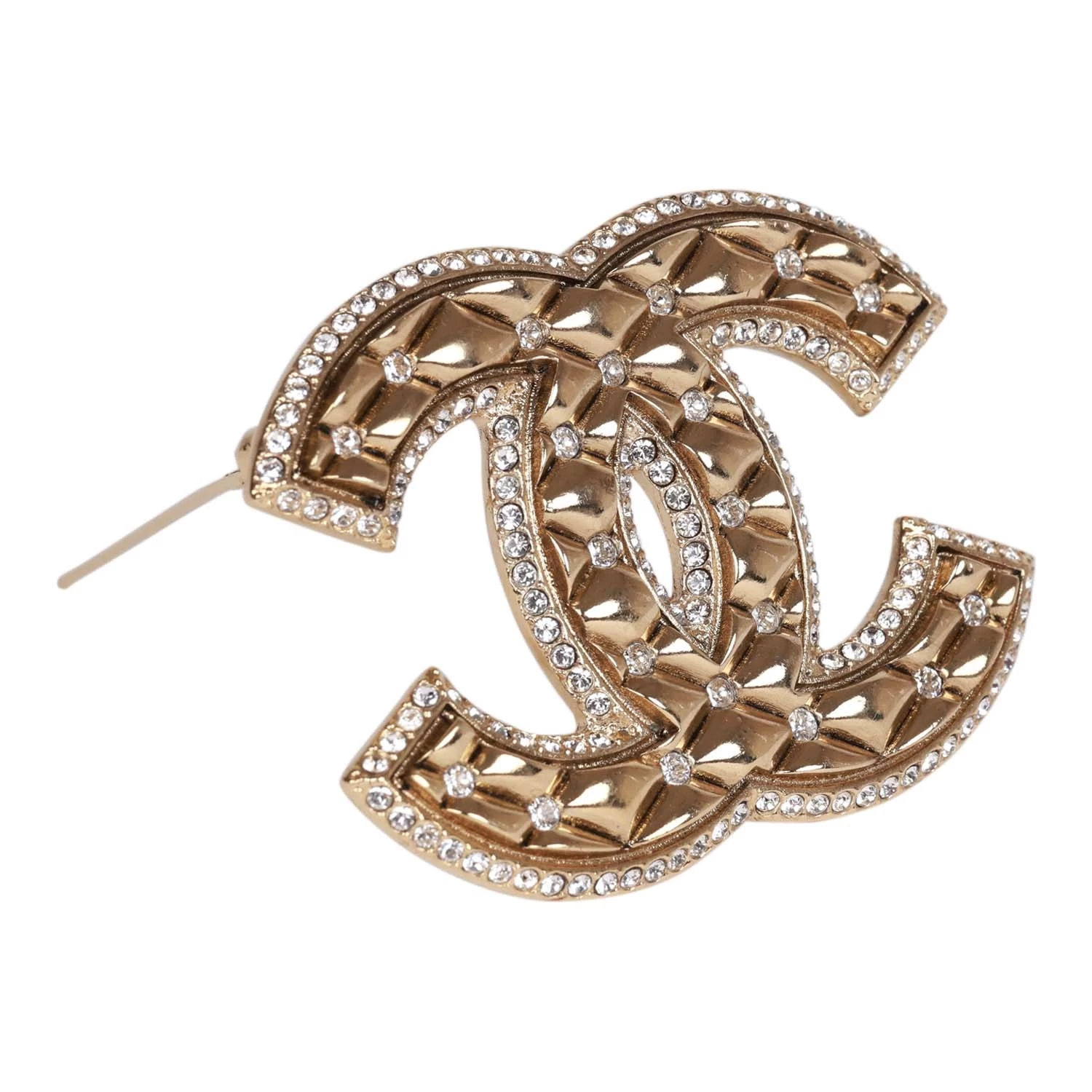 This brooch is in gold tone metal with clear crystals on a quilted CC logo.