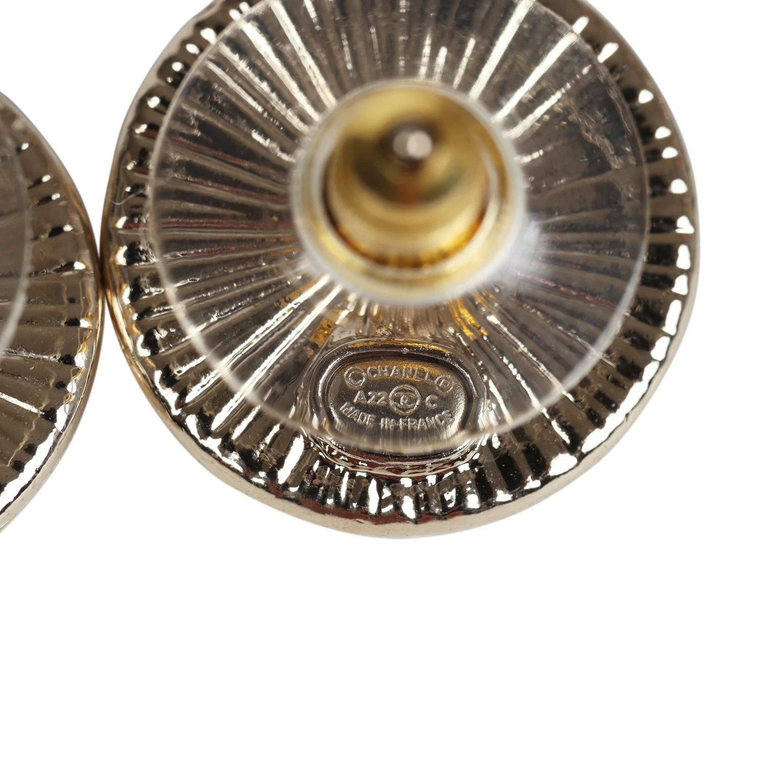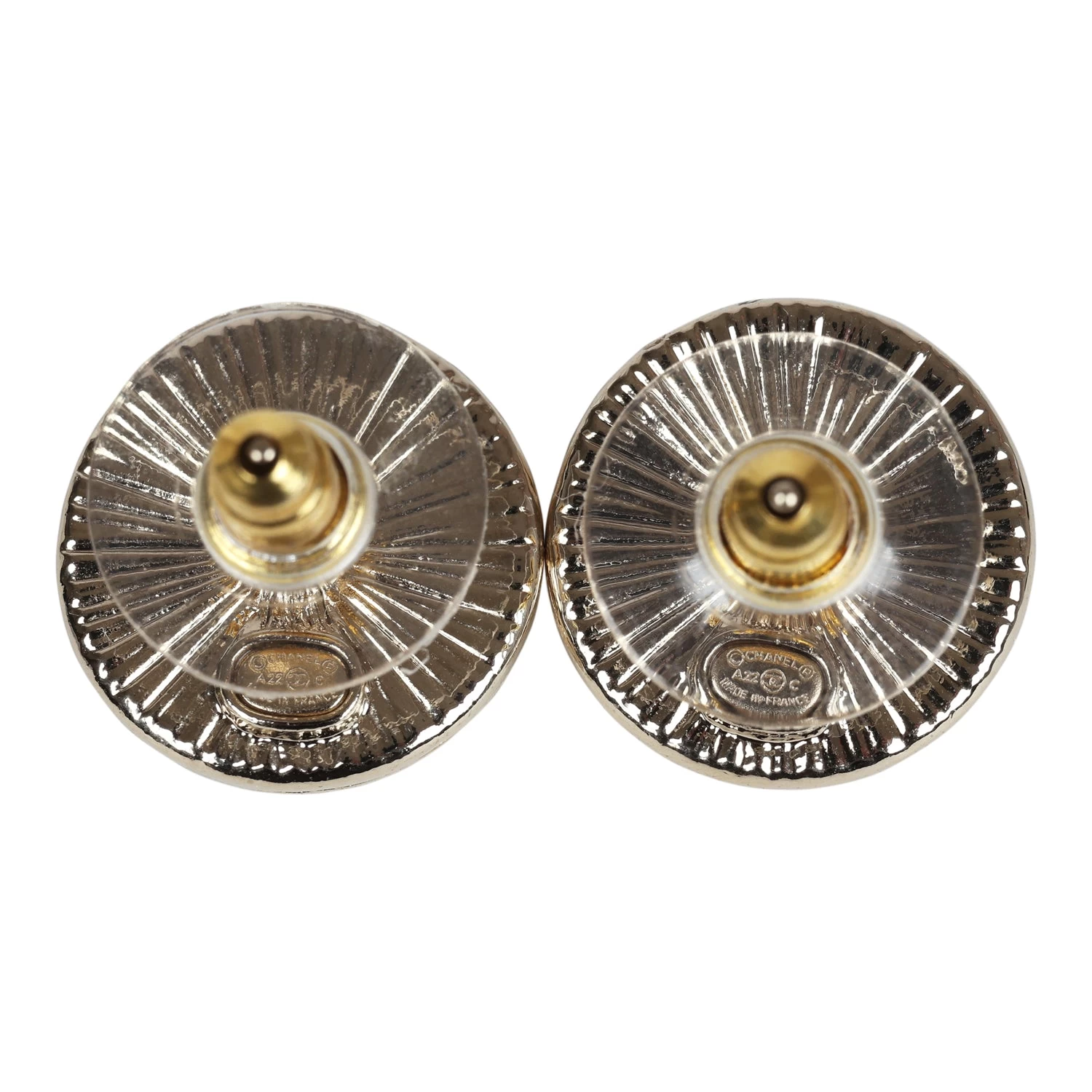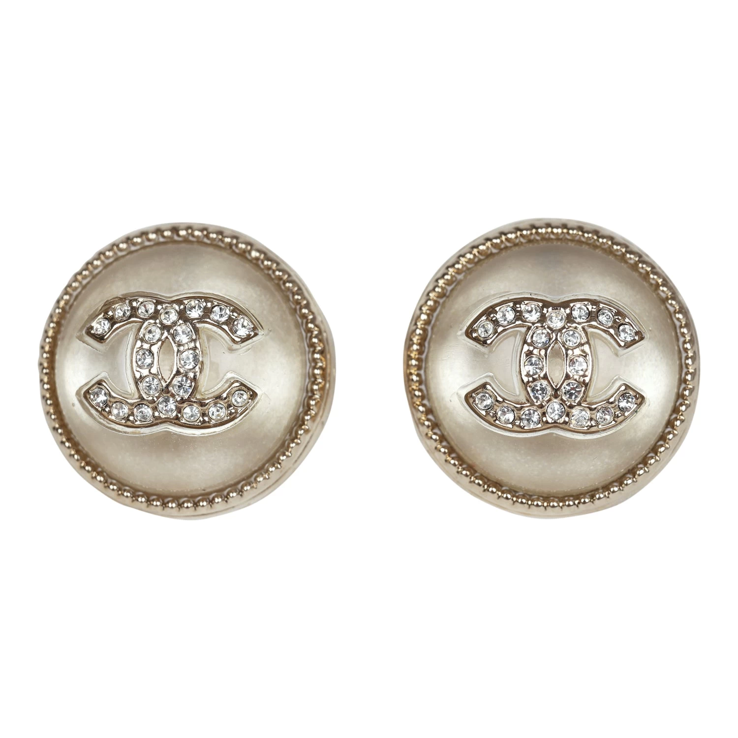 These Chanel Pearl stud earrings feature the signature CC logo in faux crystals with Light Gold hardware. They also have push back posts.