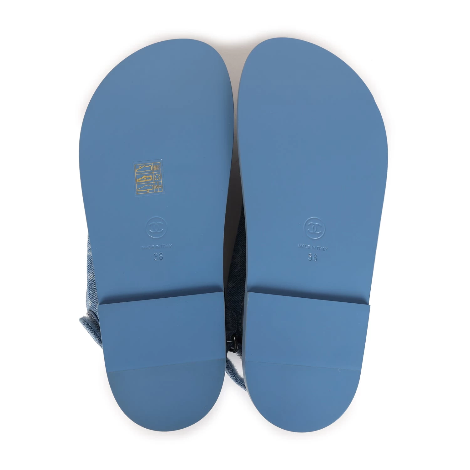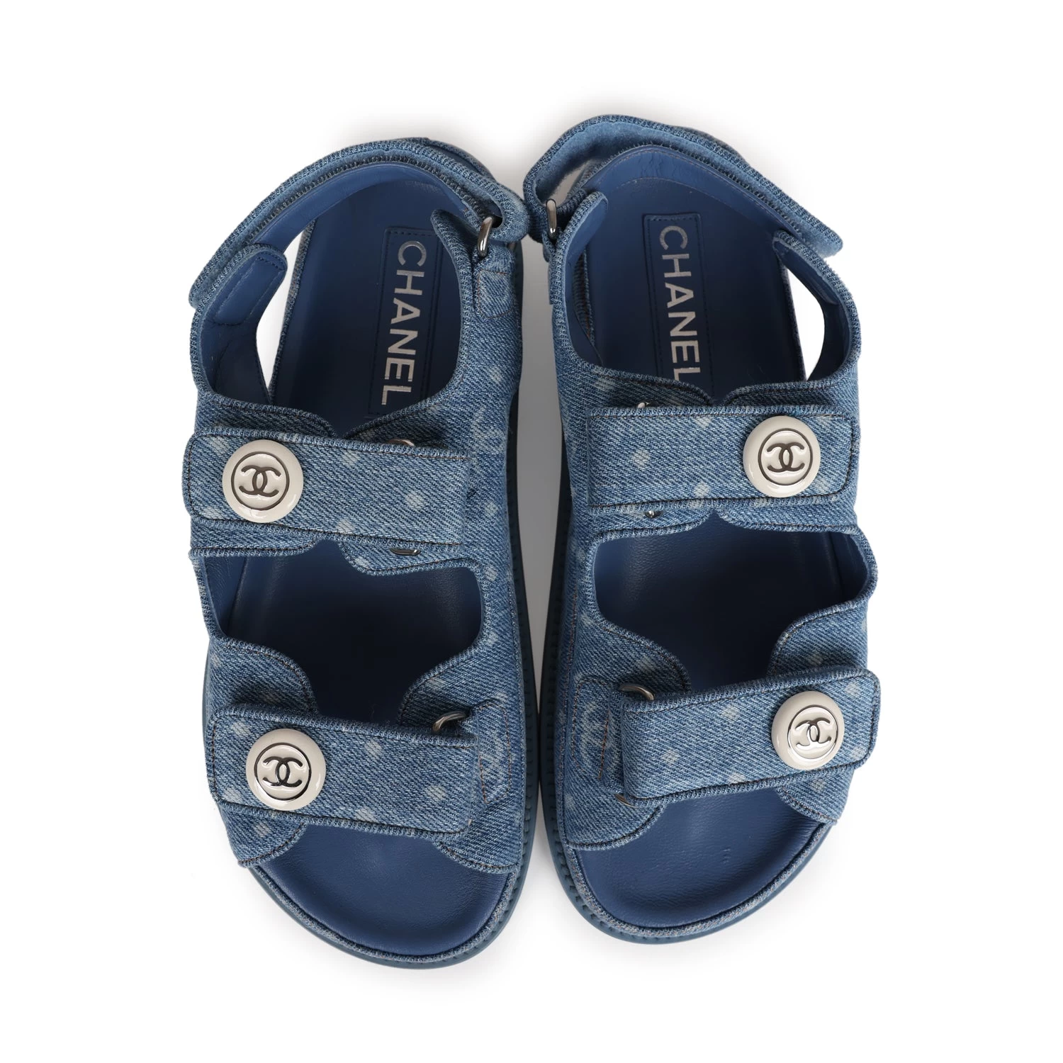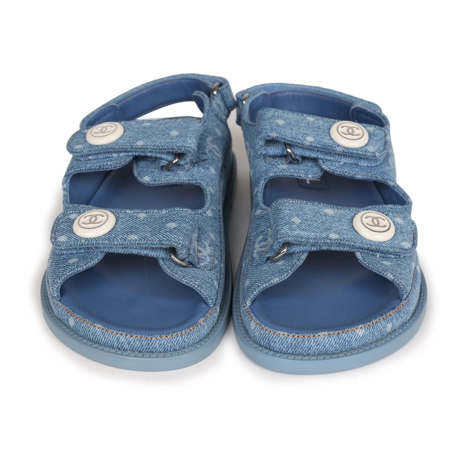 These Chanel Dad Sandals are in Blue Monogram Denim with two adjustable straps across the foot, white and silver CC enamel buttons, contrast stitching, adjustable closure strap for back of foot, silver hardware and rubber sole.