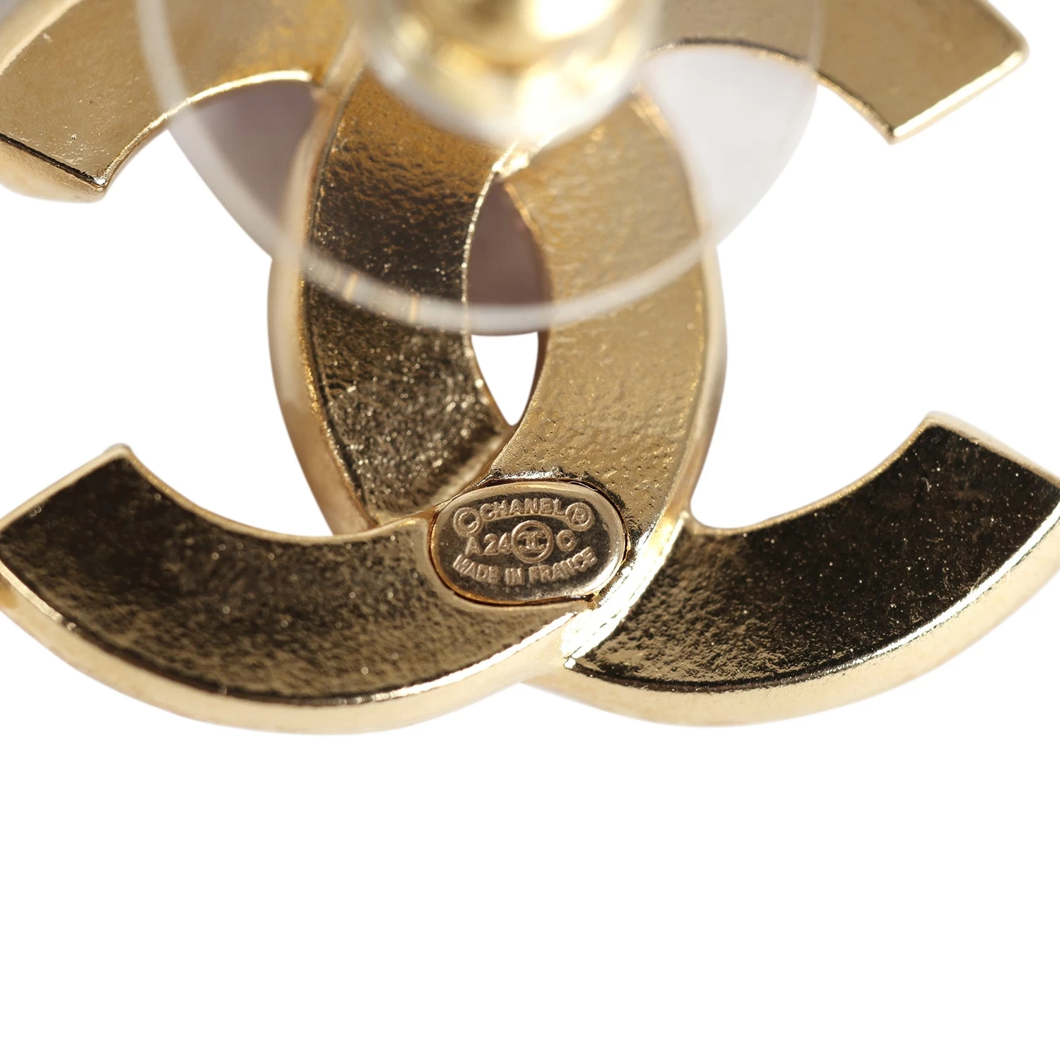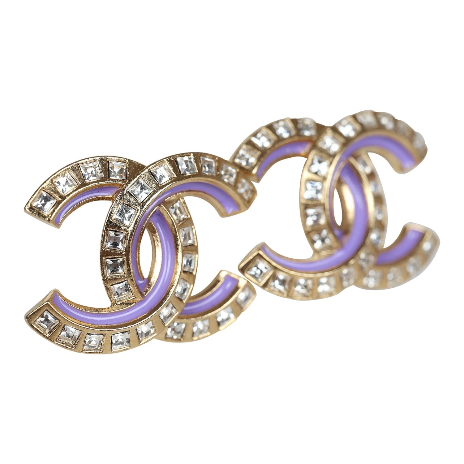 These 24C CC logo earrings are in gold tone metal with crystal stars and purple enamel.