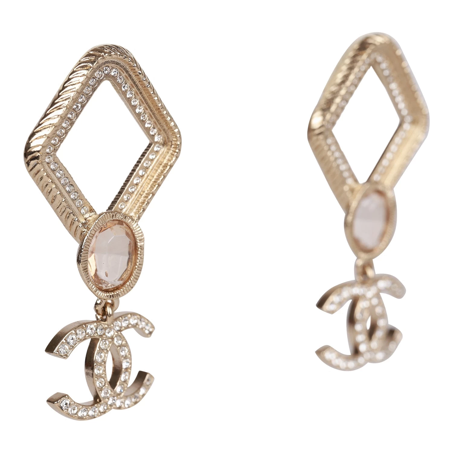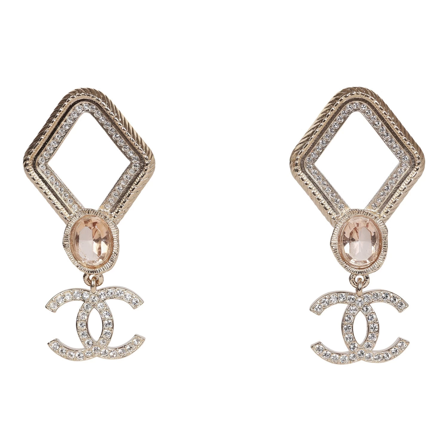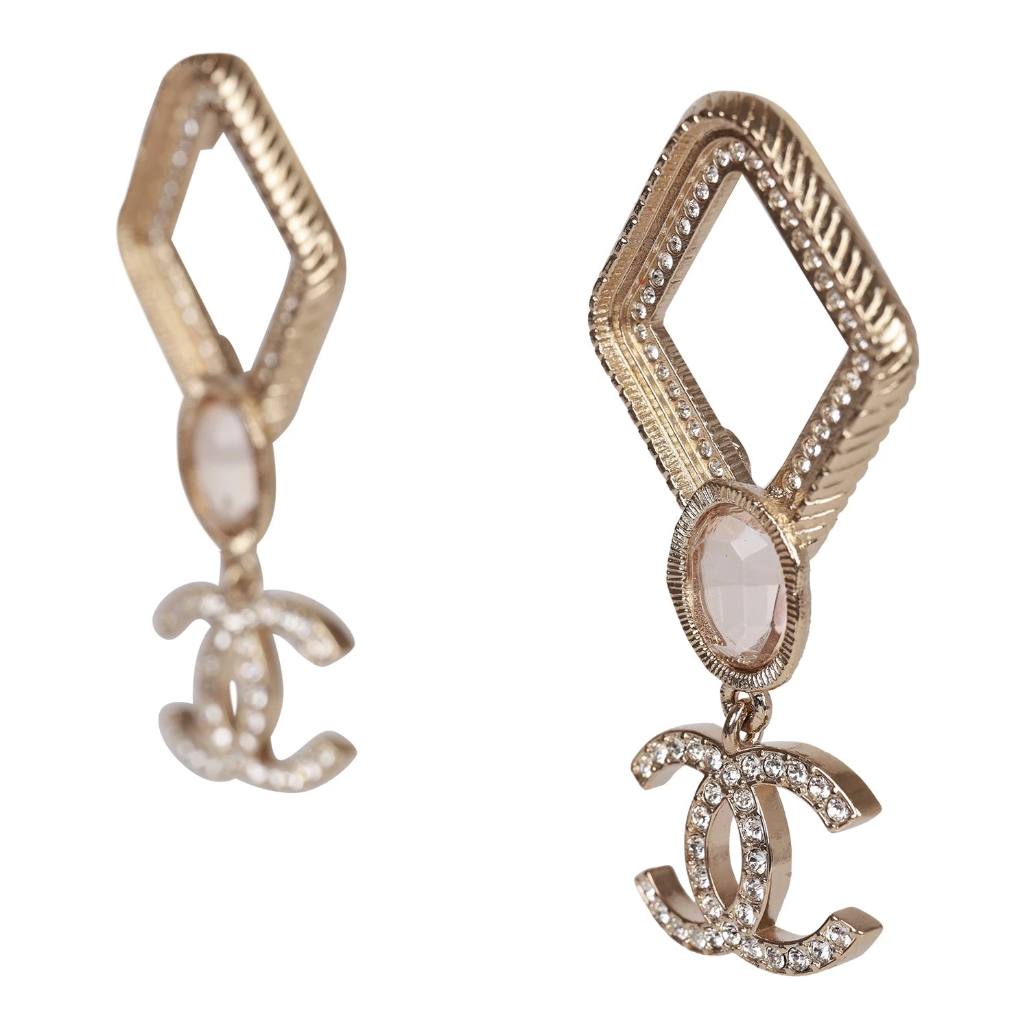 These 21A Chanel Rhombus earrings are in gold metal, featuring pink stones with dangling crystal embellished CC logos.