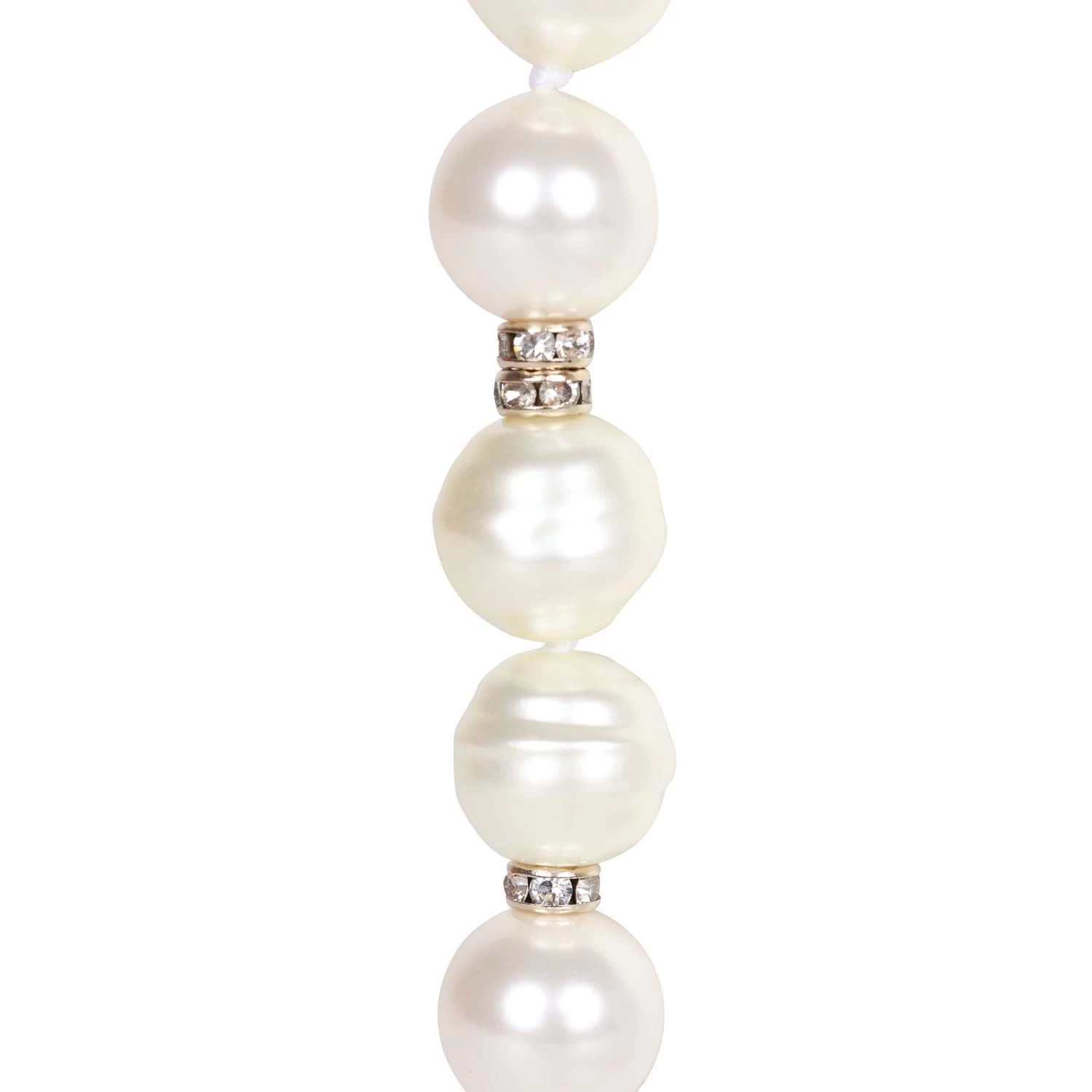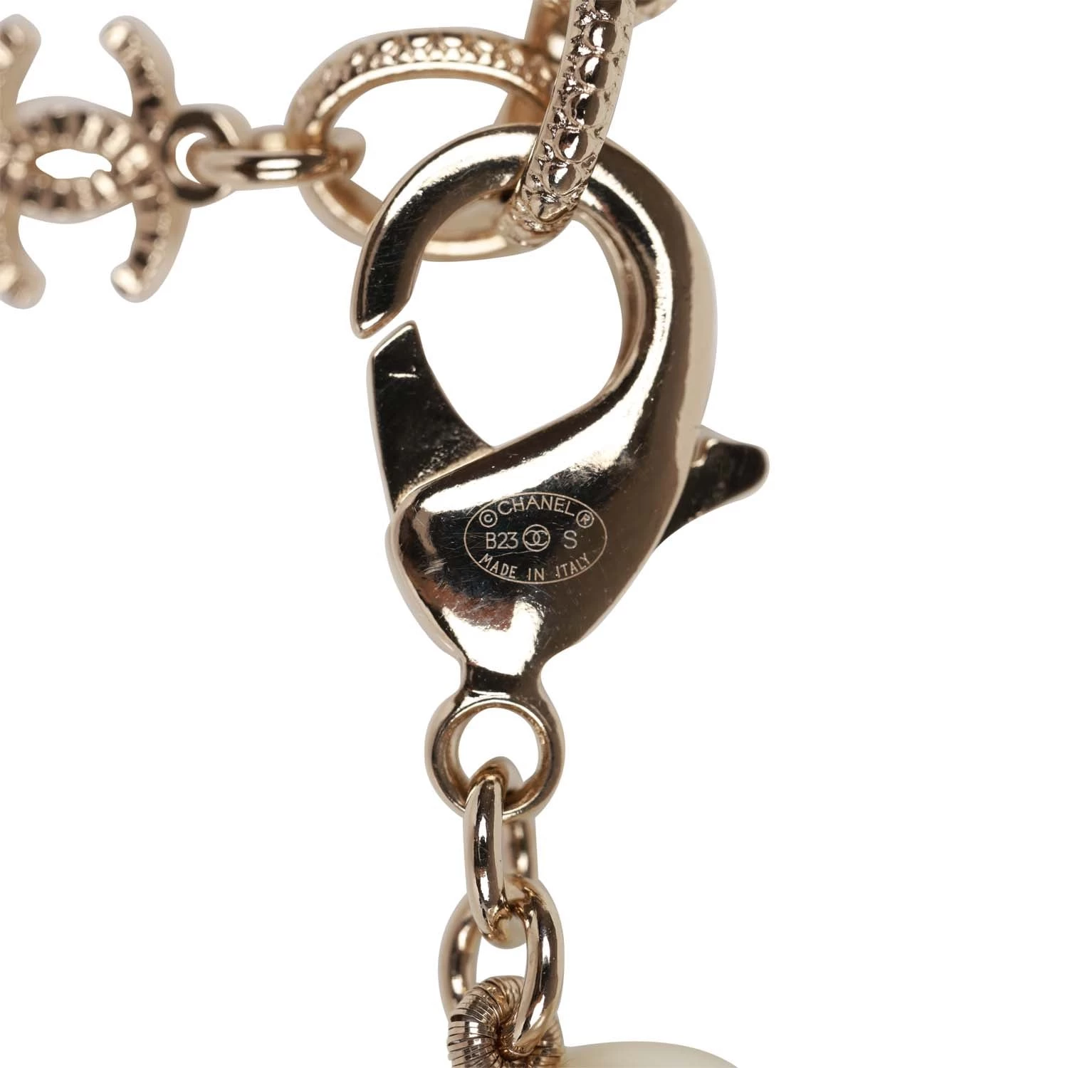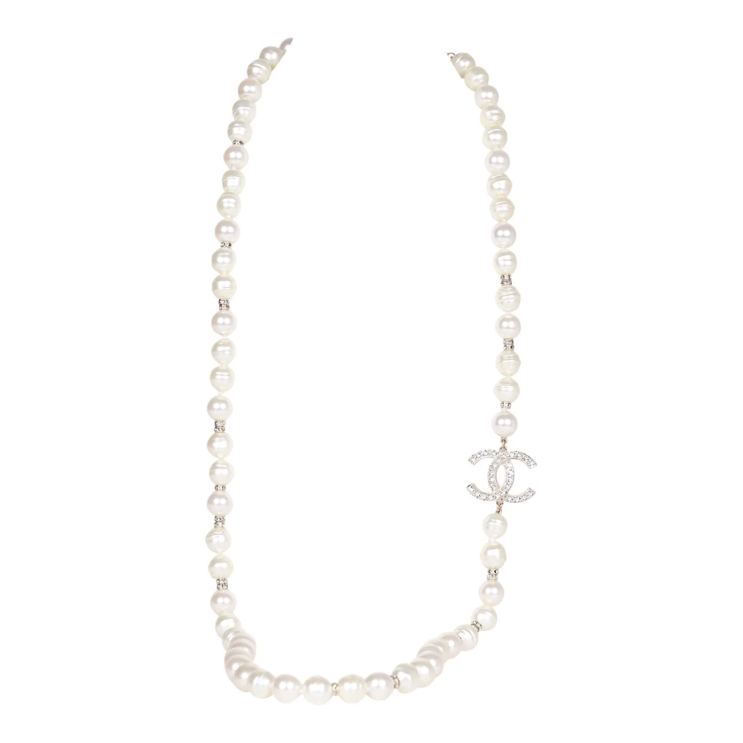 This Necklace features an offset signature CC faux crystal logo charm with large faux pearls, beads, and gold lobster clasp.