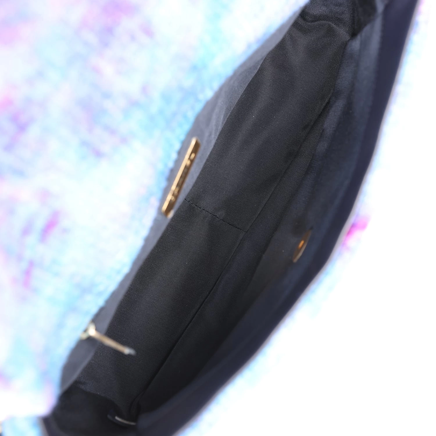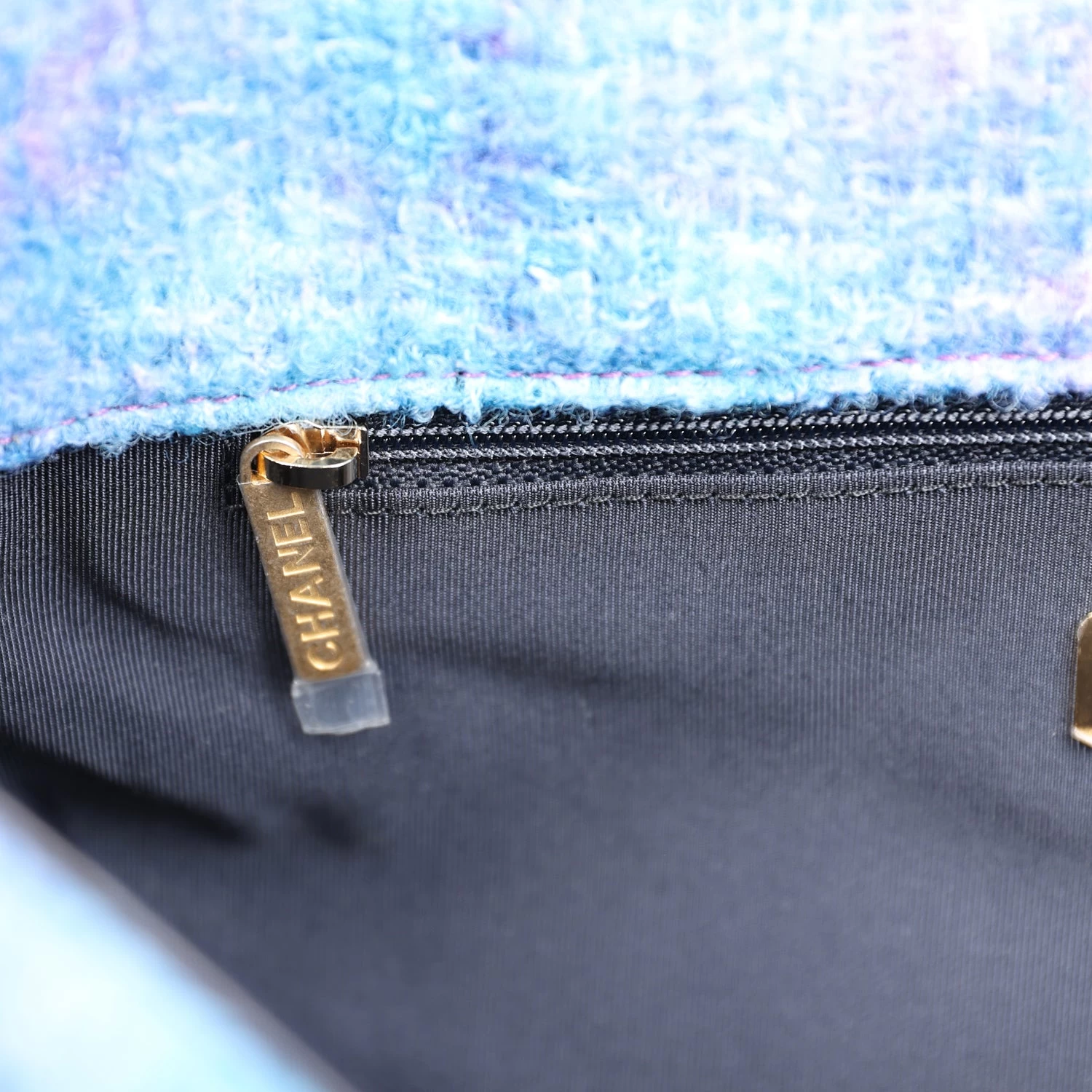 This Large 19 Flap bag is in Purple, Blue, and Black wool tweed with mixed metal hardware and has the signature diamond quilting, signature CC interlocking closure, exterior back pocket, chain top handle, and long mixed metal and black leather chain.