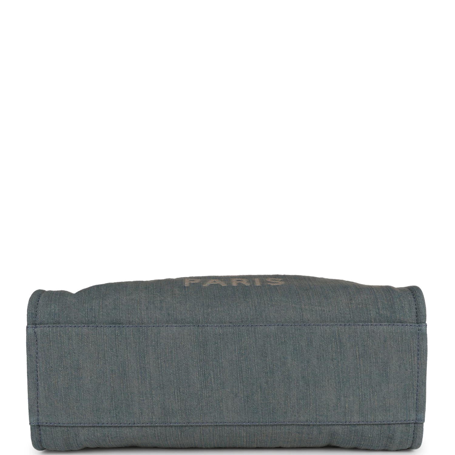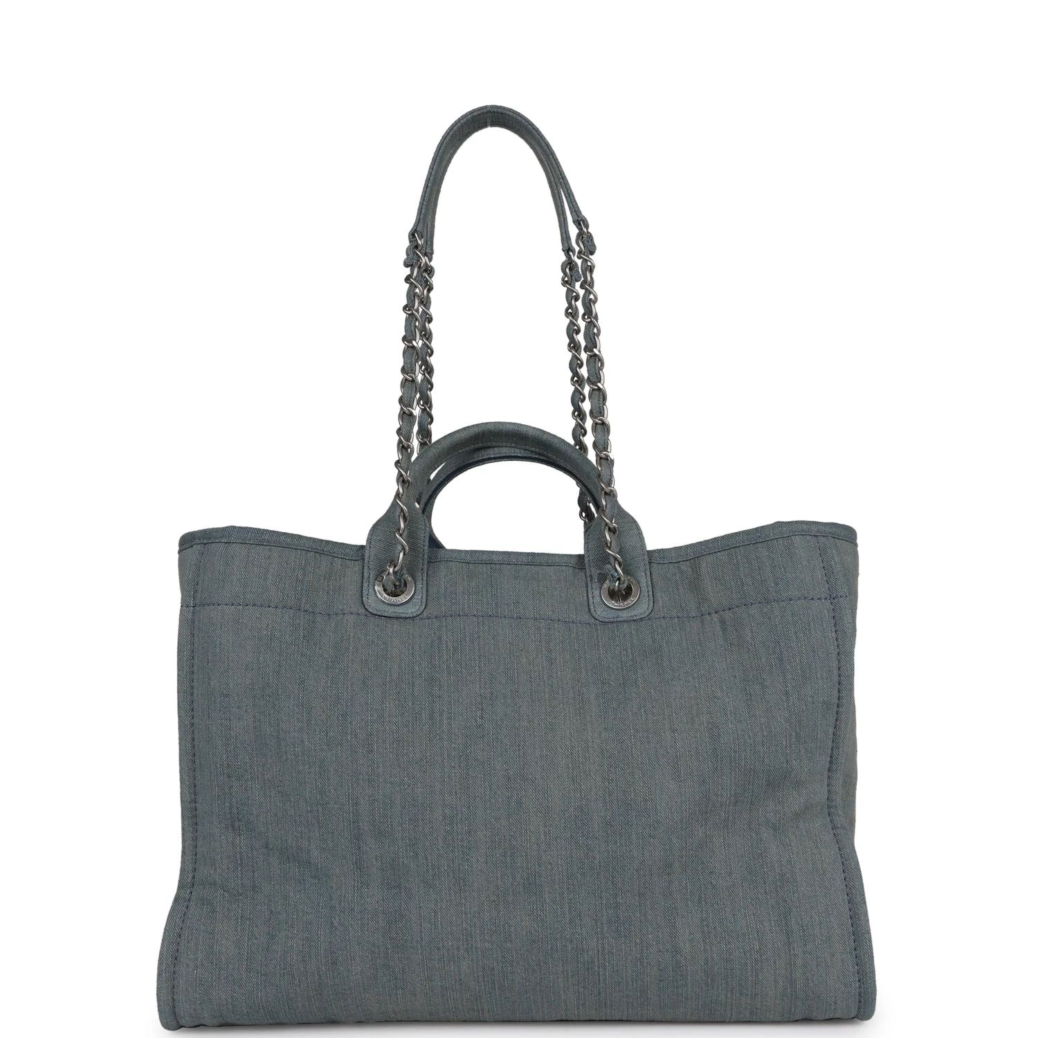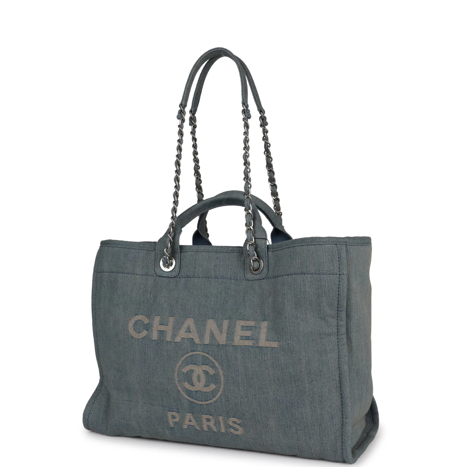 This Large Deauville Shopping bag is in Distressed Blue Denim with silver hardware, featuring a large CC signature and Chanel logo on the front, removable pouch, two rolled top handles, and two interwoven light gold chain link and pink leather shoulder straps.