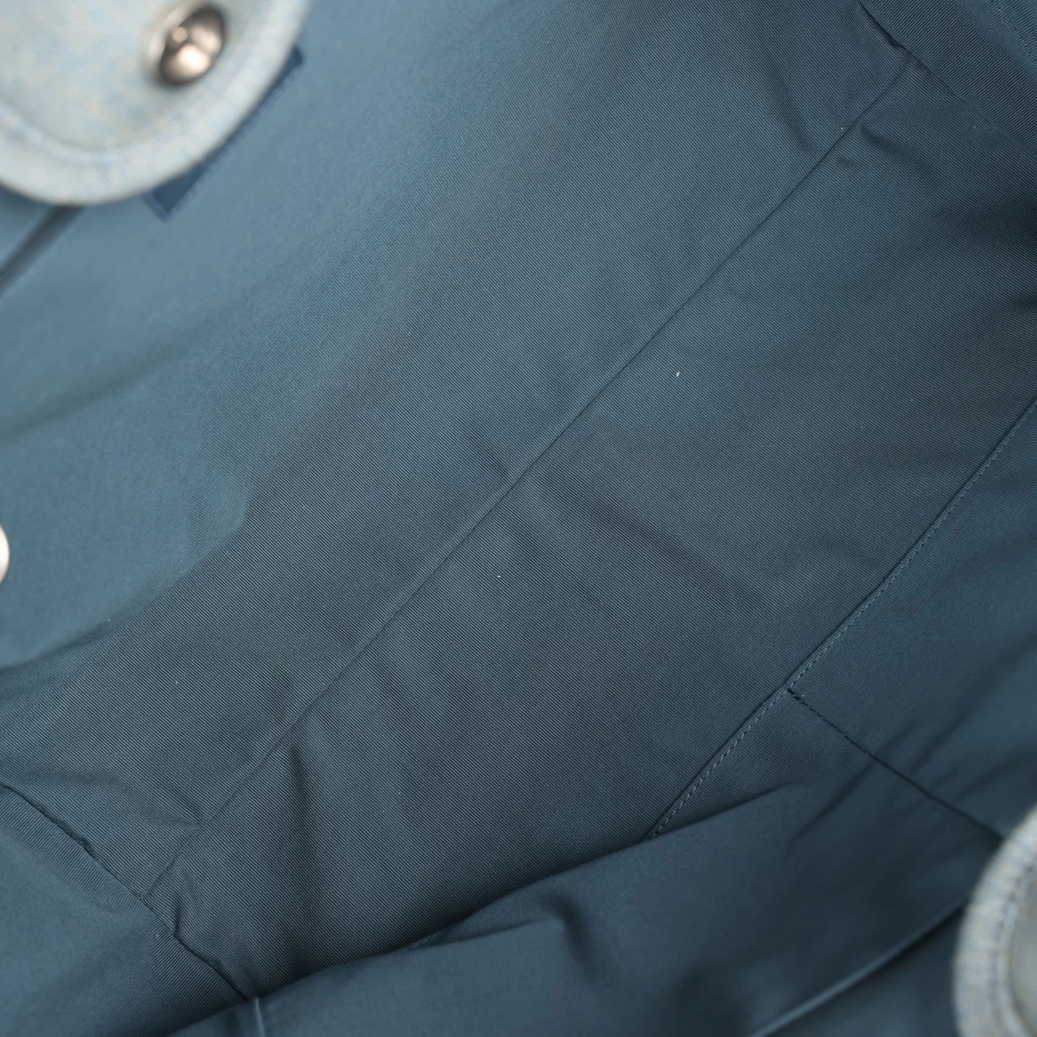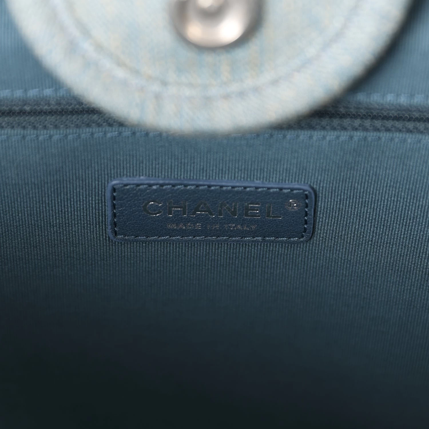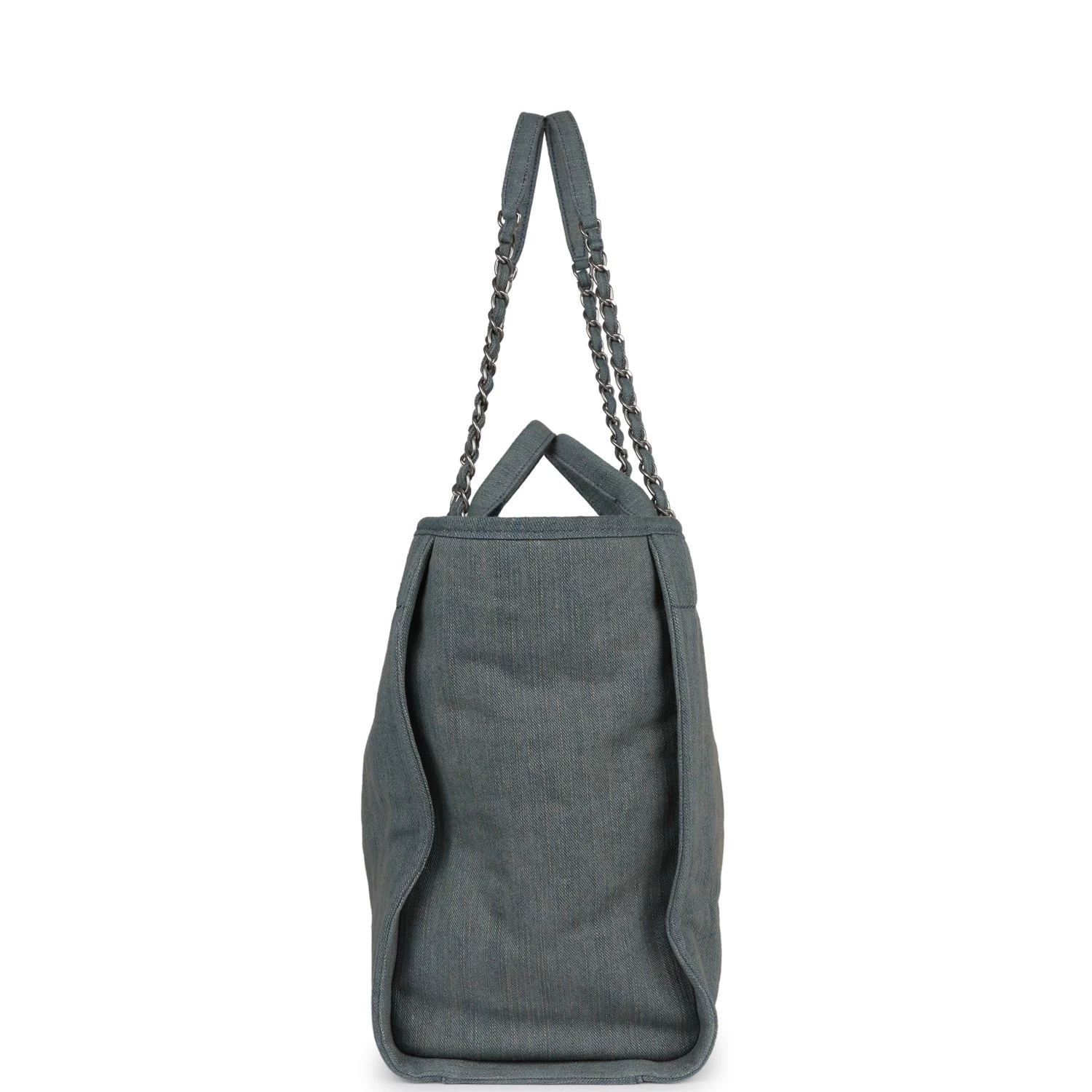 This Large Deauville Shopping bag is in Distressed Blue Denim with silver hardware, featuring a large CC signature and Chanel logo on the front, removable pouch, two rolled top handles, and two interwoven light gold chain link and pink leather shoulder straps.