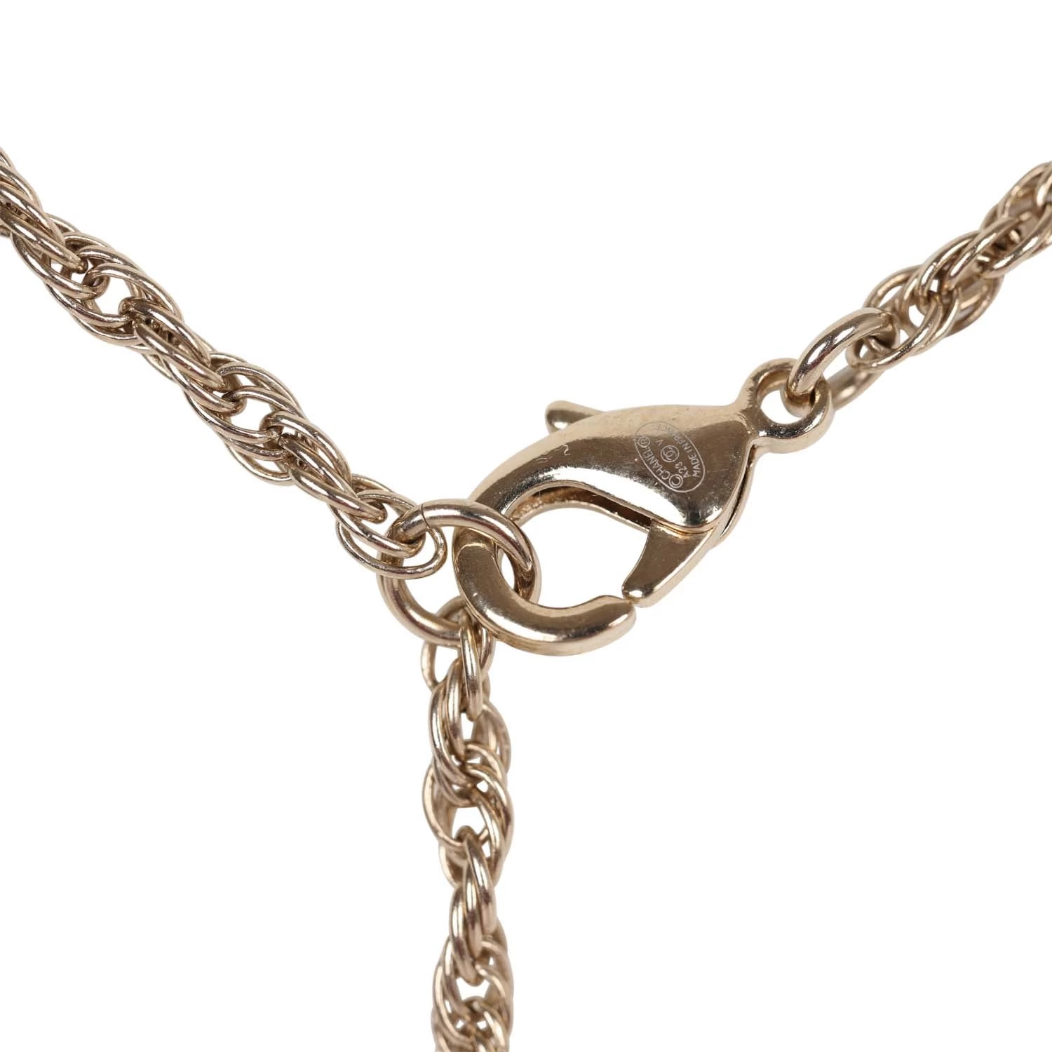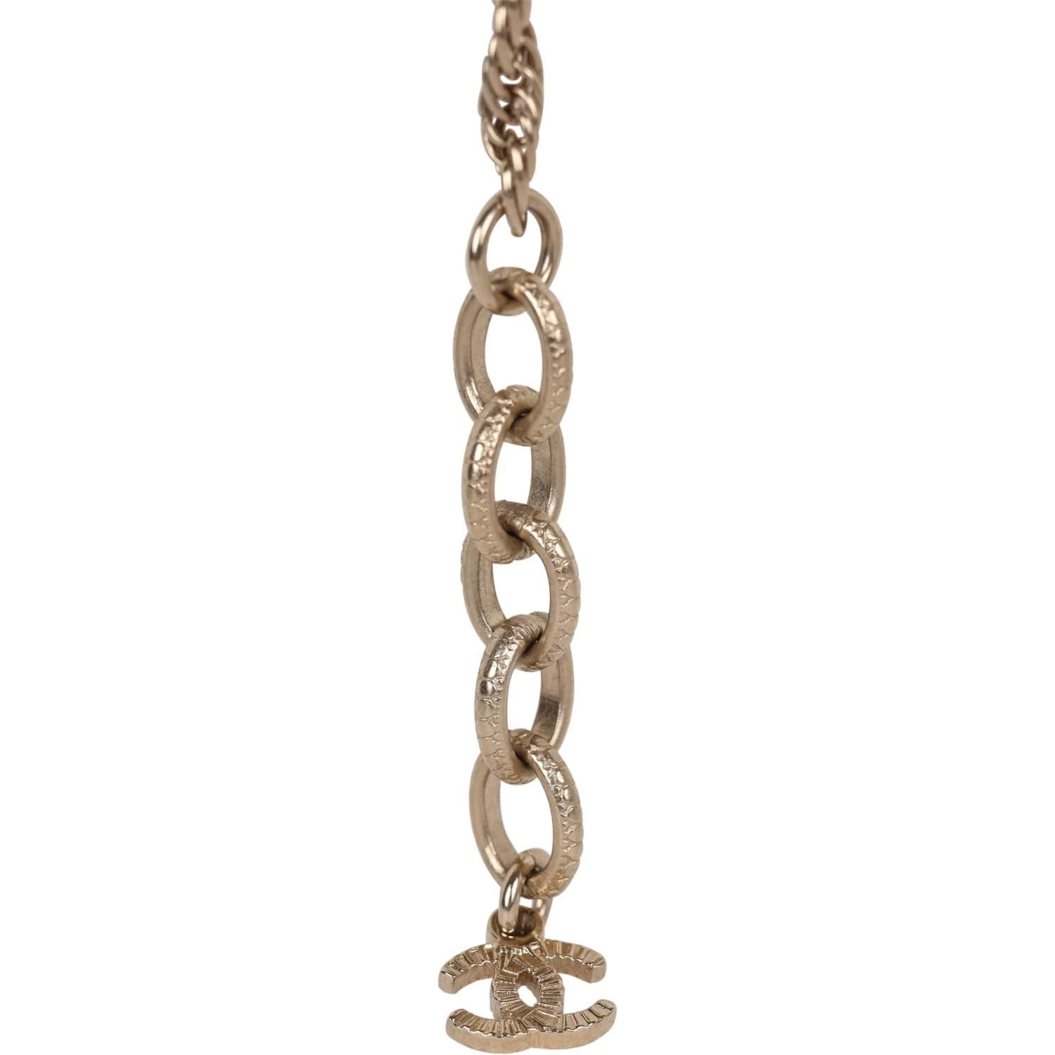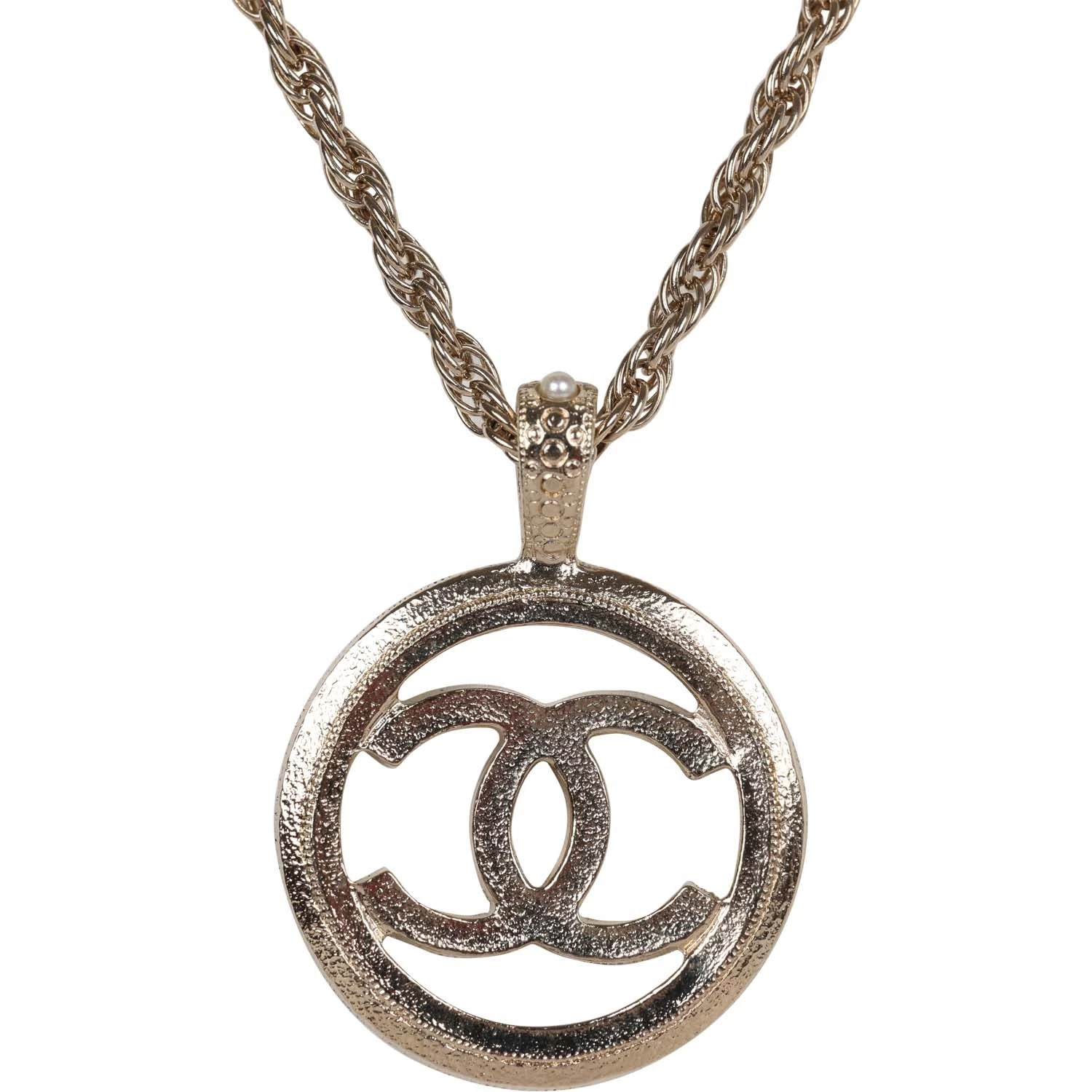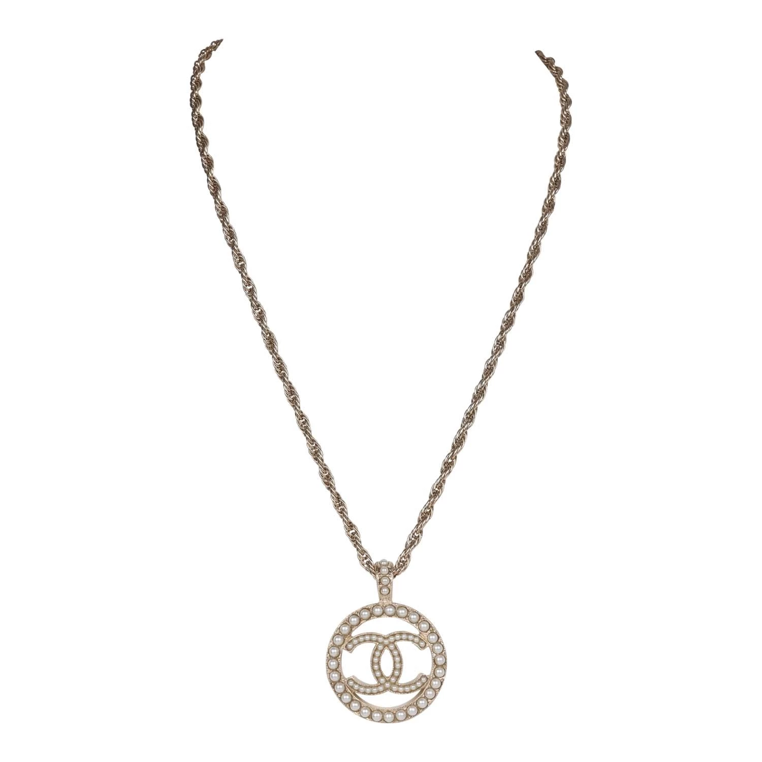This Chanel Large Logo Pendant is in pearl and light gold metal with an encrusted CC logo, and braided chain