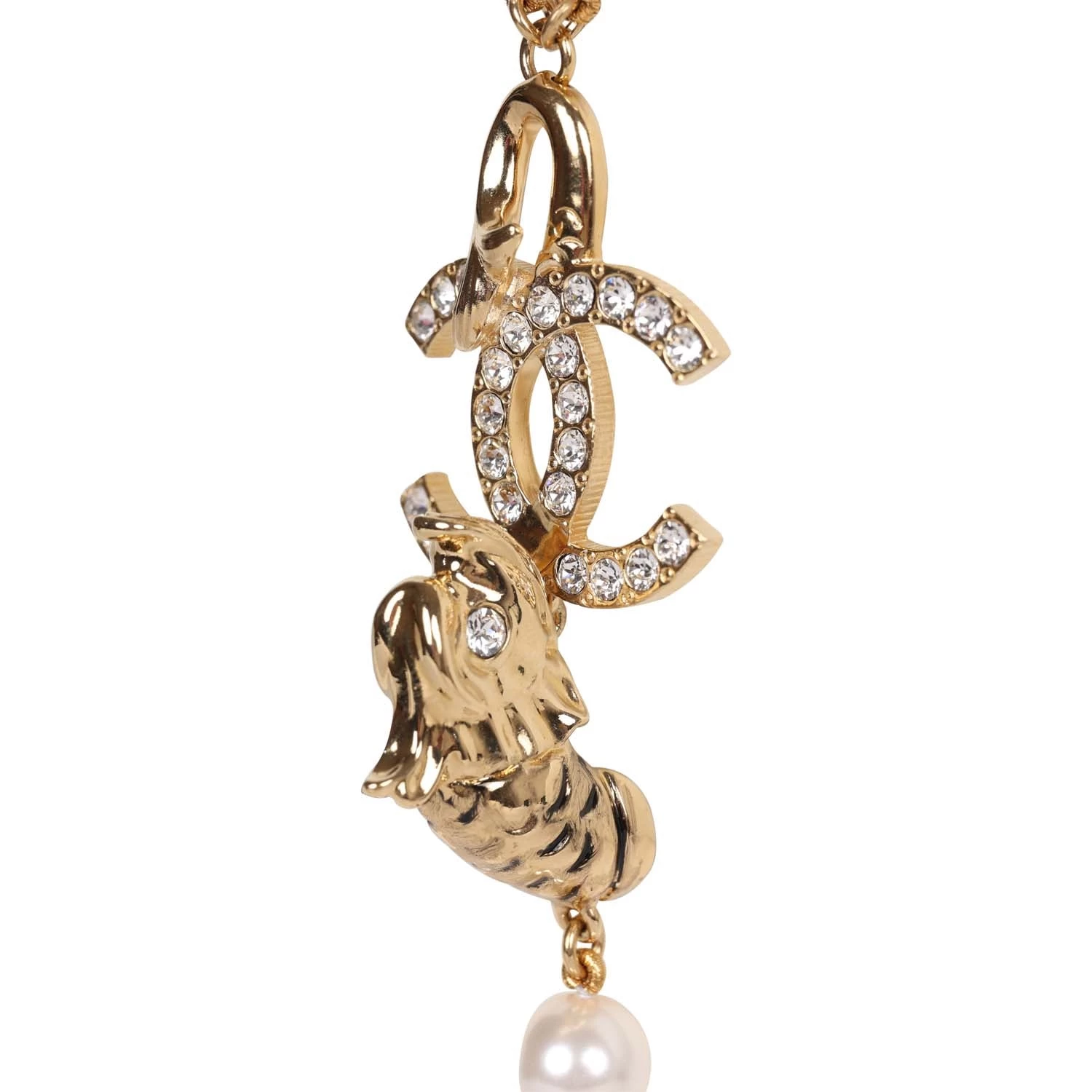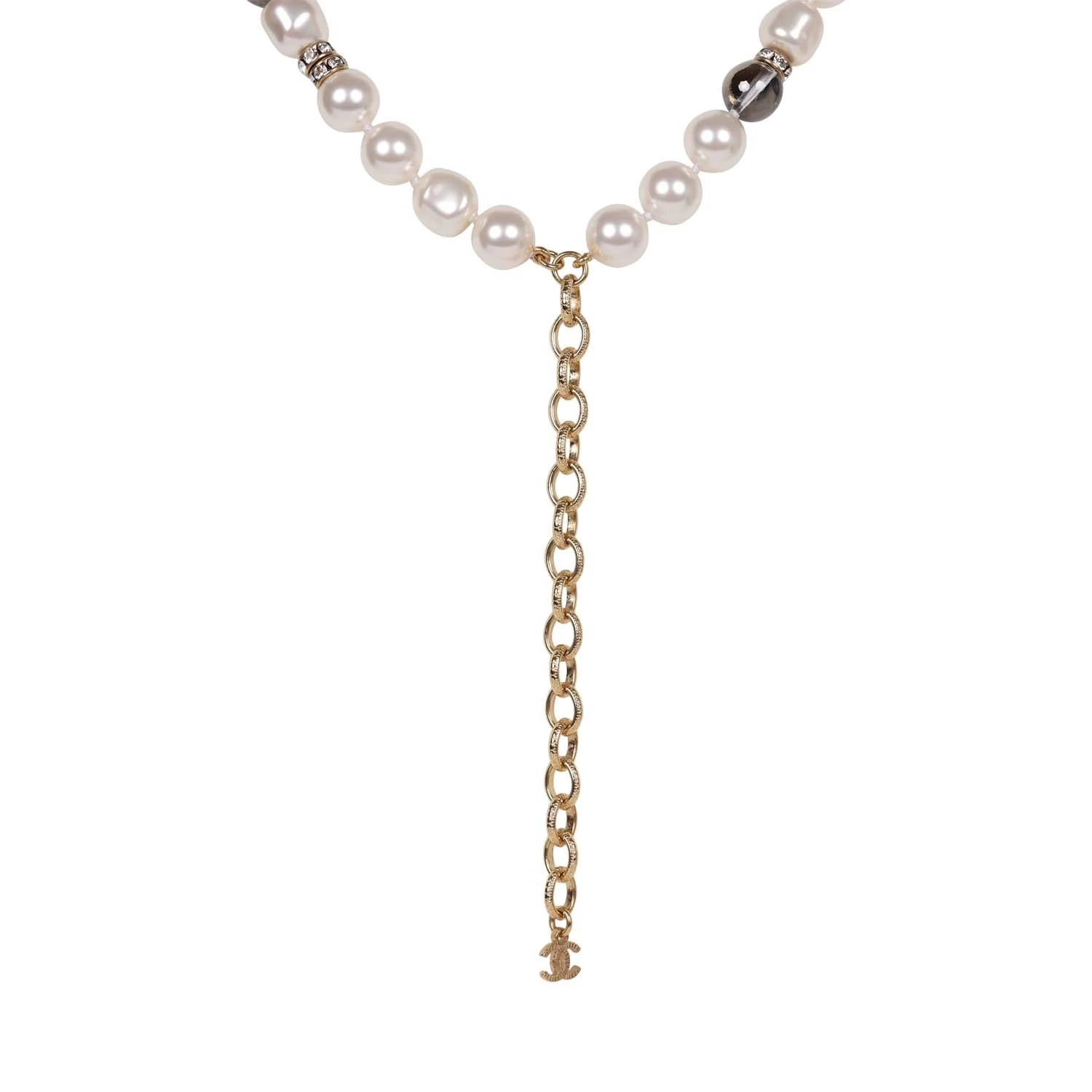 This Chanel Pearl necklace is in grey gripoix and strass gold Metal with a fish head CC logo.