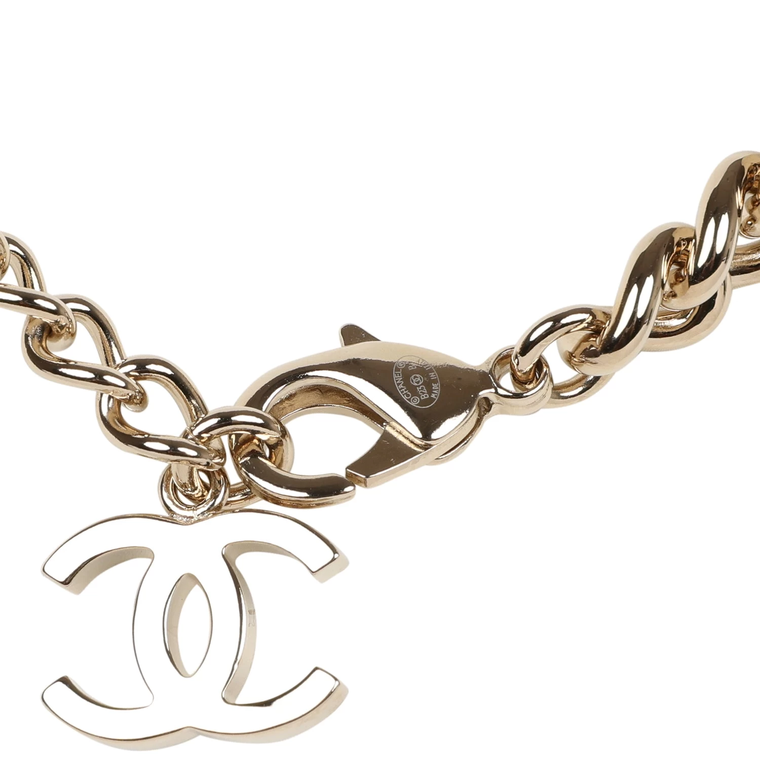This Chanel necklace is in light gold tone metal with a rhinestone filled star, imitation wax seal stamped CC pendant, and a lobster claw clasp closure.