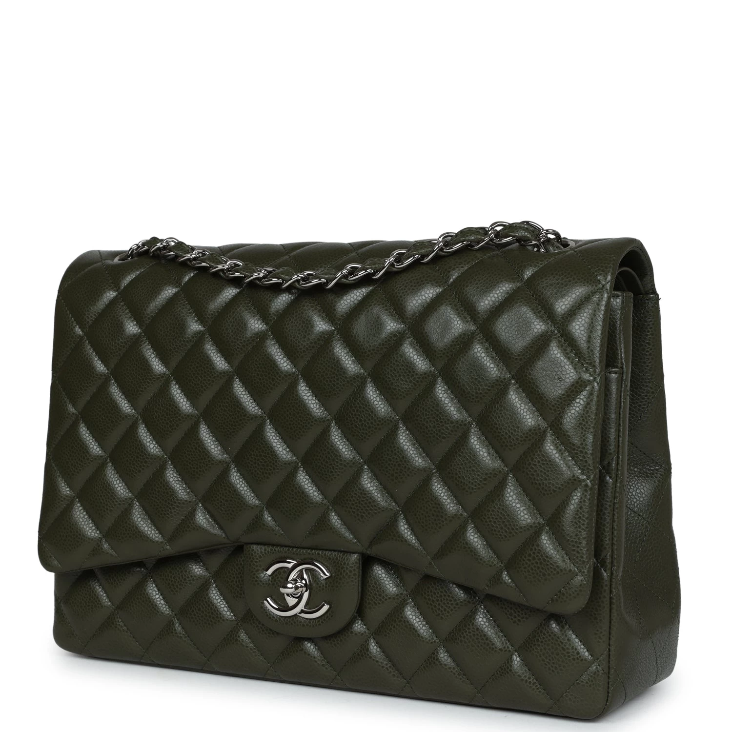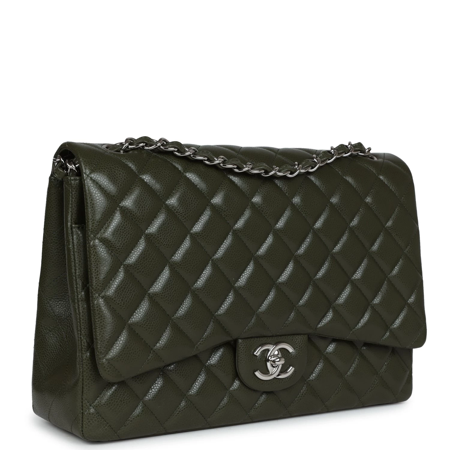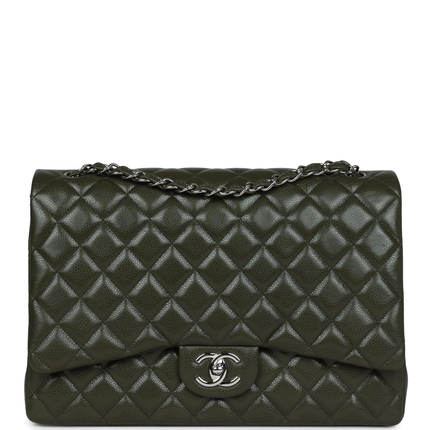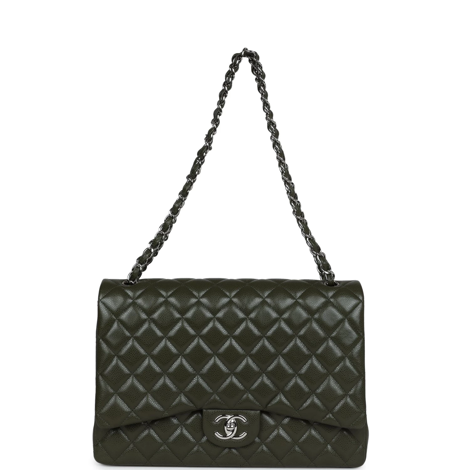 This Maxi Classic Double Flap bag is in olive green caviar leather with silver hardware and features a front flap with signature CC turnlock closure, half moon back pocket, and adjustable interwoven silver tone chain link and olive green leather shoulder strap.