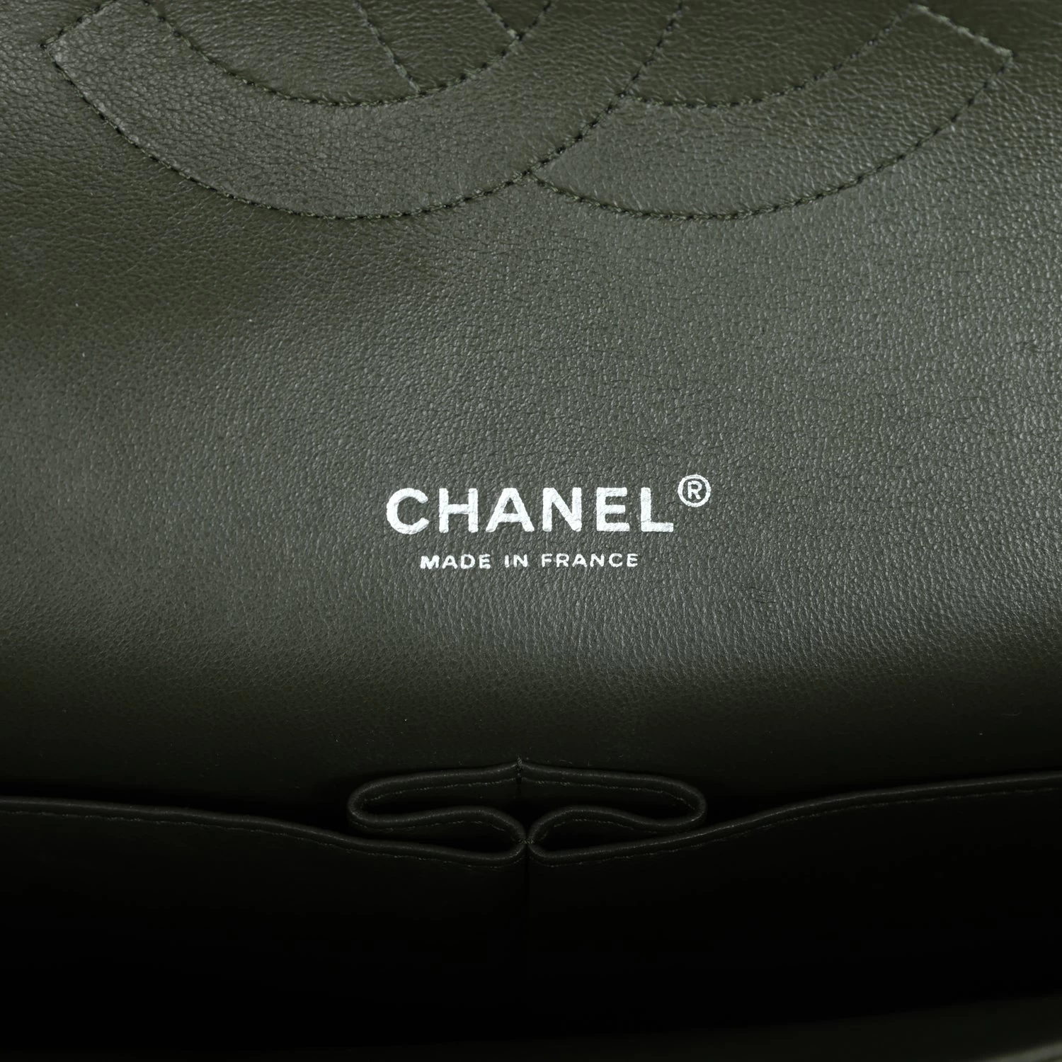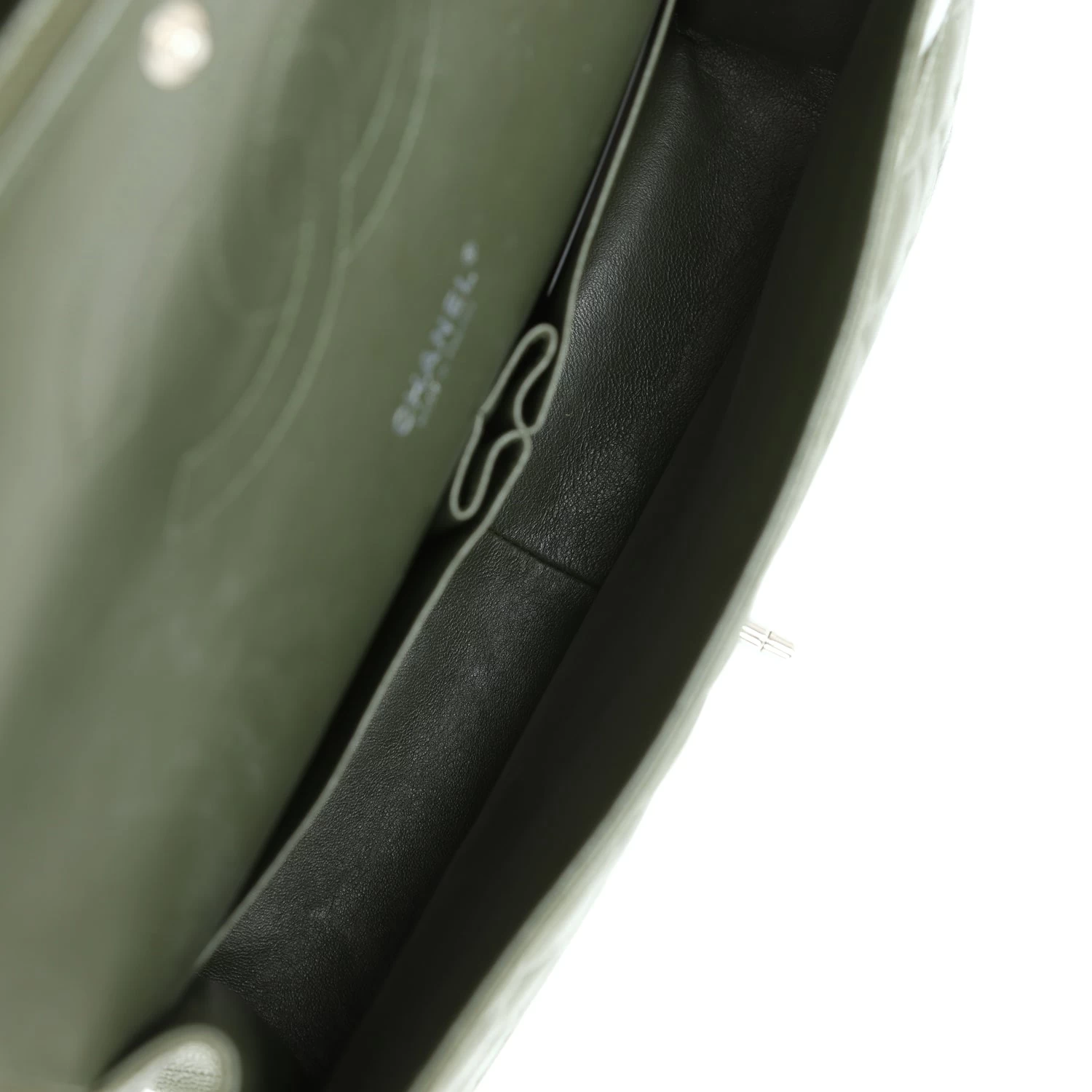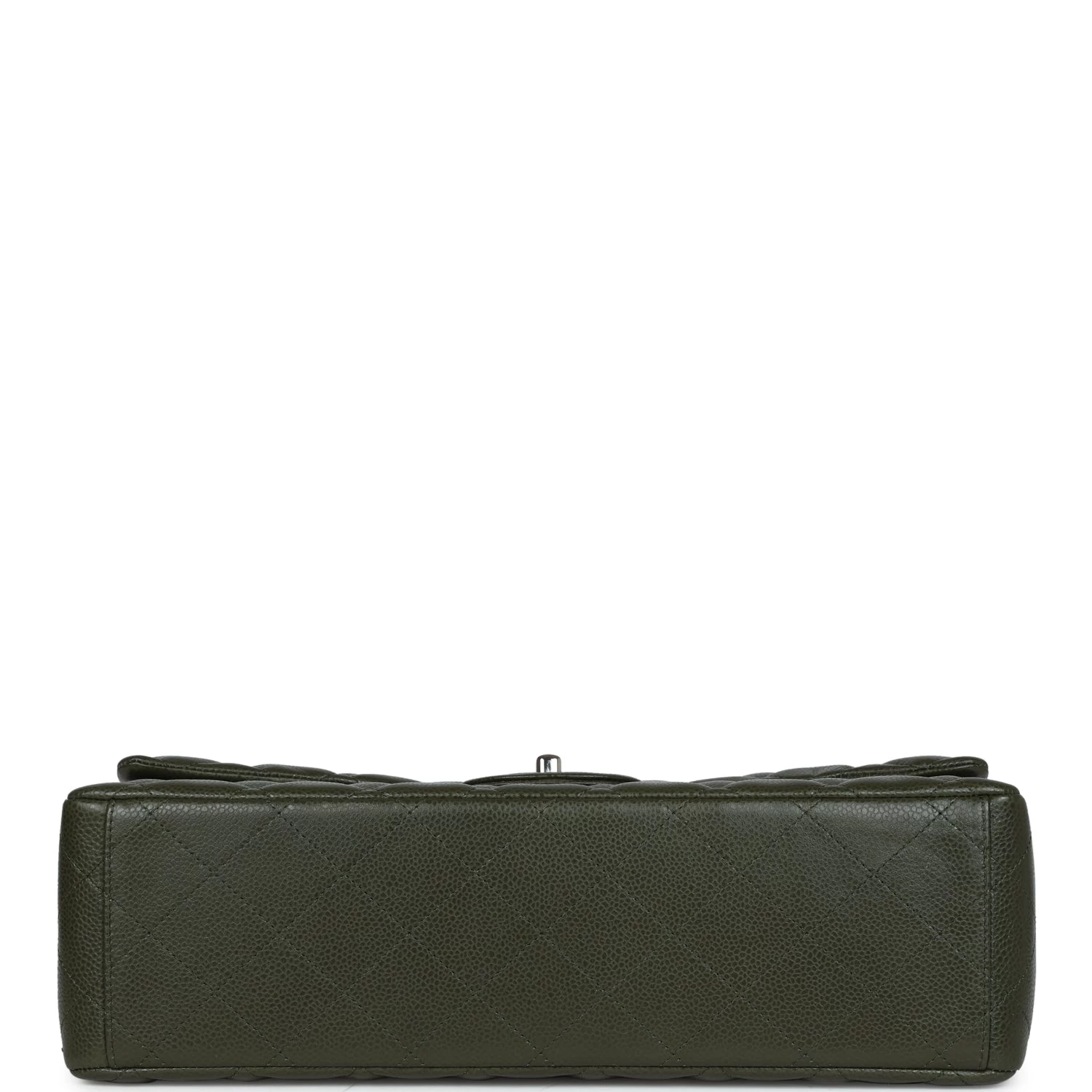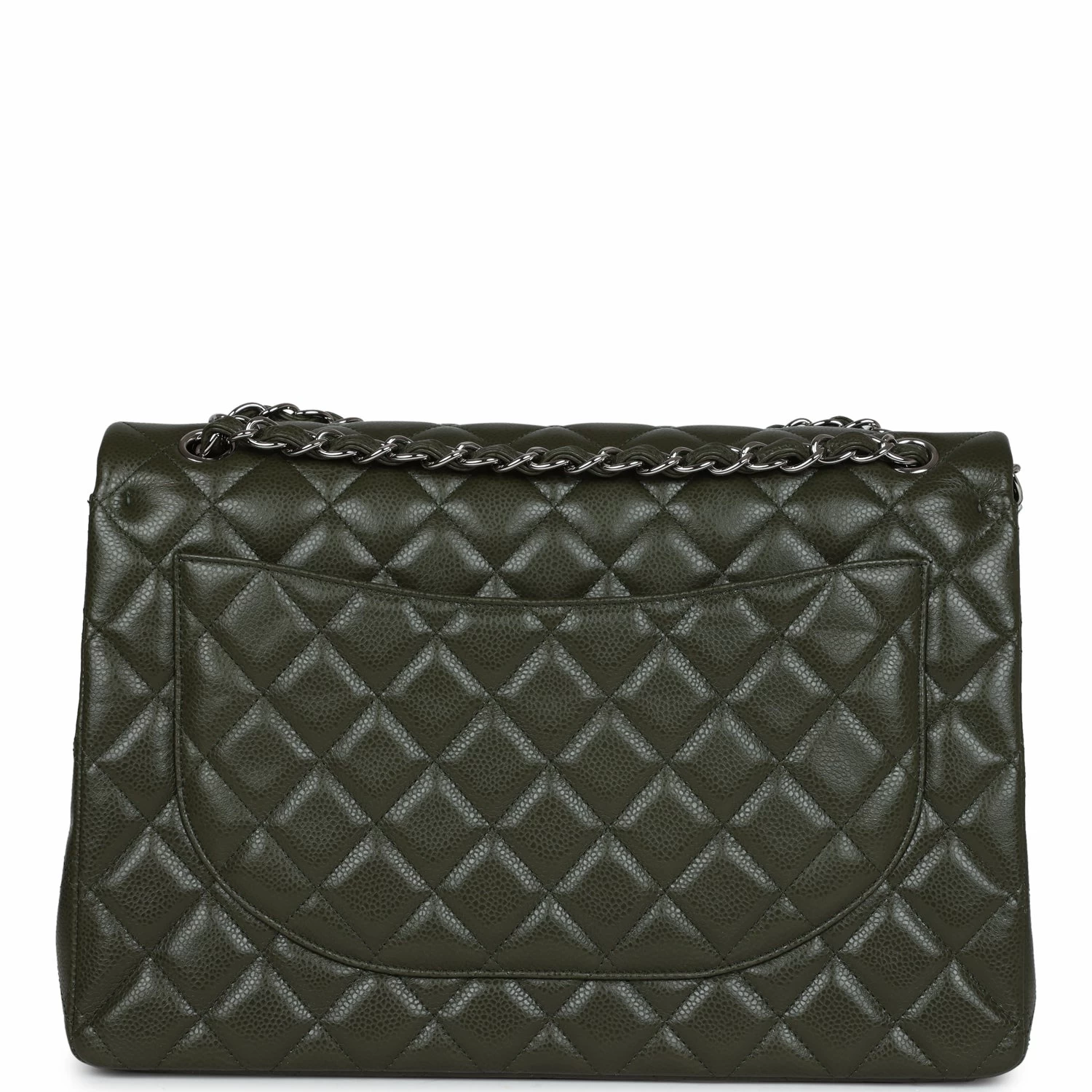 This Maxi Classic Double Flap bag is in olive green caviar leather with silver hardware and features a front flap with signature CC turnlock closure, half moon back pocket, and adjustable interwoven silver tone chain link and olive green leather shoulder strap.