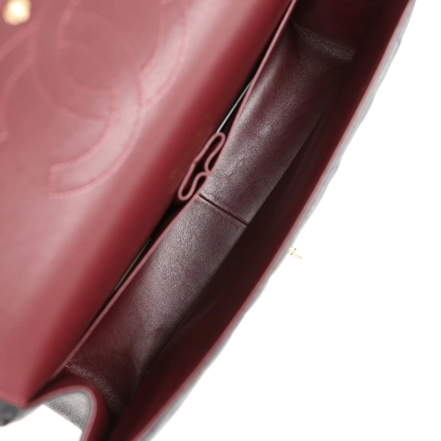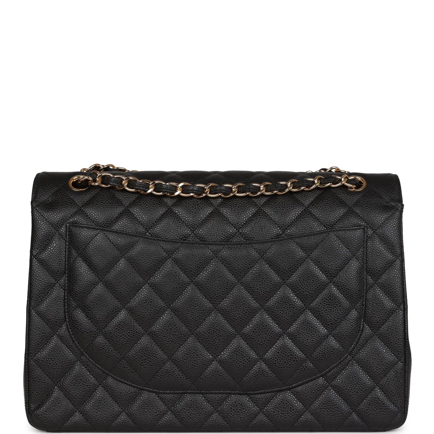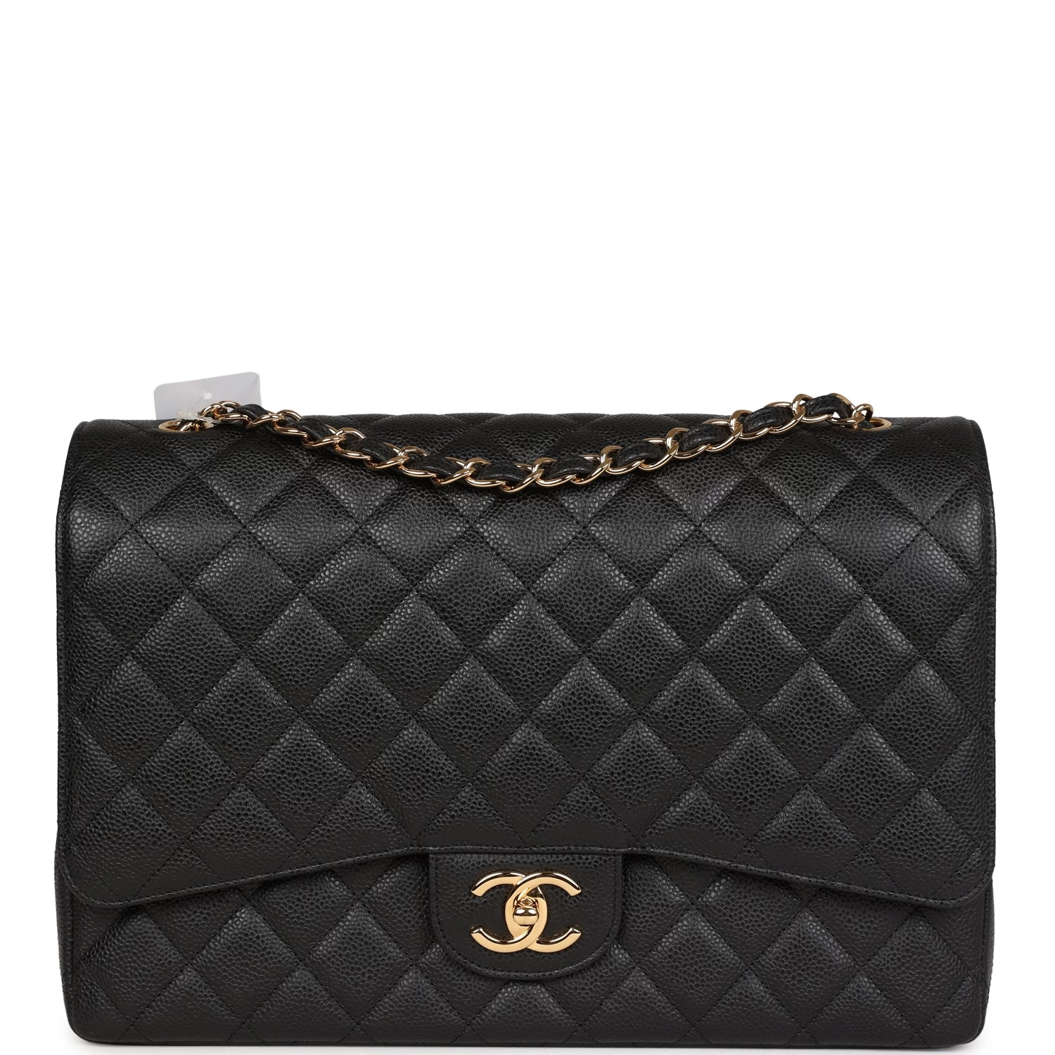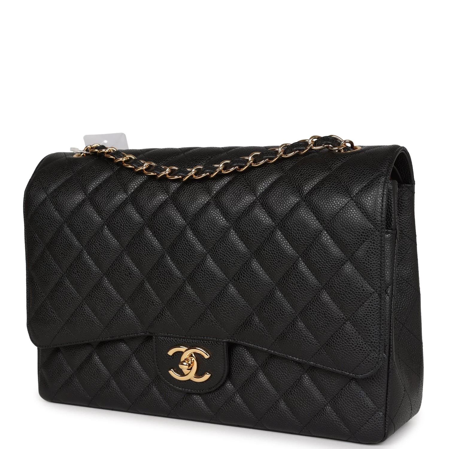 This Maxi Classic Flap bag is in black quilted caviar leather with gold hardware and features a front flap with signature CC turnlock closure, half moon back pocket, and adjustable interwoven gold tone chain link and black leather shoulder strap.