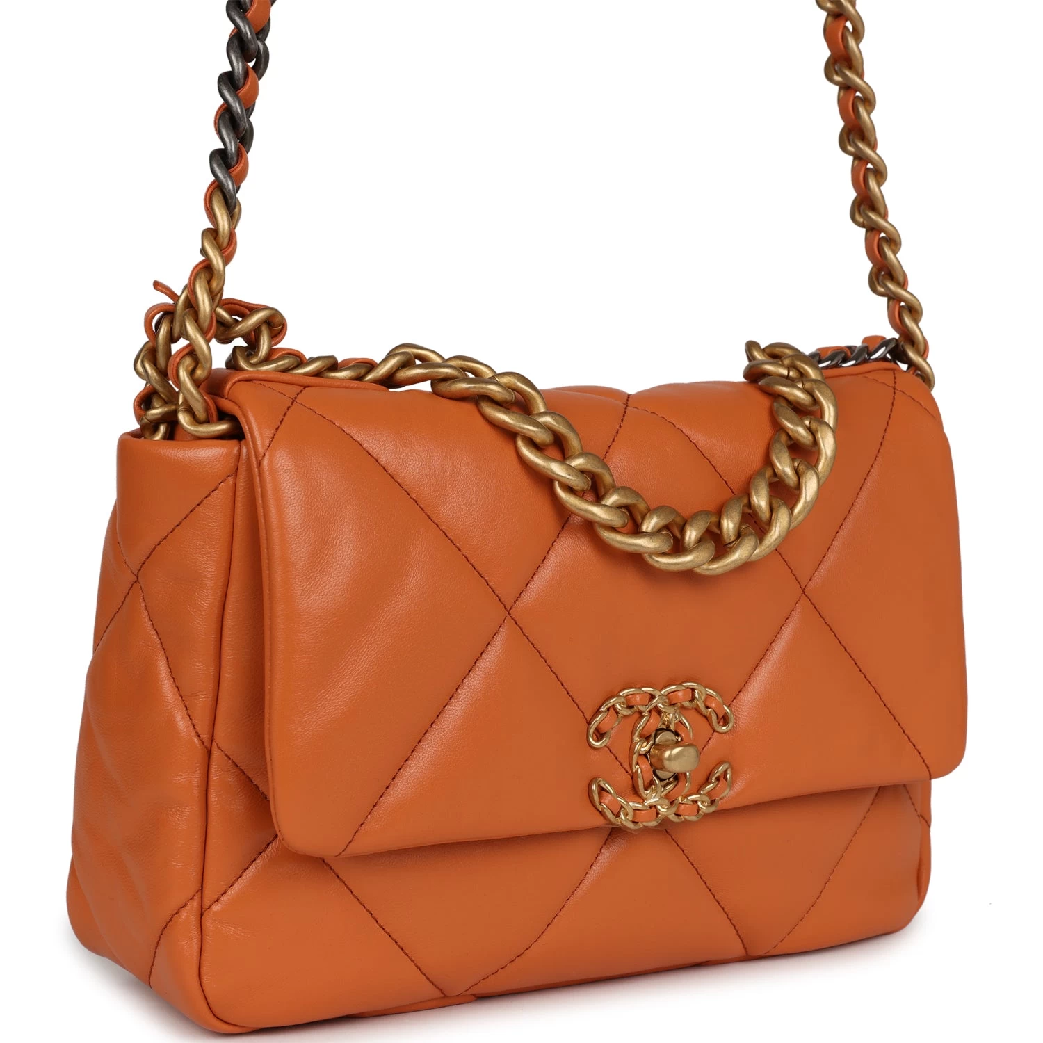 This Medium 19 Flap Bag is in Orange Lambskin with Mixed Metal Hardware and has the signature diamond quilting, signature CC interlocking closure, exterior back pocket, chain top handle, and long mixed metal and orange leather chain