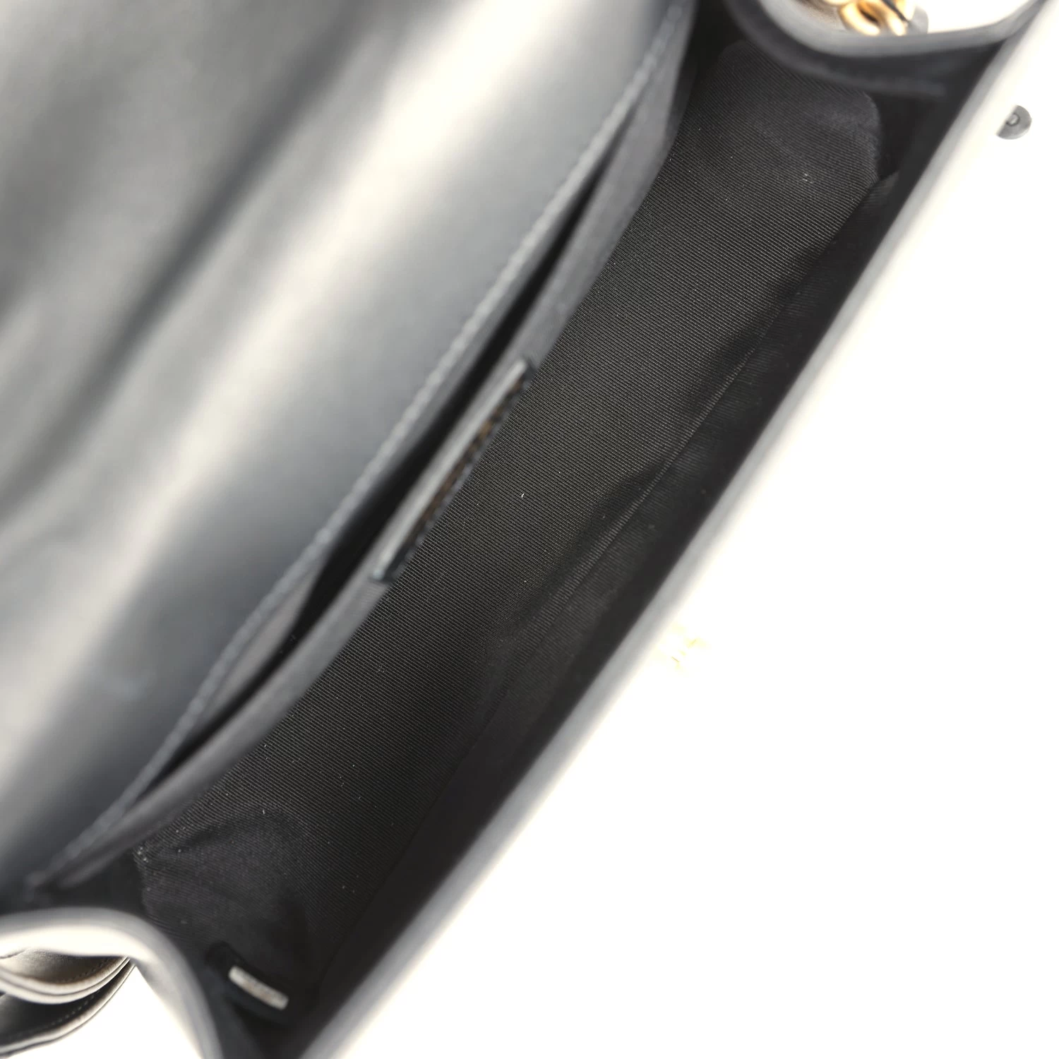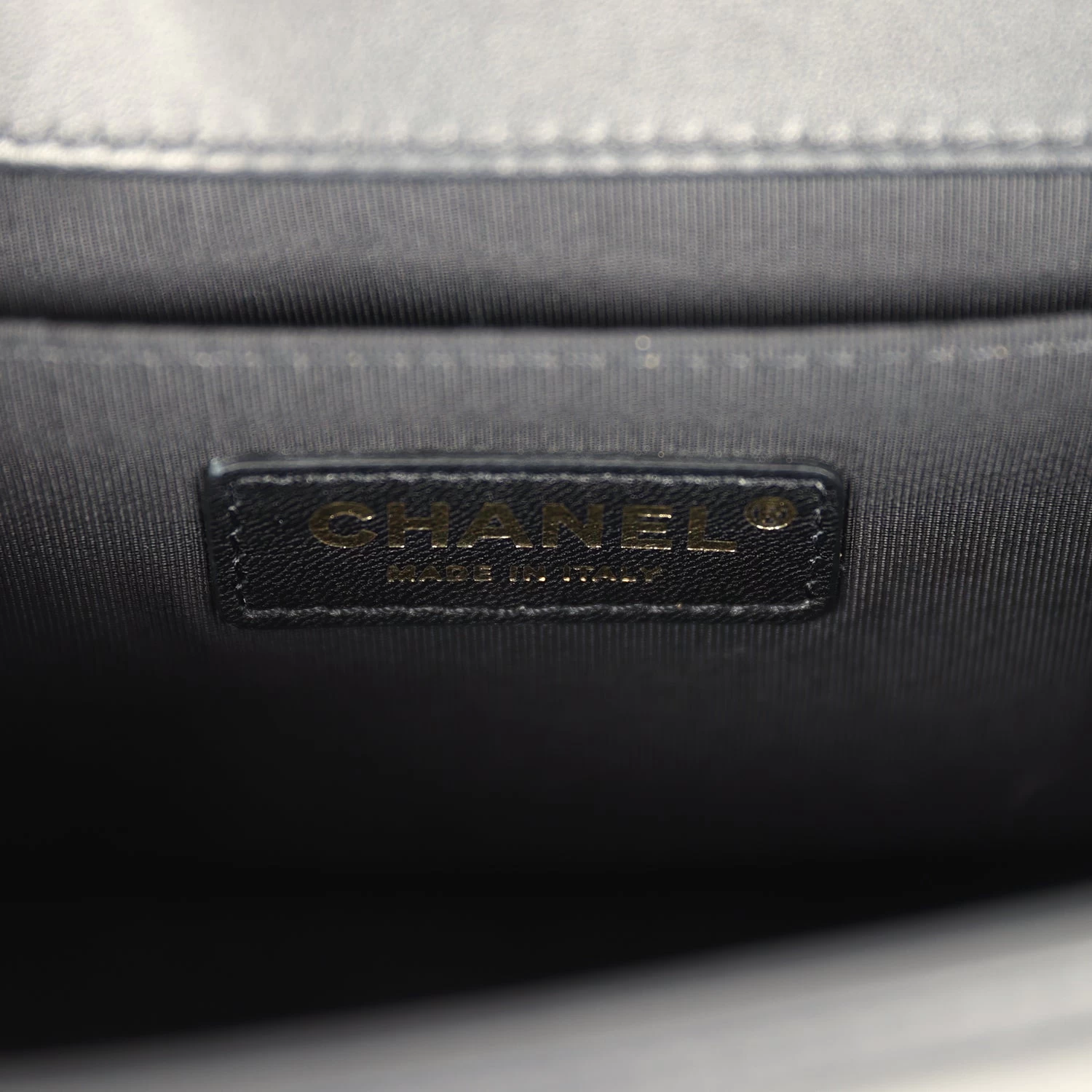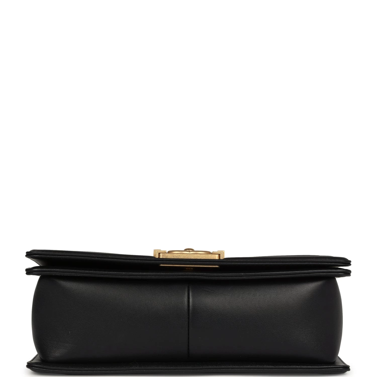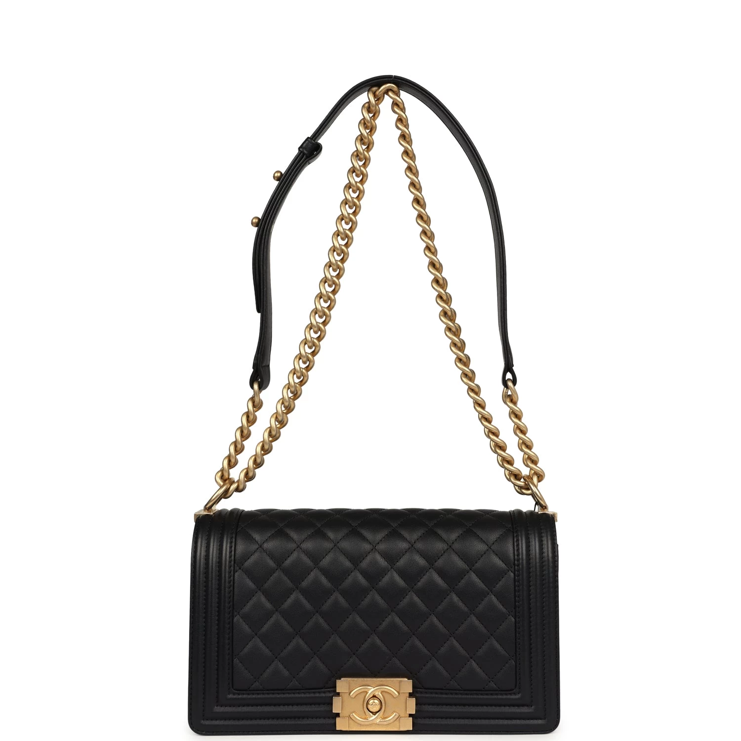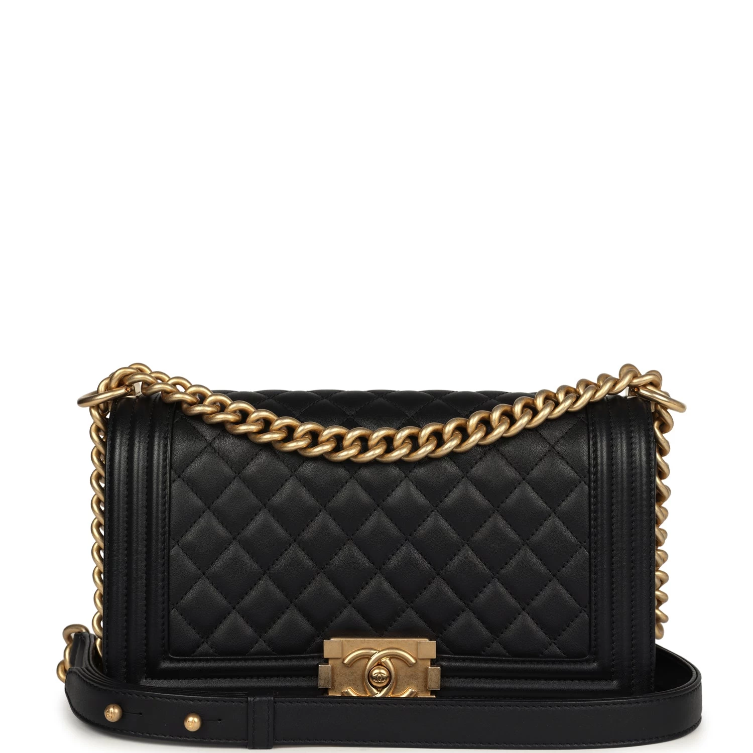 This Old Medium Boy bag is made of black quilted lambskin leather and antique gold hardware with a full front flap with the Boy signature CC push lock closure, smooth leather trim and antique gold chain link and black leather padded shoulder/crossbody strap.