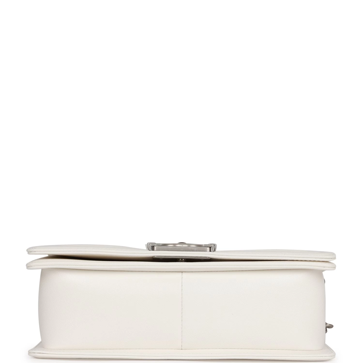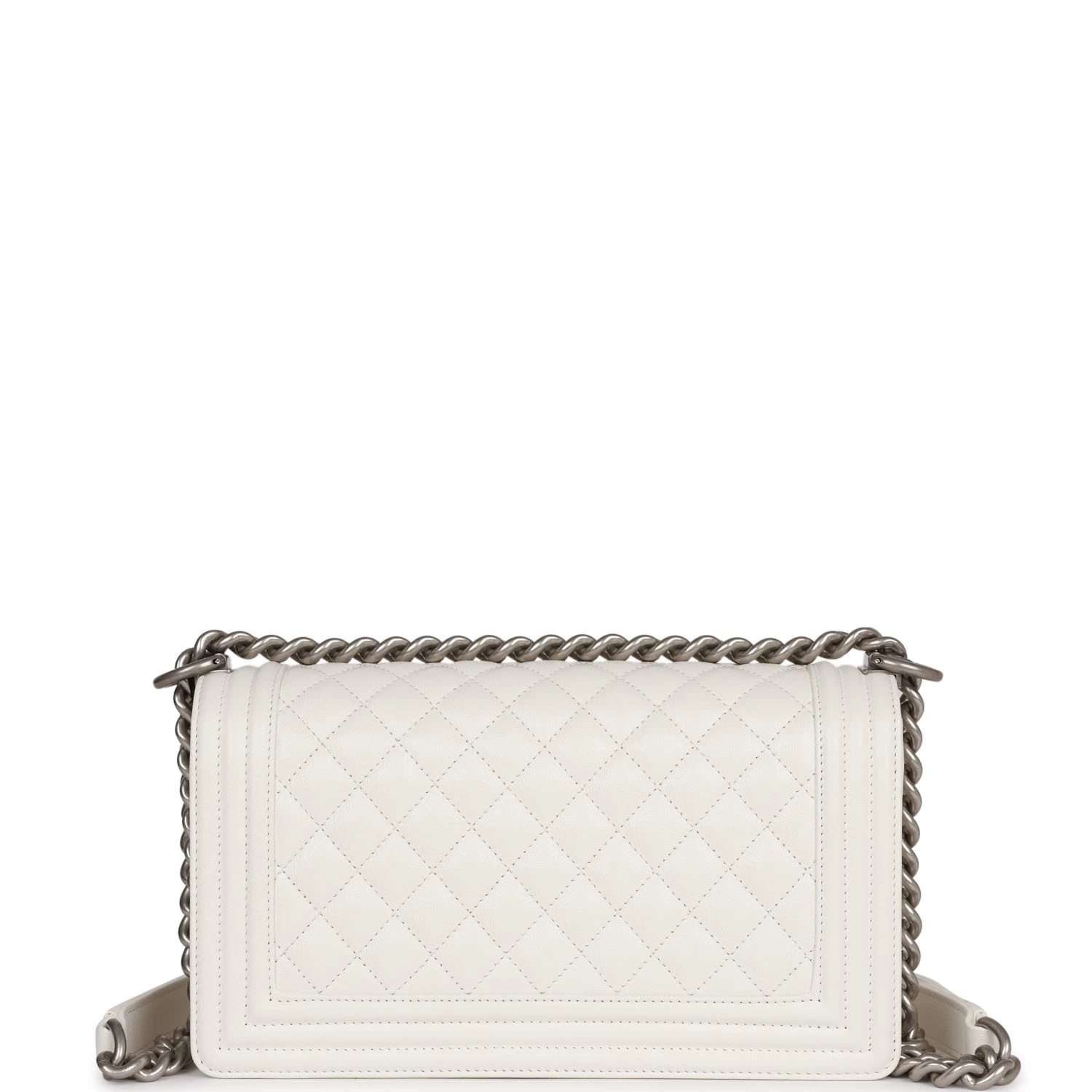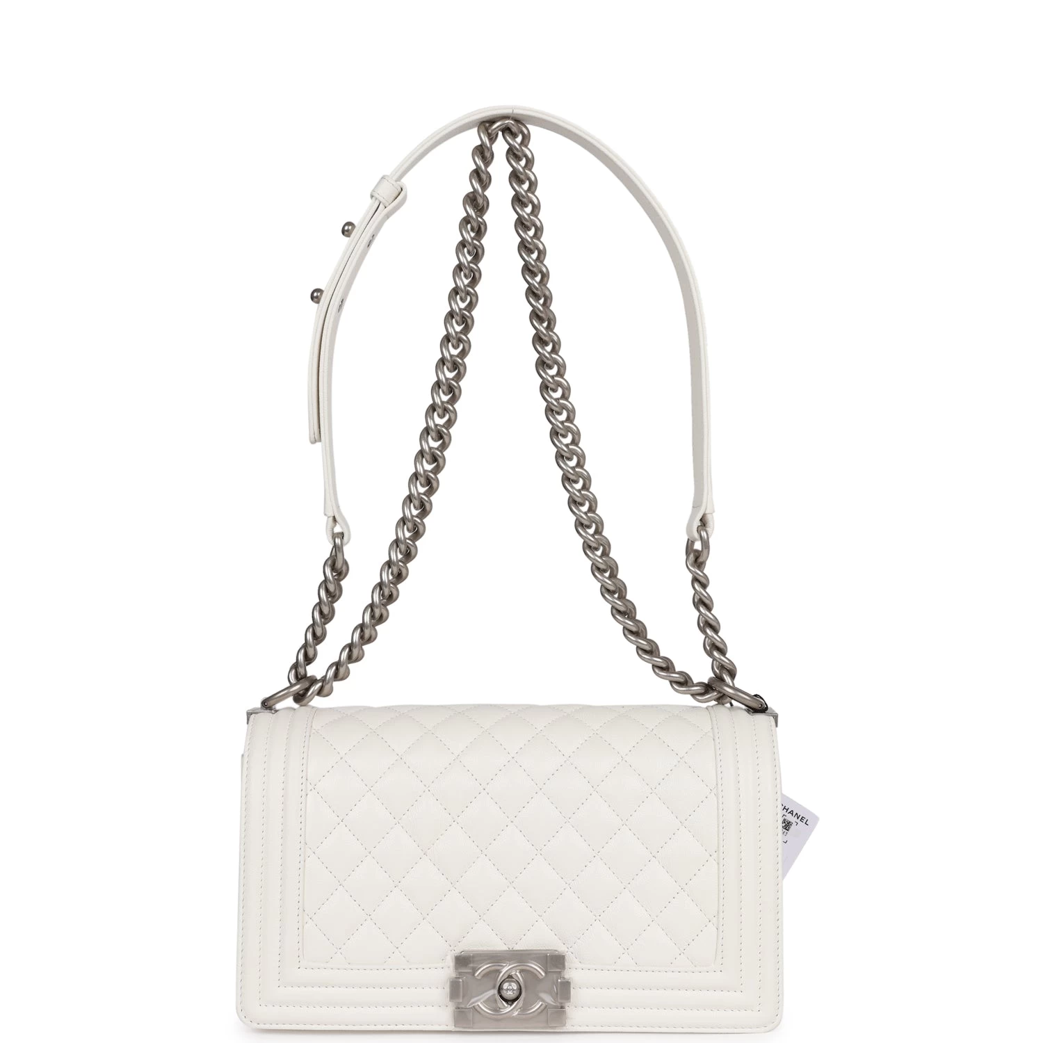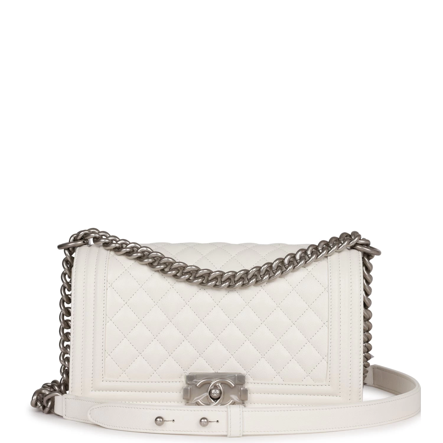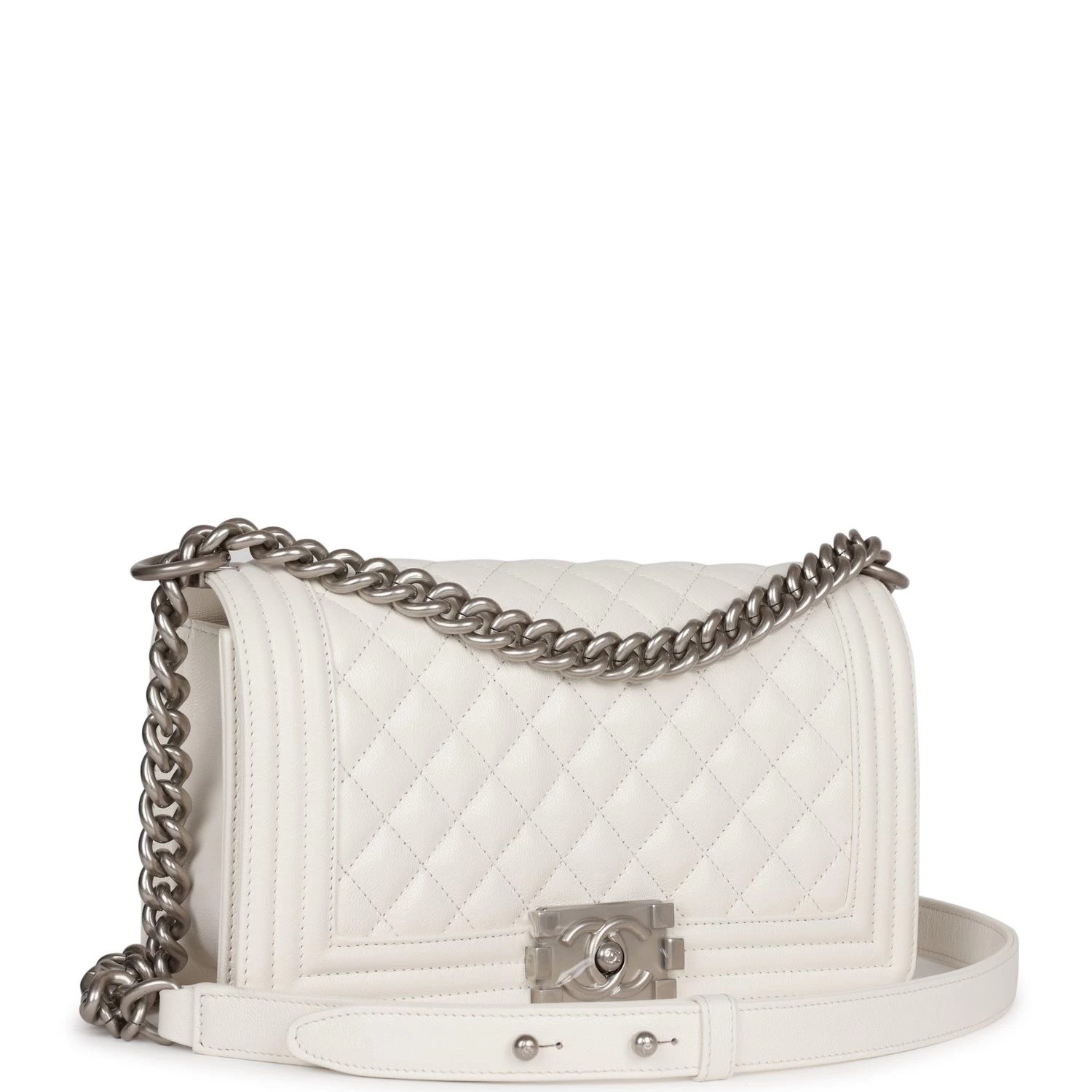 This Old Medium Boy bag is in White caviar leather with aged silver hardware and features a full front flap with the Le Boy CC push lock closure and an aged silver tone chain link and white leather padded shoulder/crossbody strap.