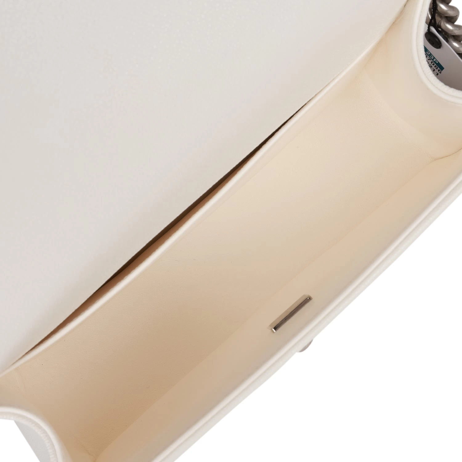 The interior is lined in white leather with an open pocket on rear wall.