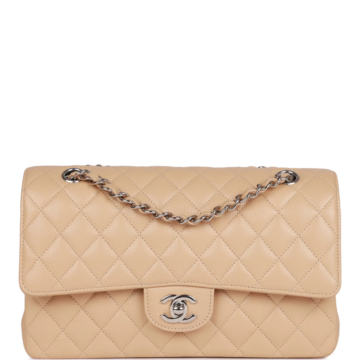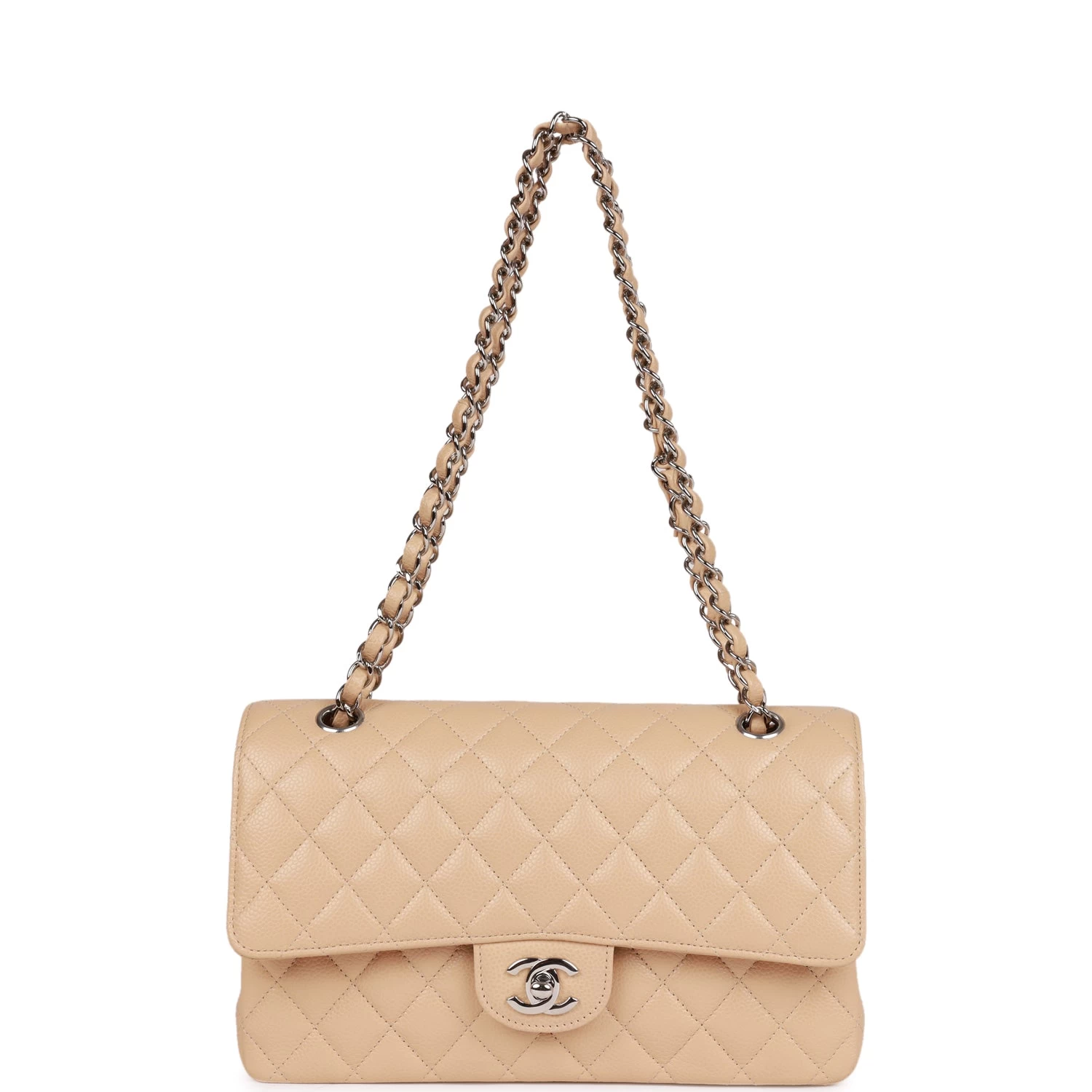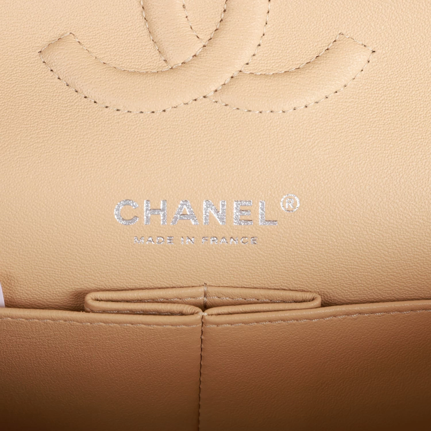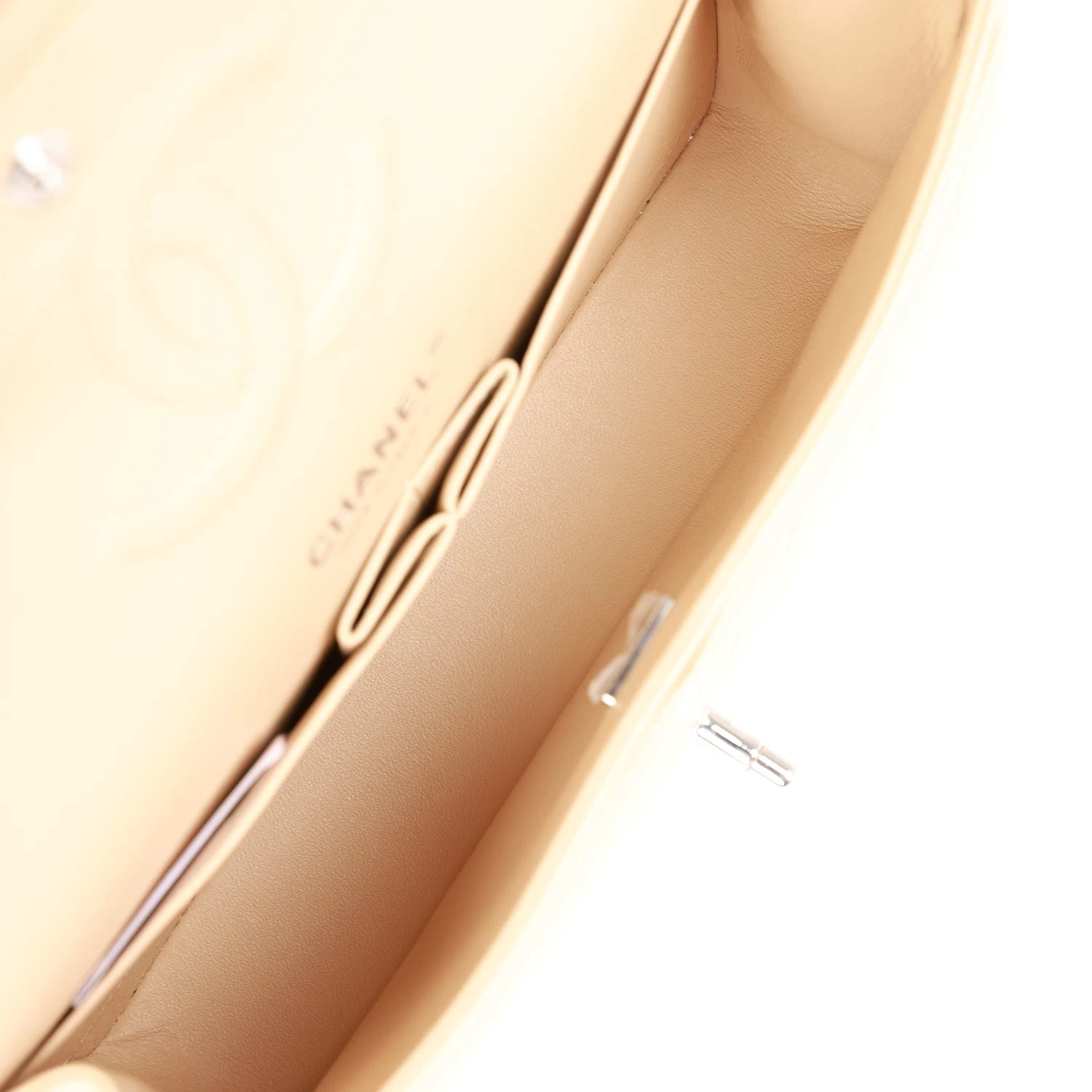 This Medium Classic Double Flap bag is in beige lambskin leather with silver tone hardware and features a front flap with signature CC turnlock closure, half moon back pocket, and adjustable interwoven silver tone chain link and beige leather shoulder strap.