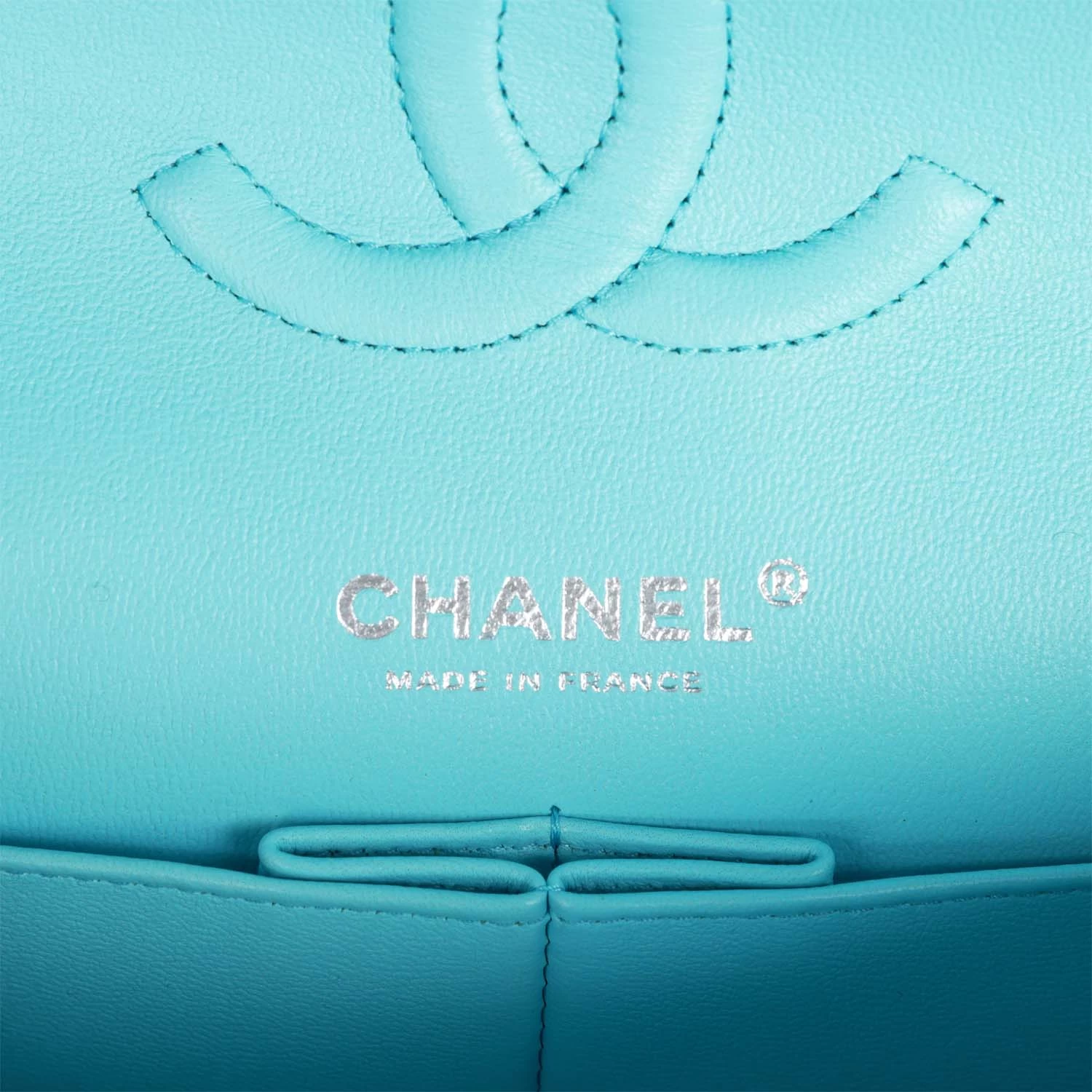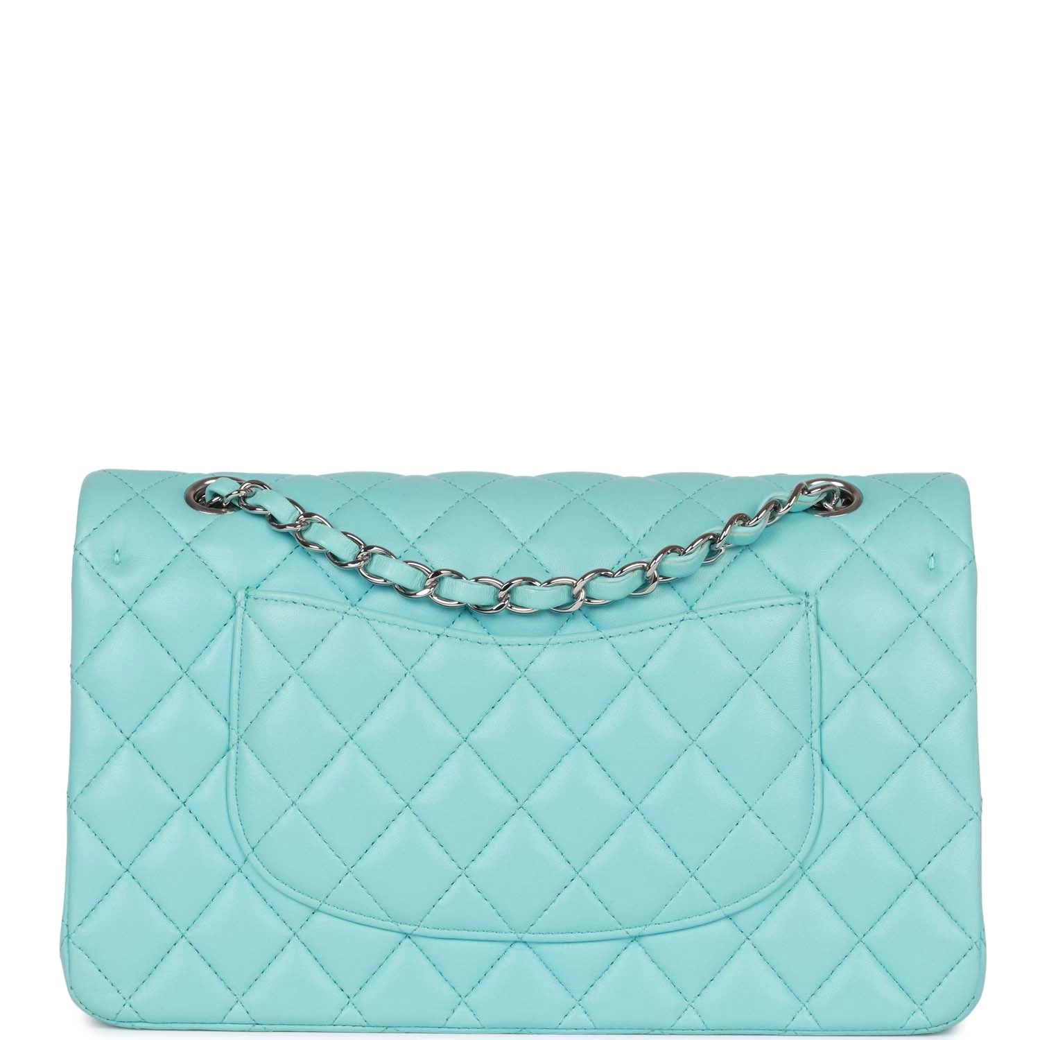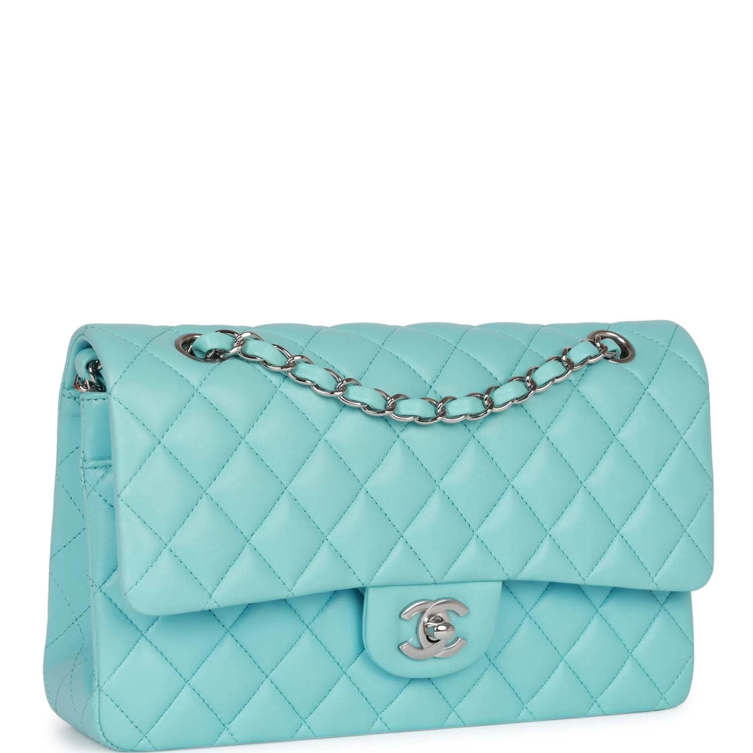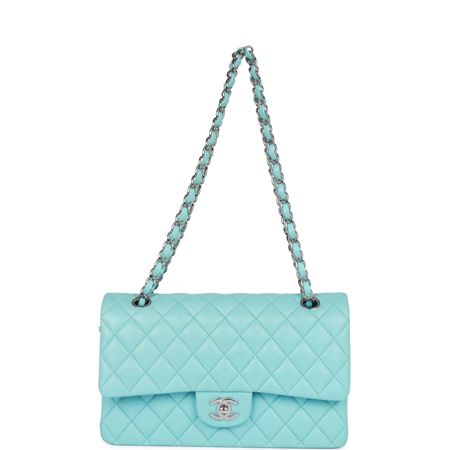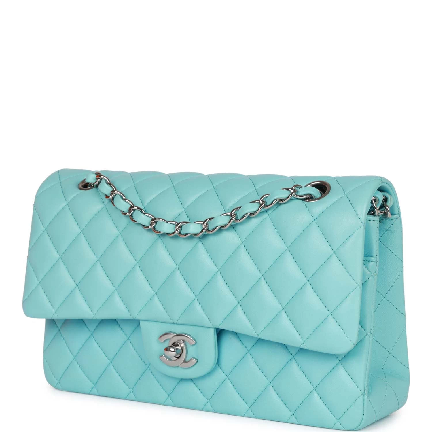 This Medium Classic Double Flap bag is in blue lambskin leather with silver tone hardware and features a front flap with signature CC turnlock closure, half moon back pocket, and adjustable interwoven silver tone chain link and blue leather shoulder strap.