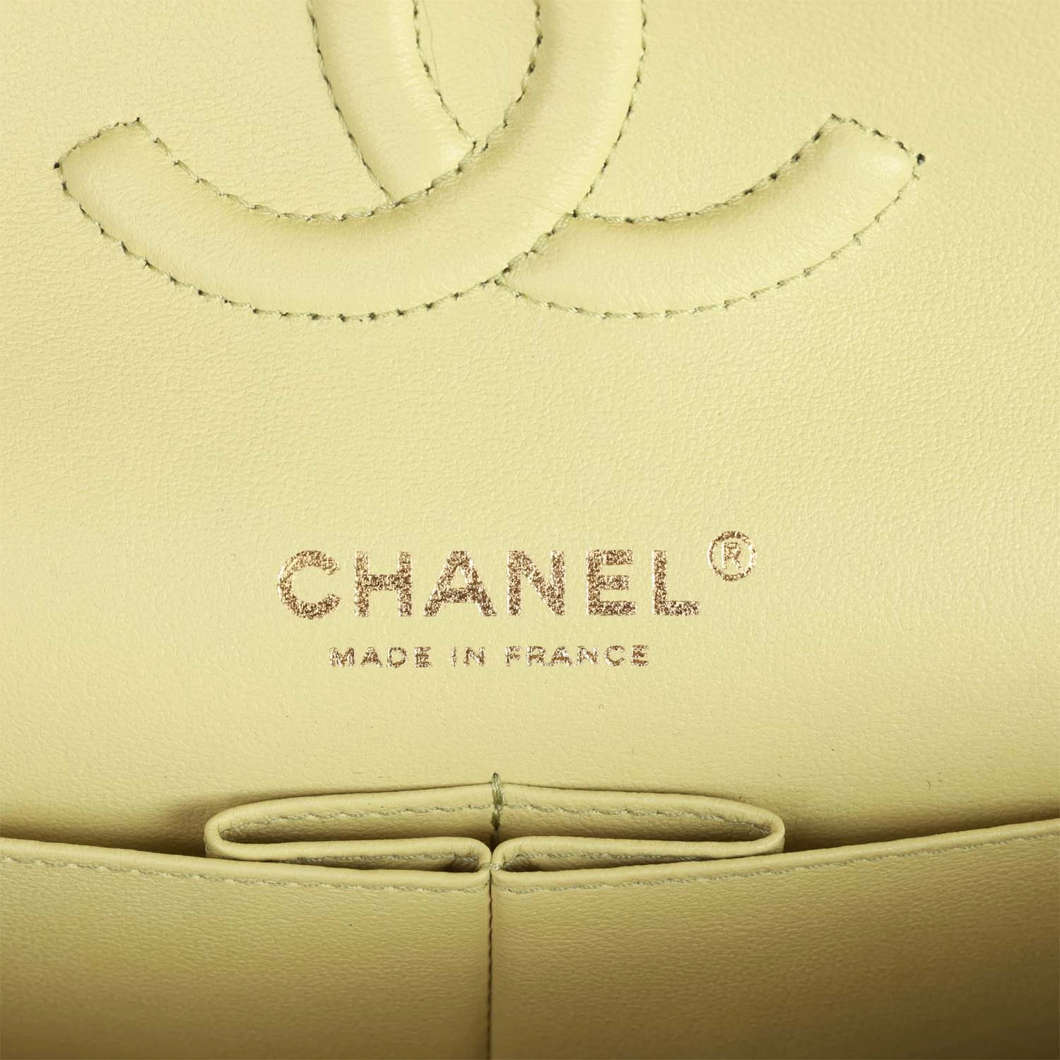 This Medium Classic Double Flap bag is in light green lambskin leather with light gold tone hardware and features a front flap with signature CC turnlock closure, half moon back pocket, and adjustable interwoven light gold tone chain link and light green leather shoulder strap.