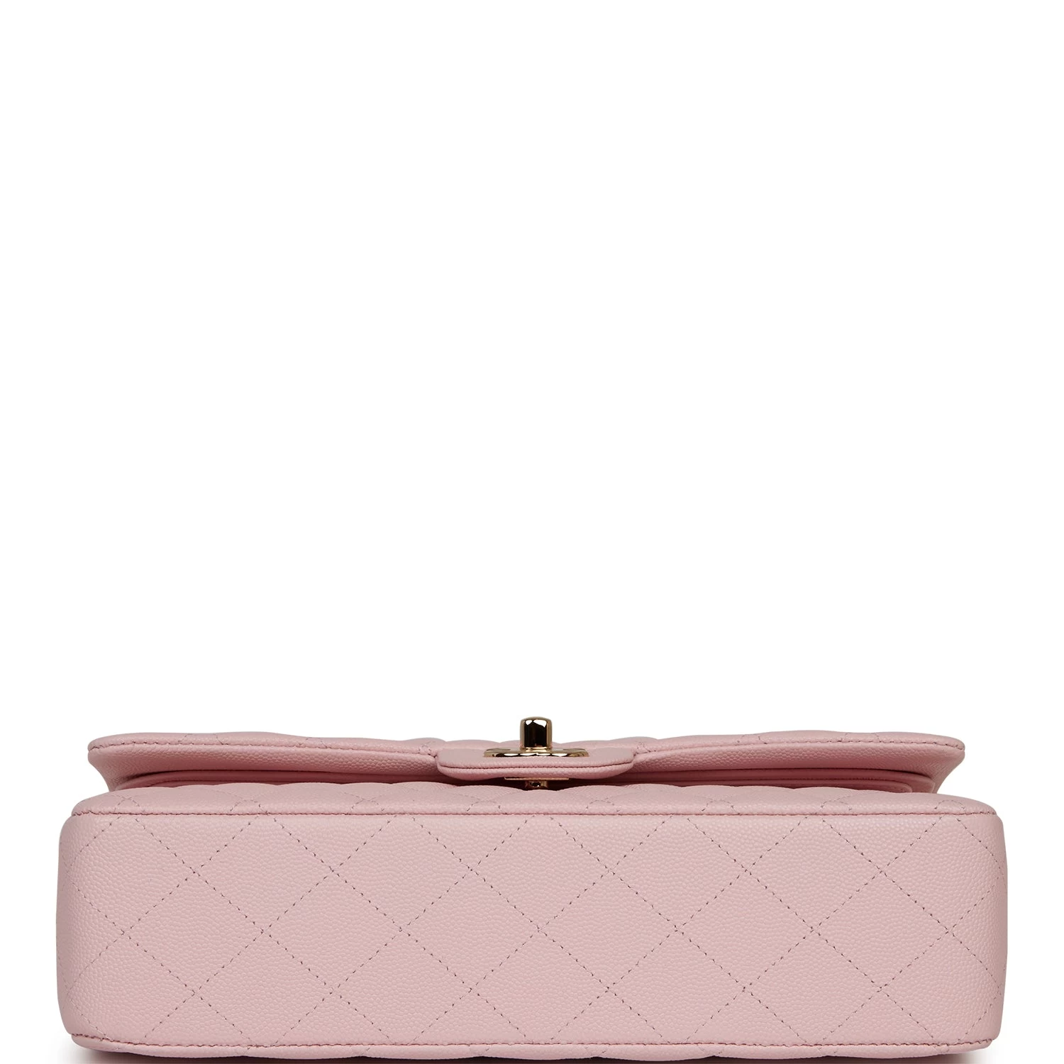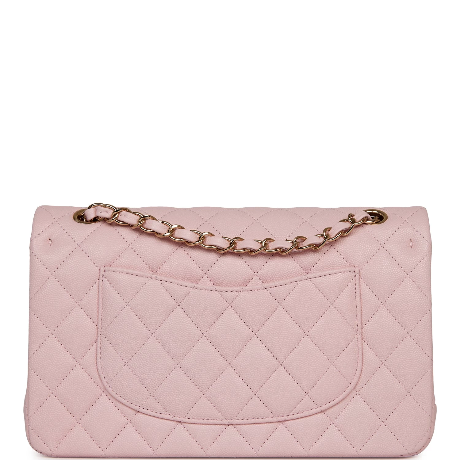 This Medium Classic Double Flap bag is in light pink caviar leather with light gold tone hardware and features a front flap with signature CC turnlock closure, half moon back pocket, and adjustable interwoven light gold tone chain link and light pink leather shoulder strap.