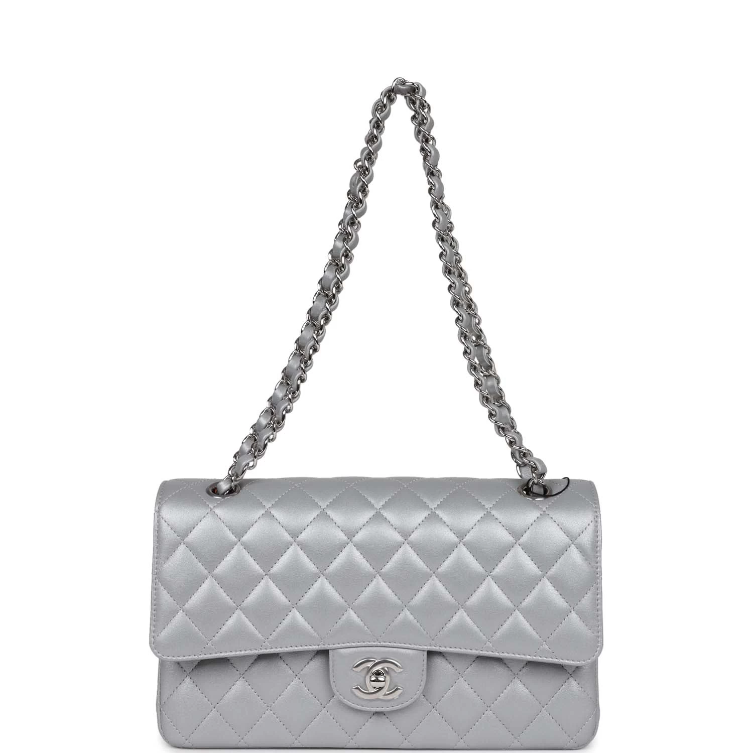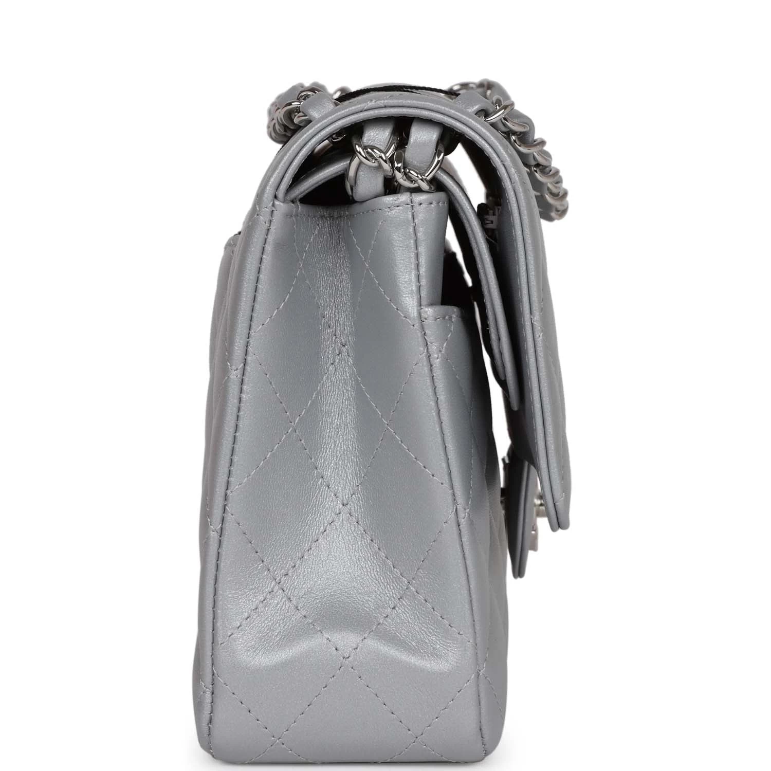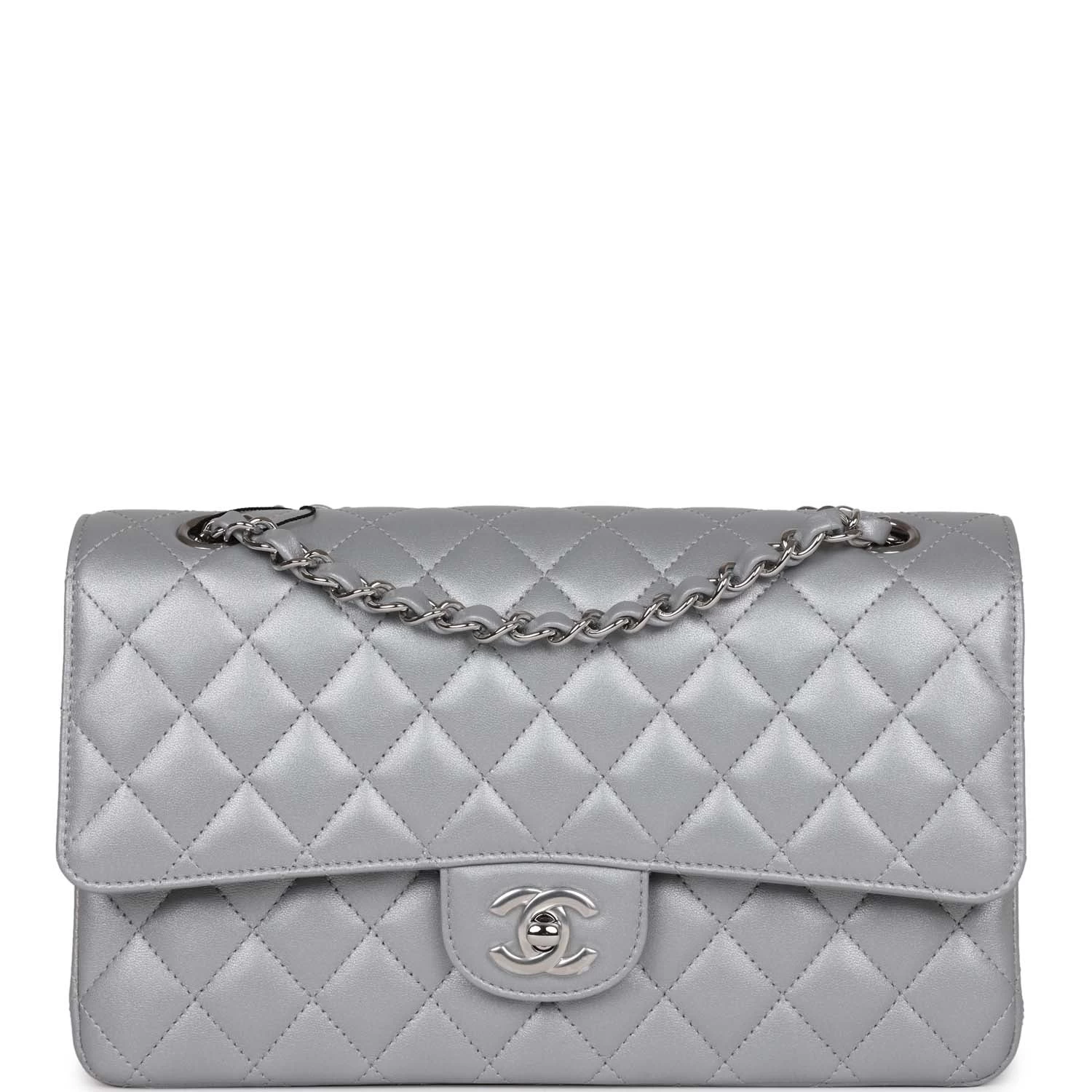 This Chanel Medium Classic Double Flap bag is in silver metallic lambskin leather with silver hardware, front flap with CC turnlock closure, half moon back pocket and adjustable interwoven silver chain link and metallic grey leather shoulder/crossbody strap