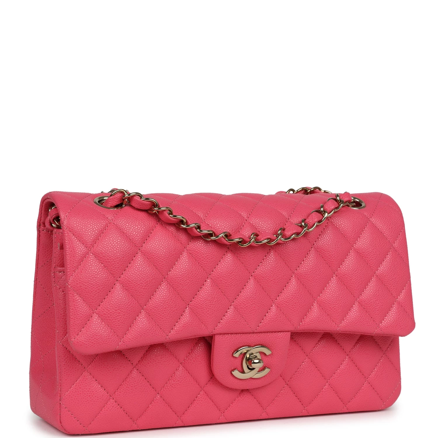 This Medium Classic Double Flap bag is in hot pink shiny caviar leather with light gold tone hardware and features a front flap with signature CC turnlock closure, half moon back pocket, and adjustable interwoven light gold tone chain link and hot pink leather shoulder strap.