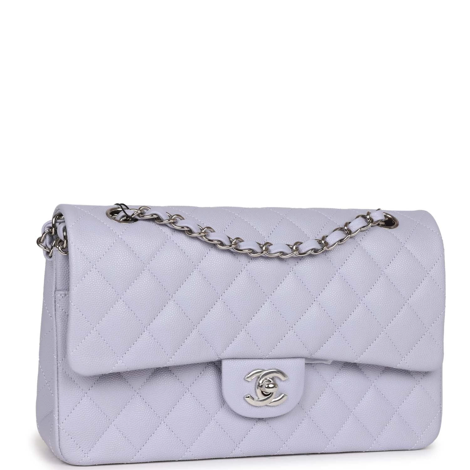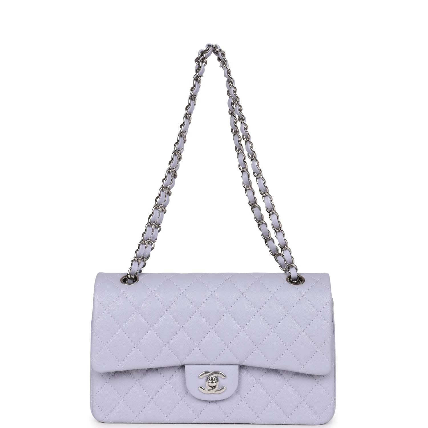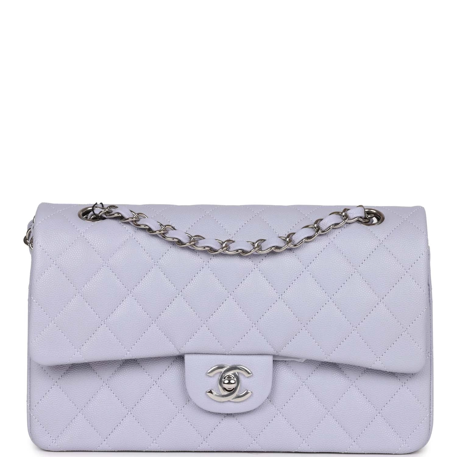This Medium Classic Double Flap bag is in Lavender caviar leather with silver hardware, front flap with CC turnlock closure, half moon back pocket, interwoven silver tone chain link and light purple leather shoulder/crossbody strap.