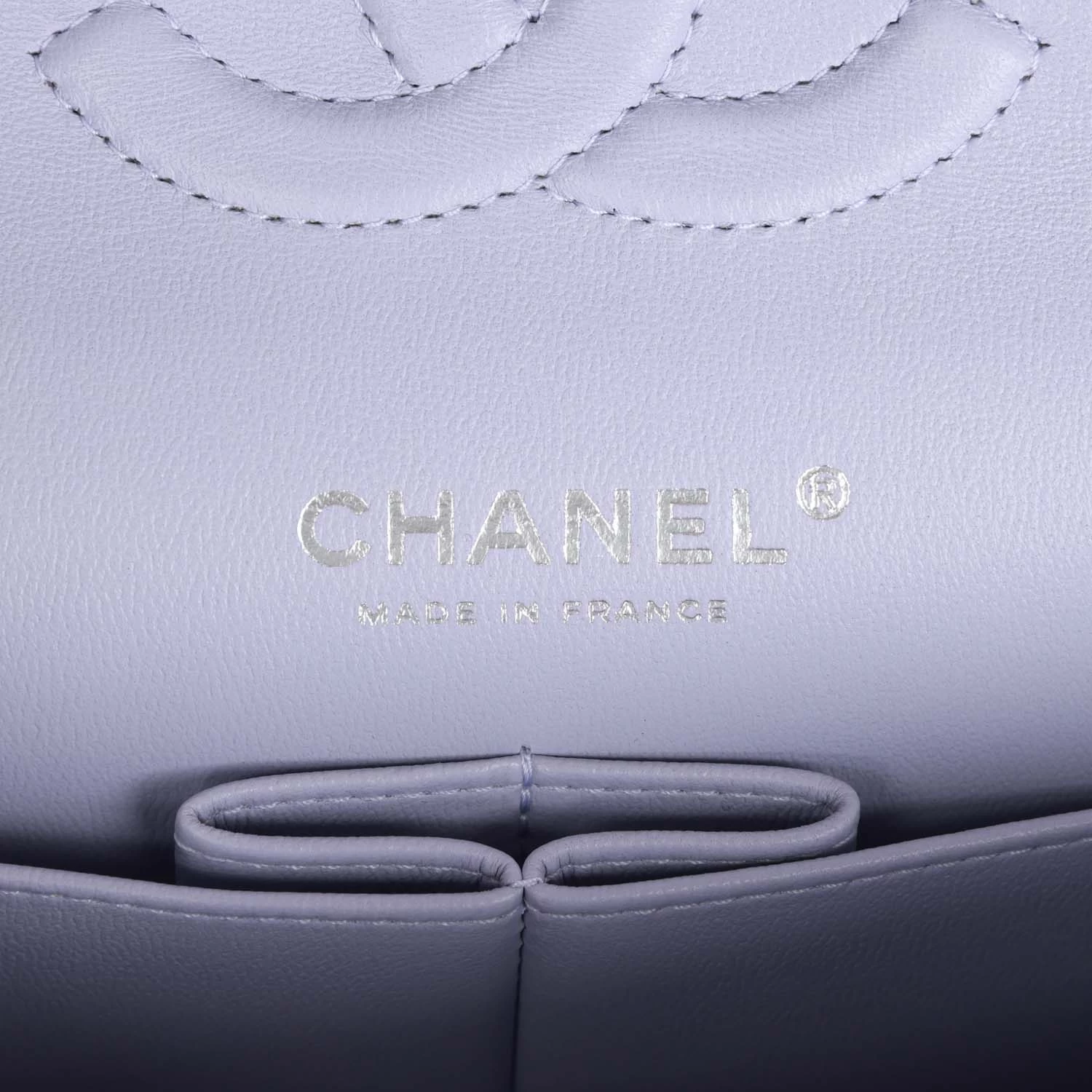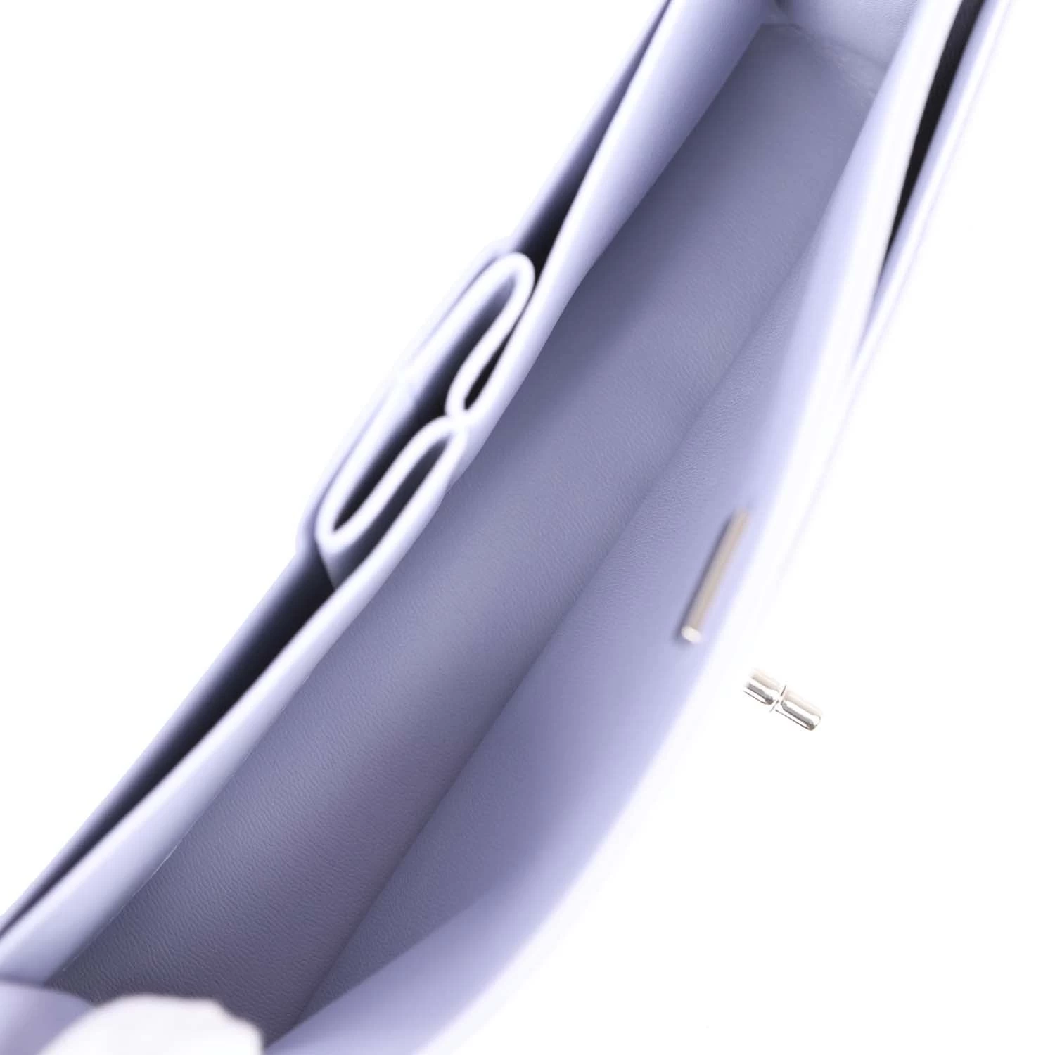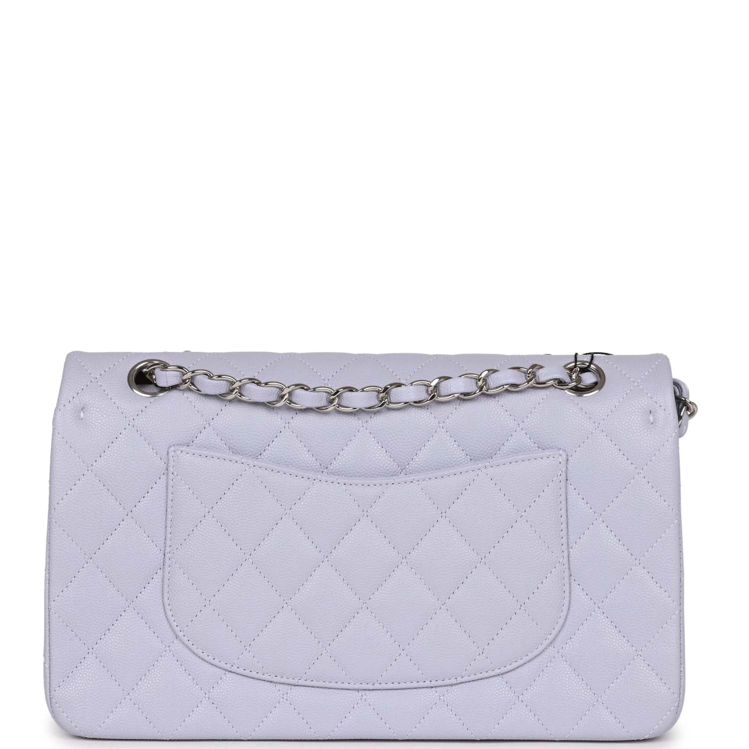 This Medium Classic Double Flap bag is in Lavender caviar leather with silver hardware, front flap with CC turnlock closure, half moon back pocket, interwoven silver tone chain link and light purple leather shoulder/crossbody strap.