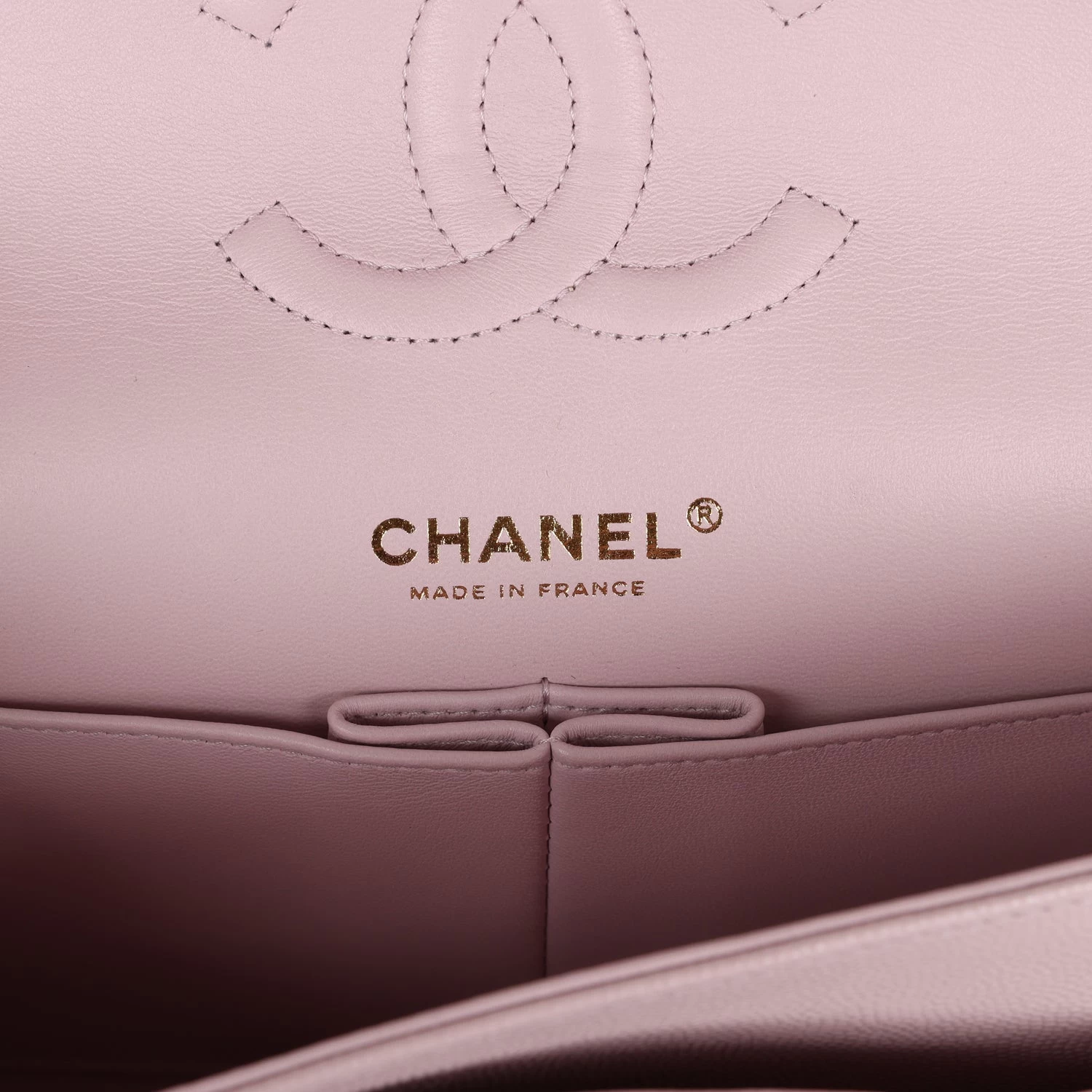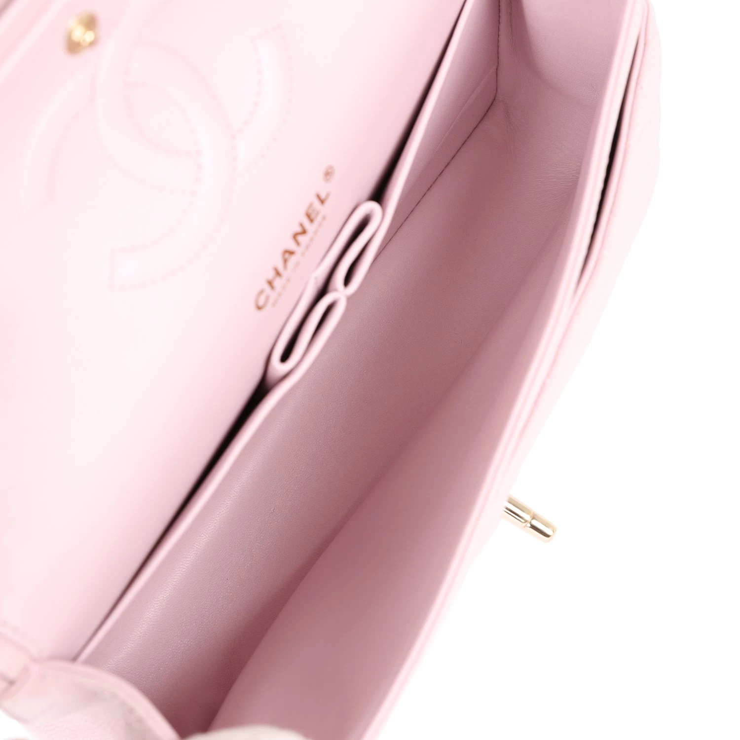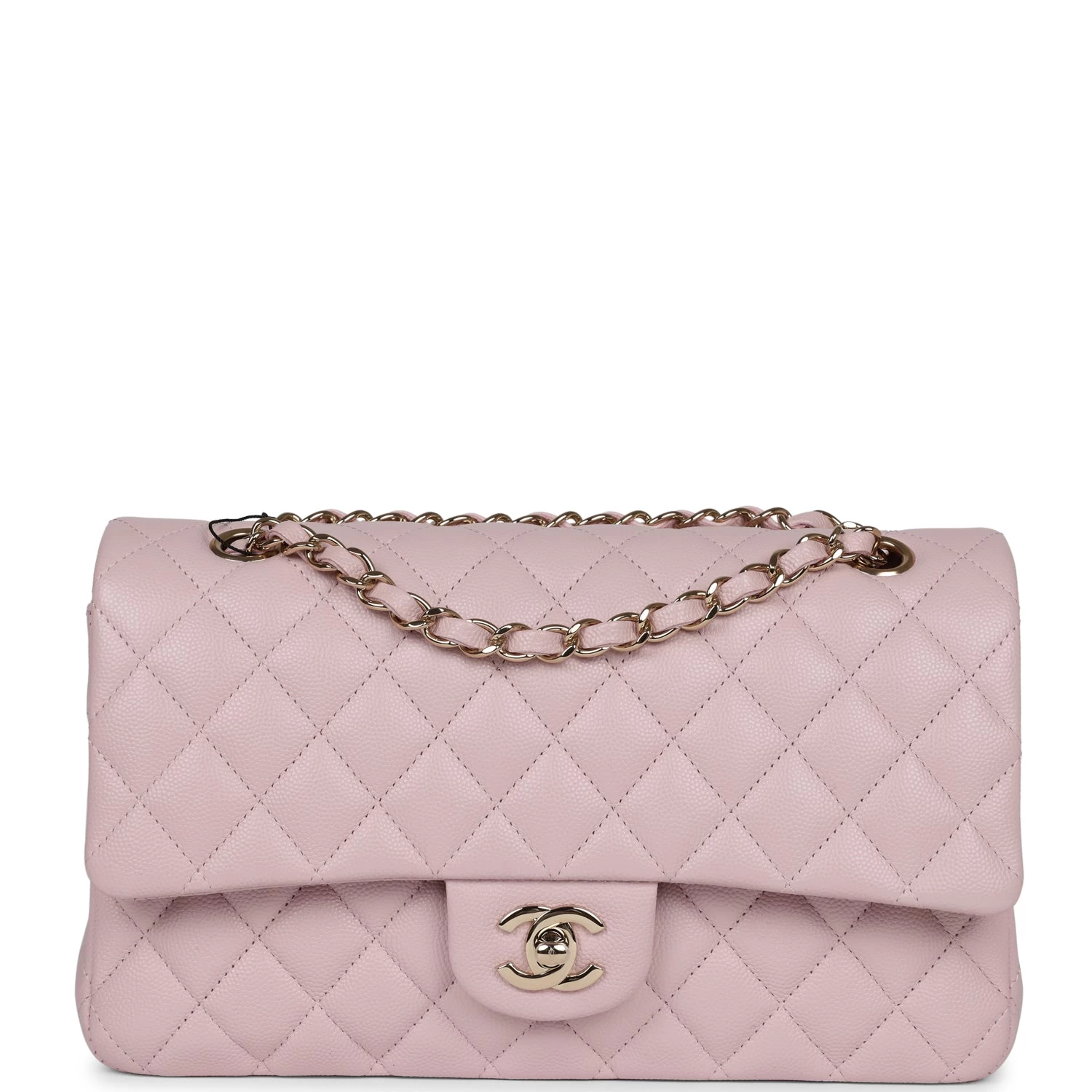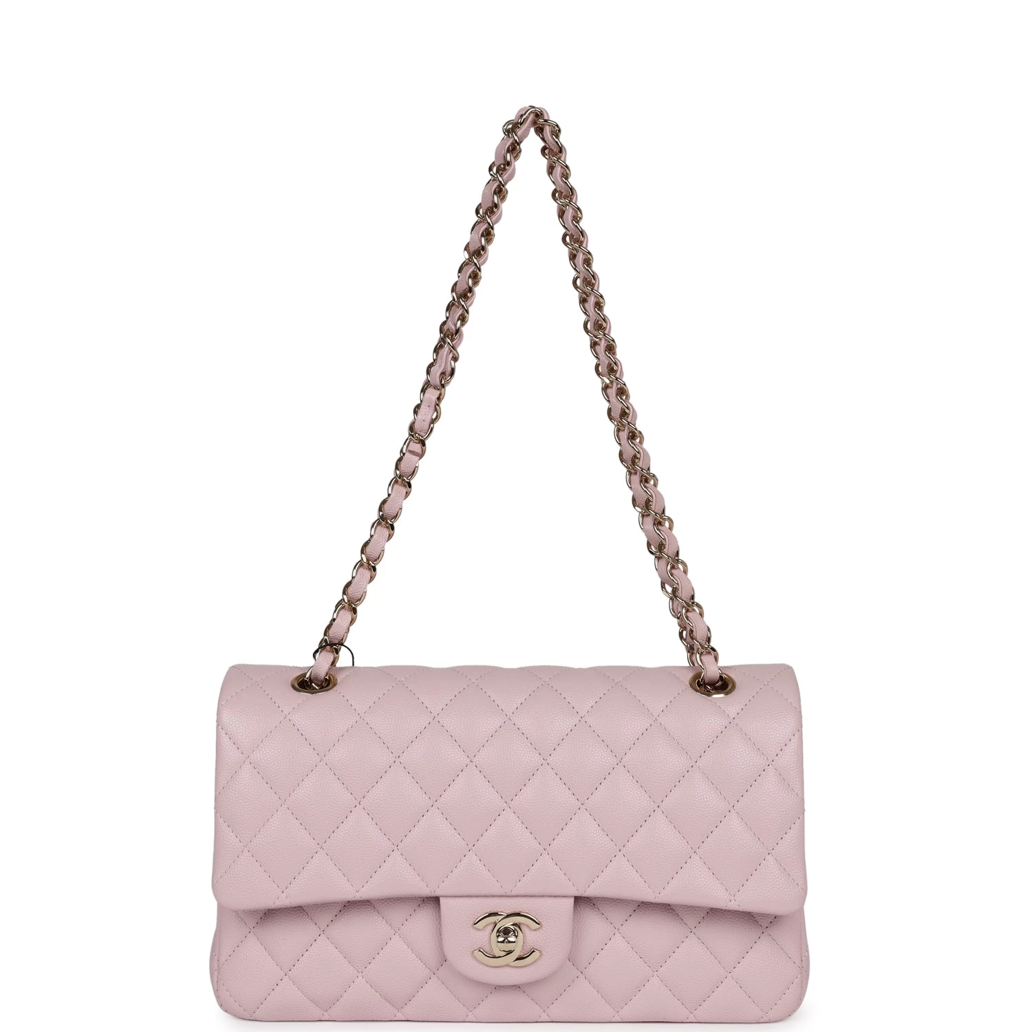 This Medium Classic Double Flap bag is in Light Pink caviar leather with light gold tone hardware and features a front flap with signature CC turnlock closure, half moon back pocket, and adjustable interwoven light gold tone chain link and light pink leather shoulder strap.