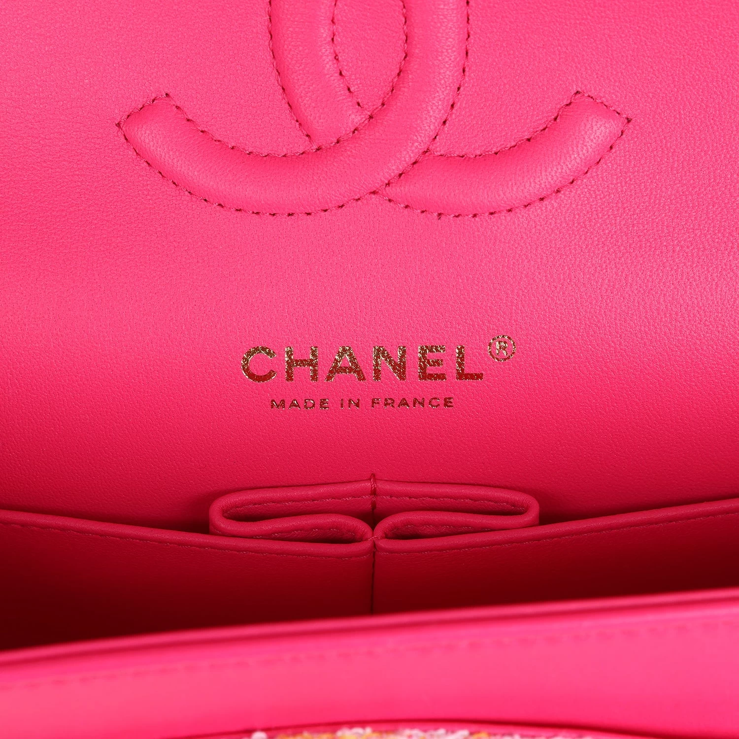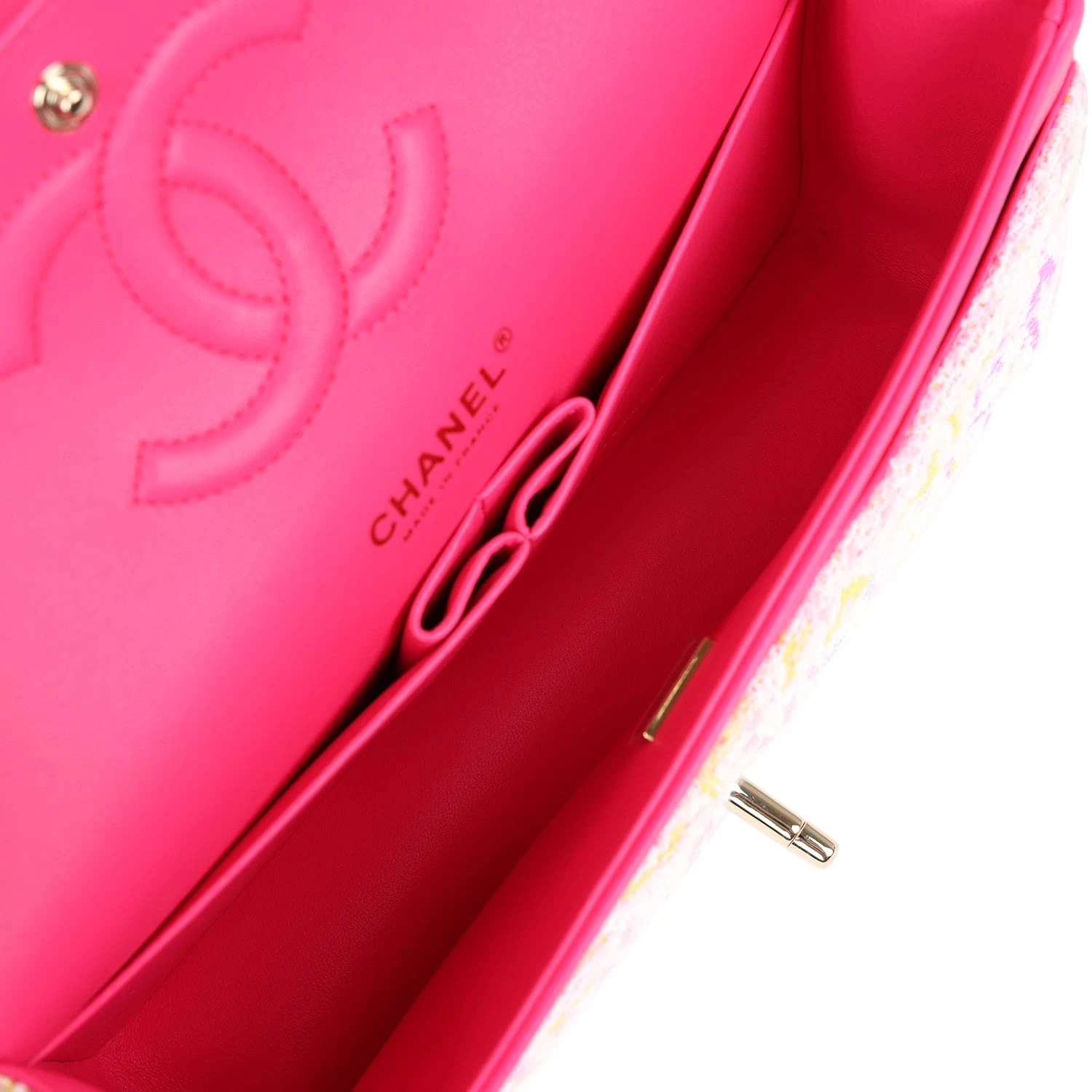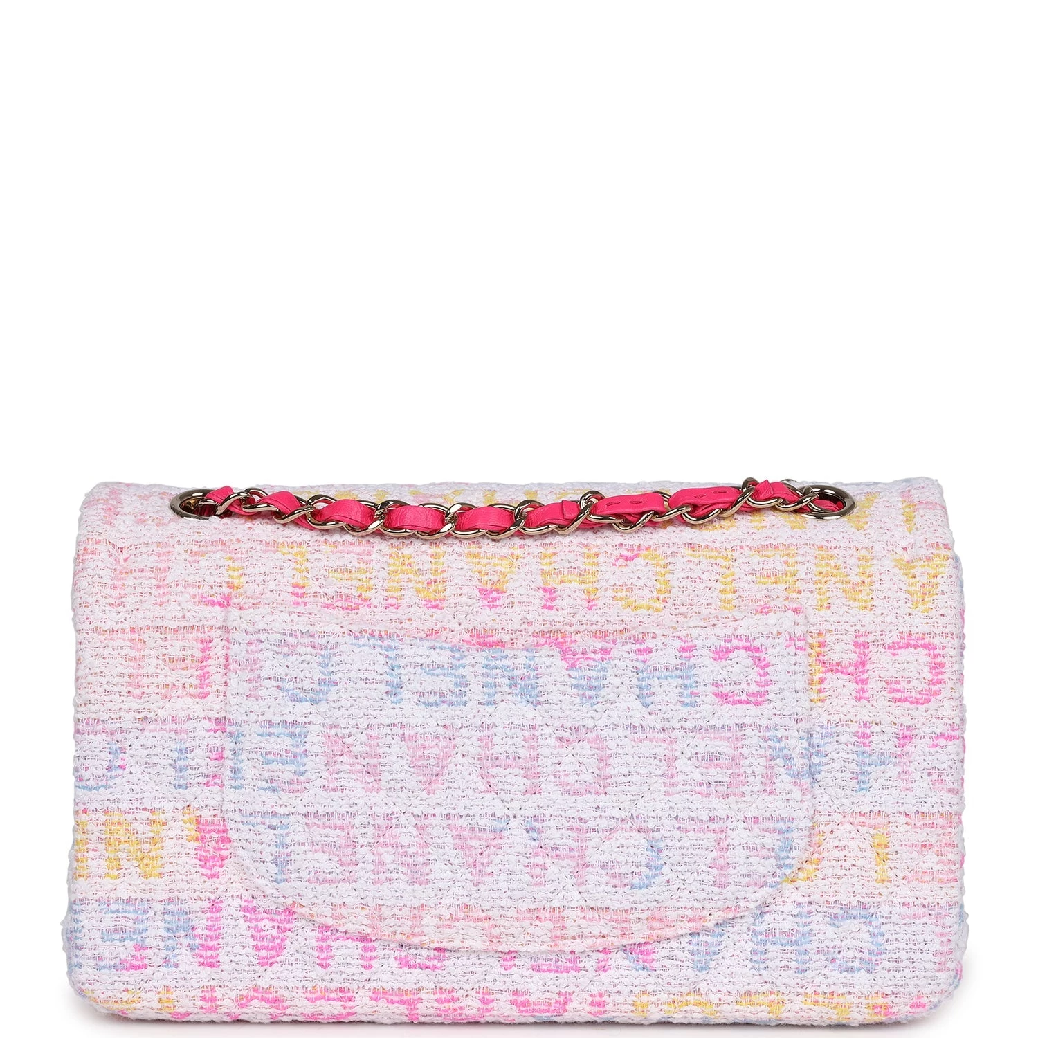 This Chanel medium classic double flap bag is in hot pink, white, yellow and purple tweed boucle fabric with light gold tone hardware and features multicolored “Chanel” lettering stitched throughout the tweed boucle fabric, has a front flap with signature light gold and hot pink lacquered CC turnlock closure, half moon back pocket, and adjustable interwoven light gold tone chain link and hot pink leather shoulder strap.