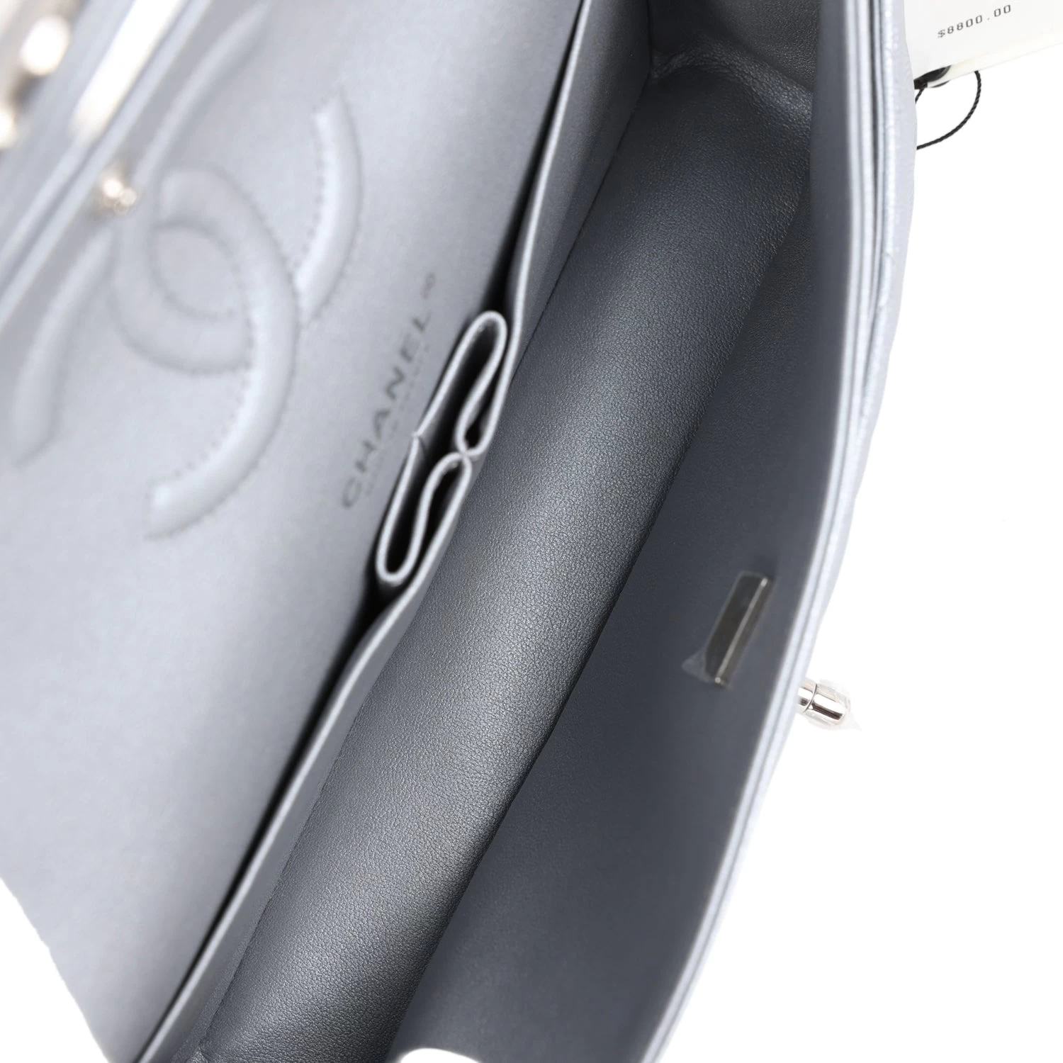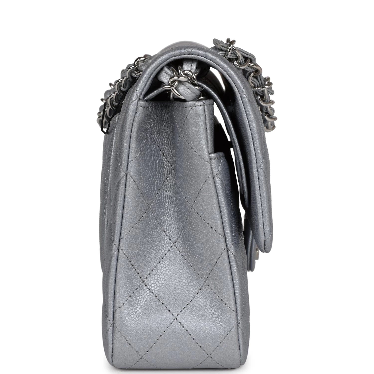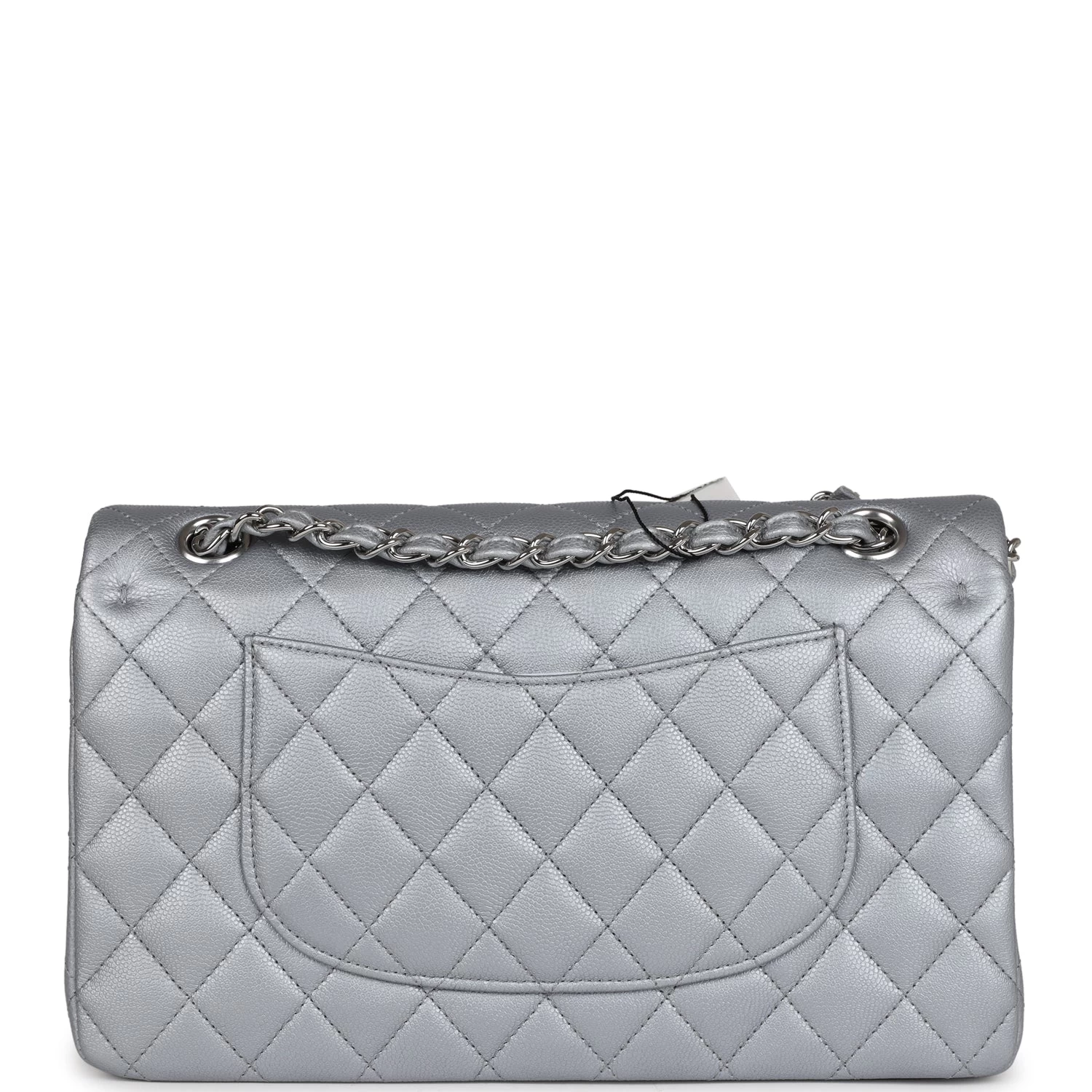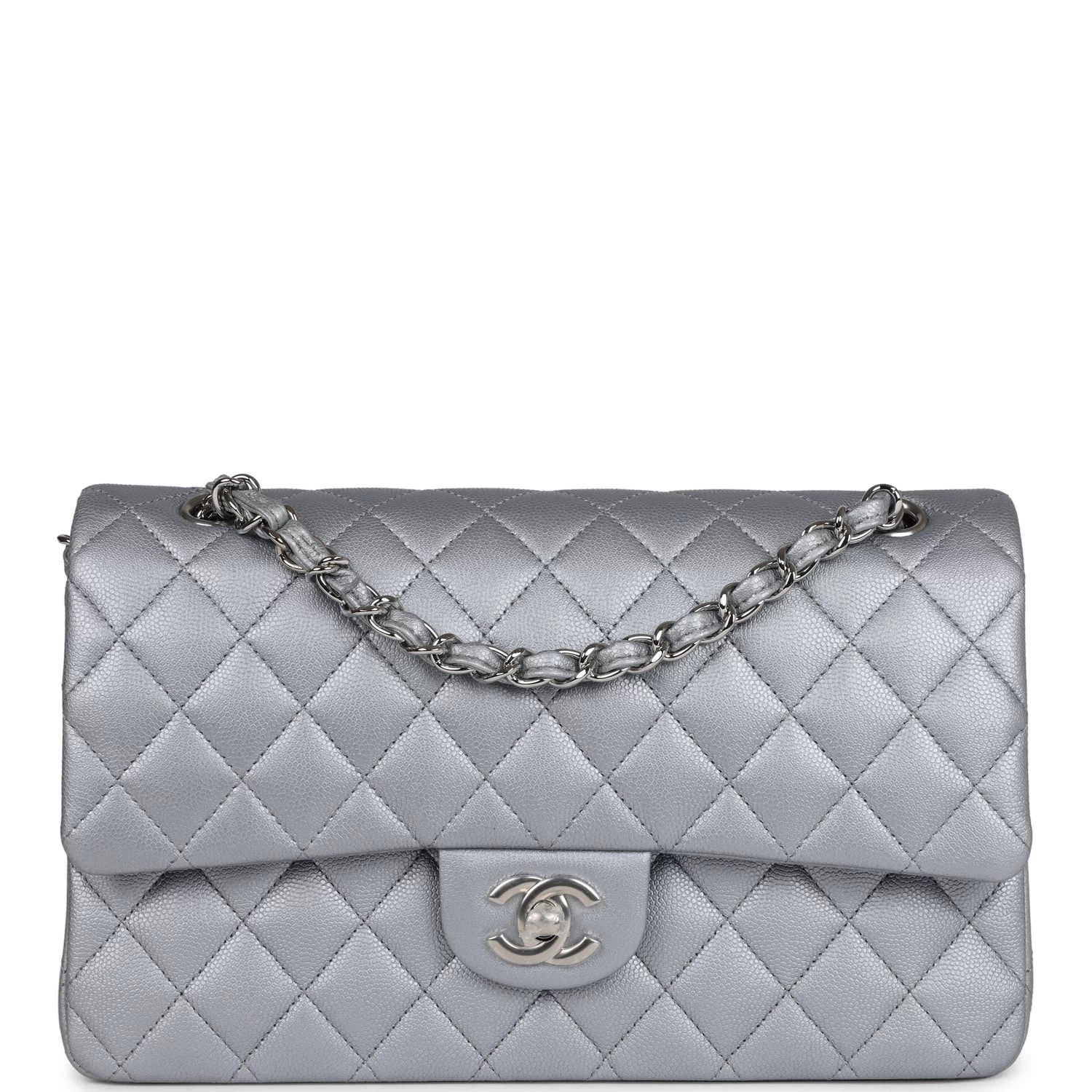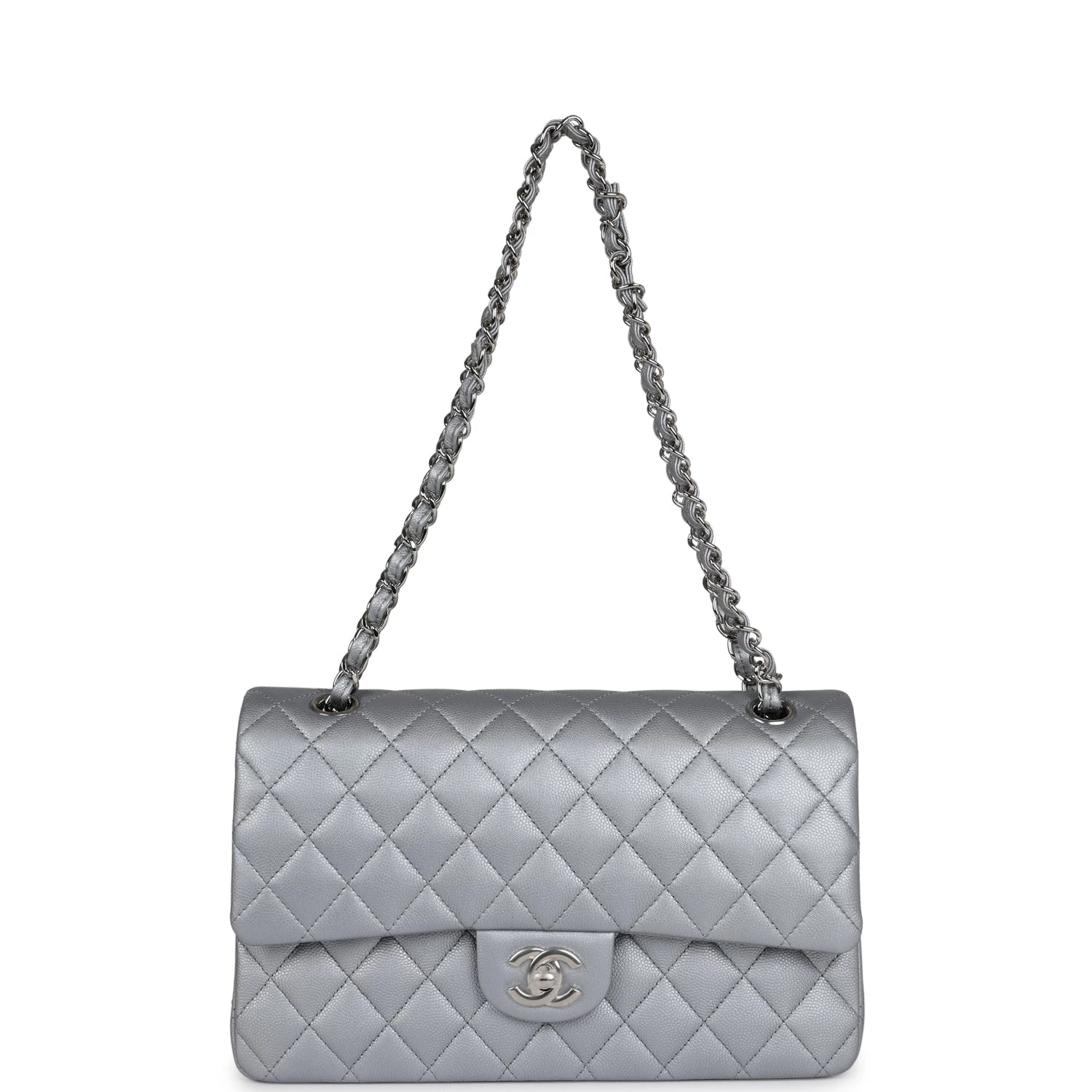 This Medium Classic Double Flap Bag is in Silver Caviar leather with Silver Hardware, front flap with CC turnlock closure, tonal stitching, half moon back pocket and adjustable interwoven silver chain link and silver leather shoulder/crossbody strap. Interior is lined in Silver Leather.