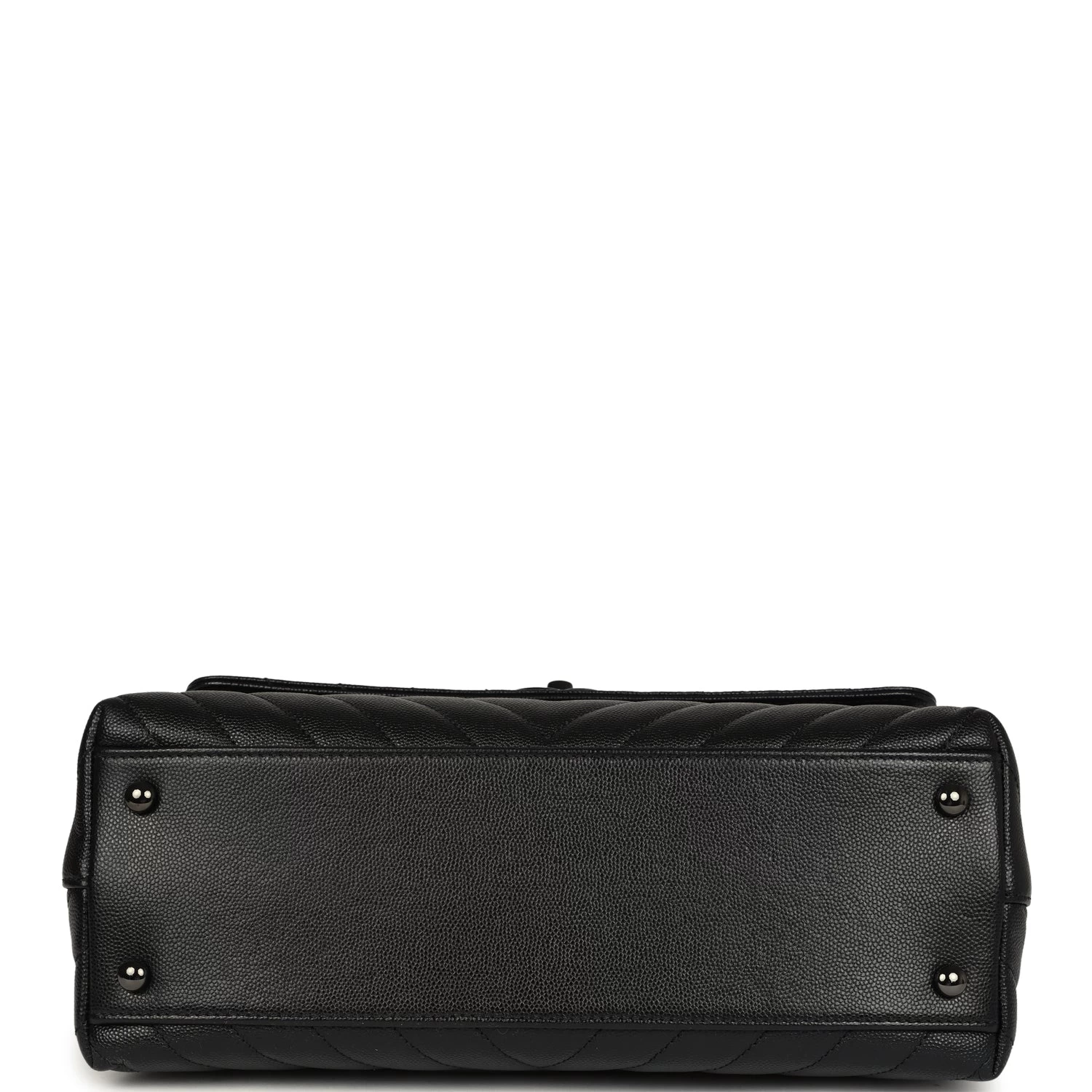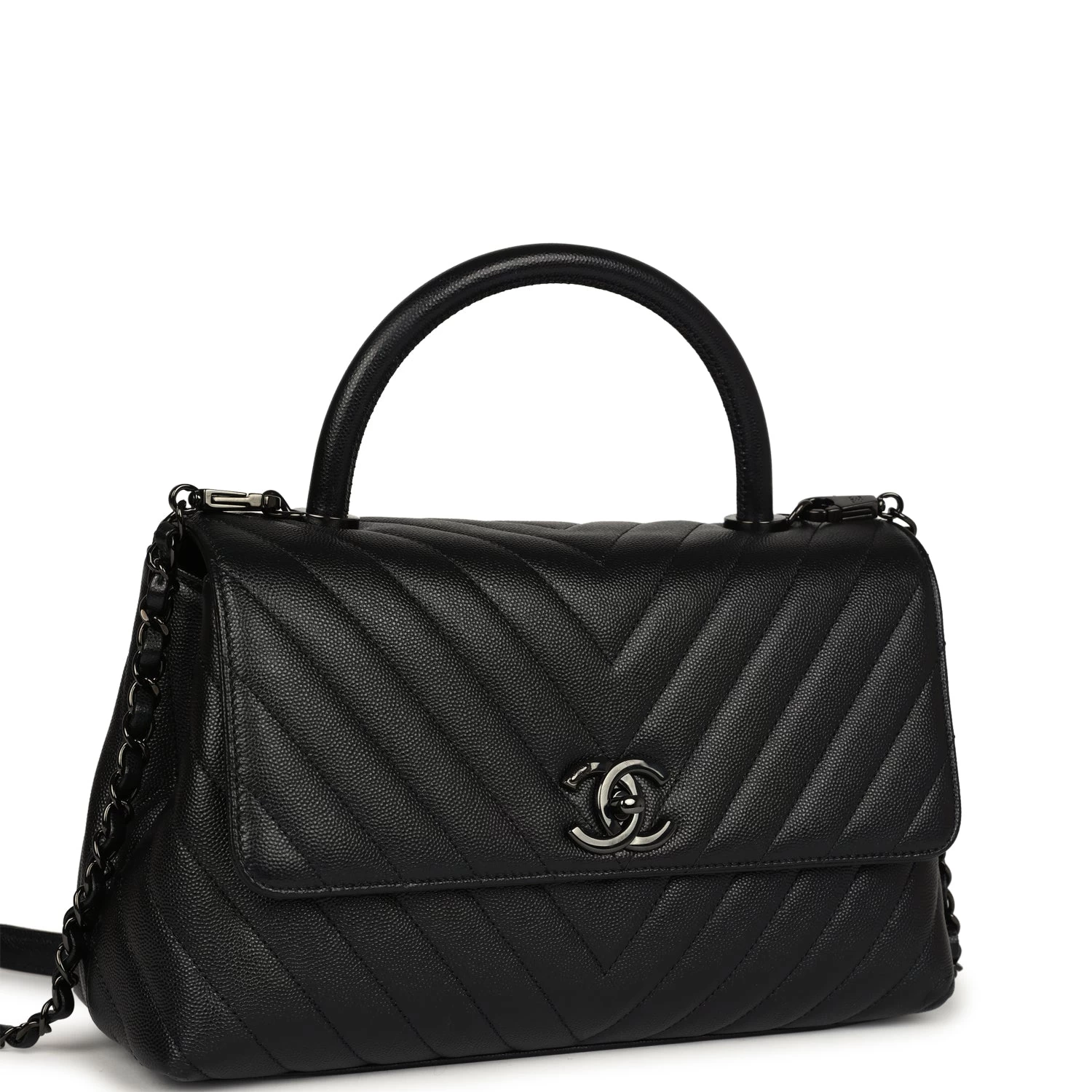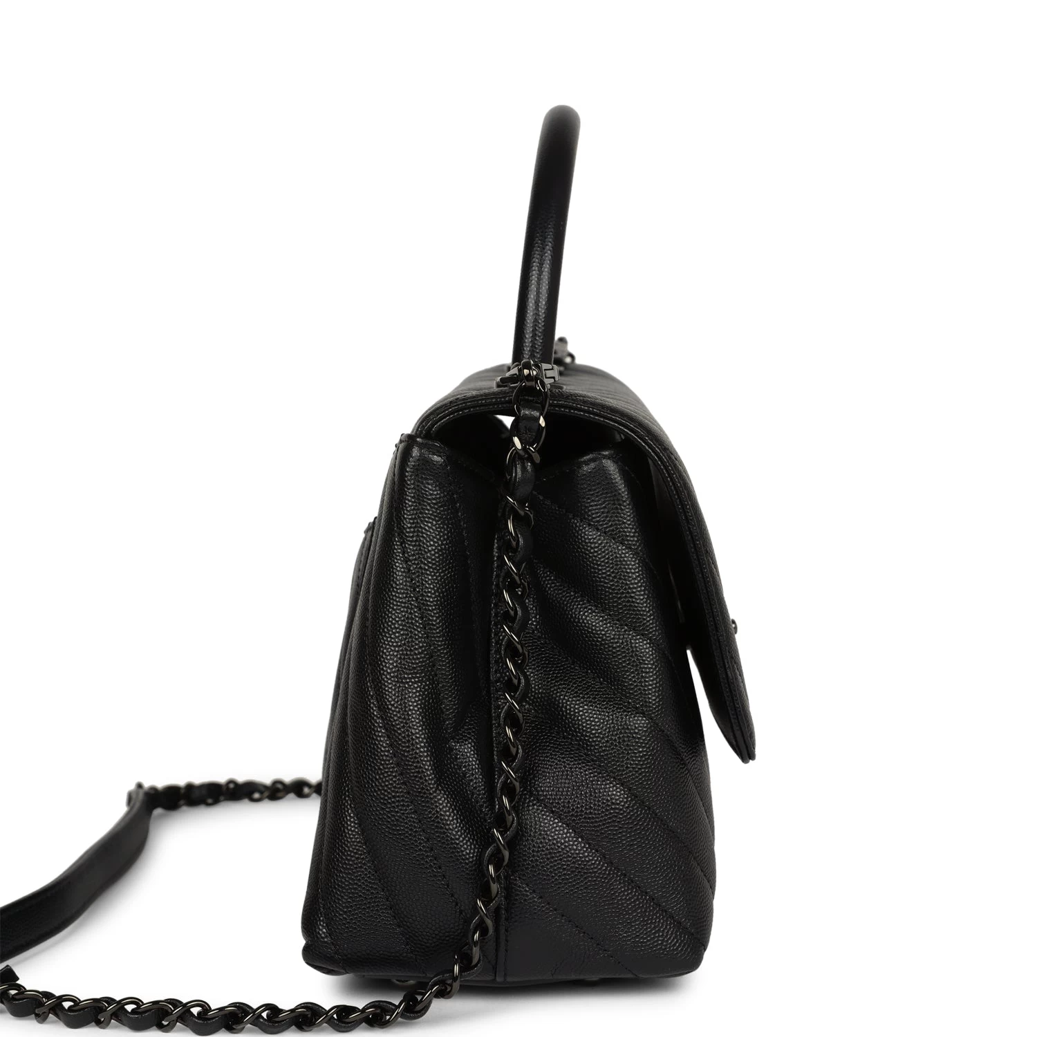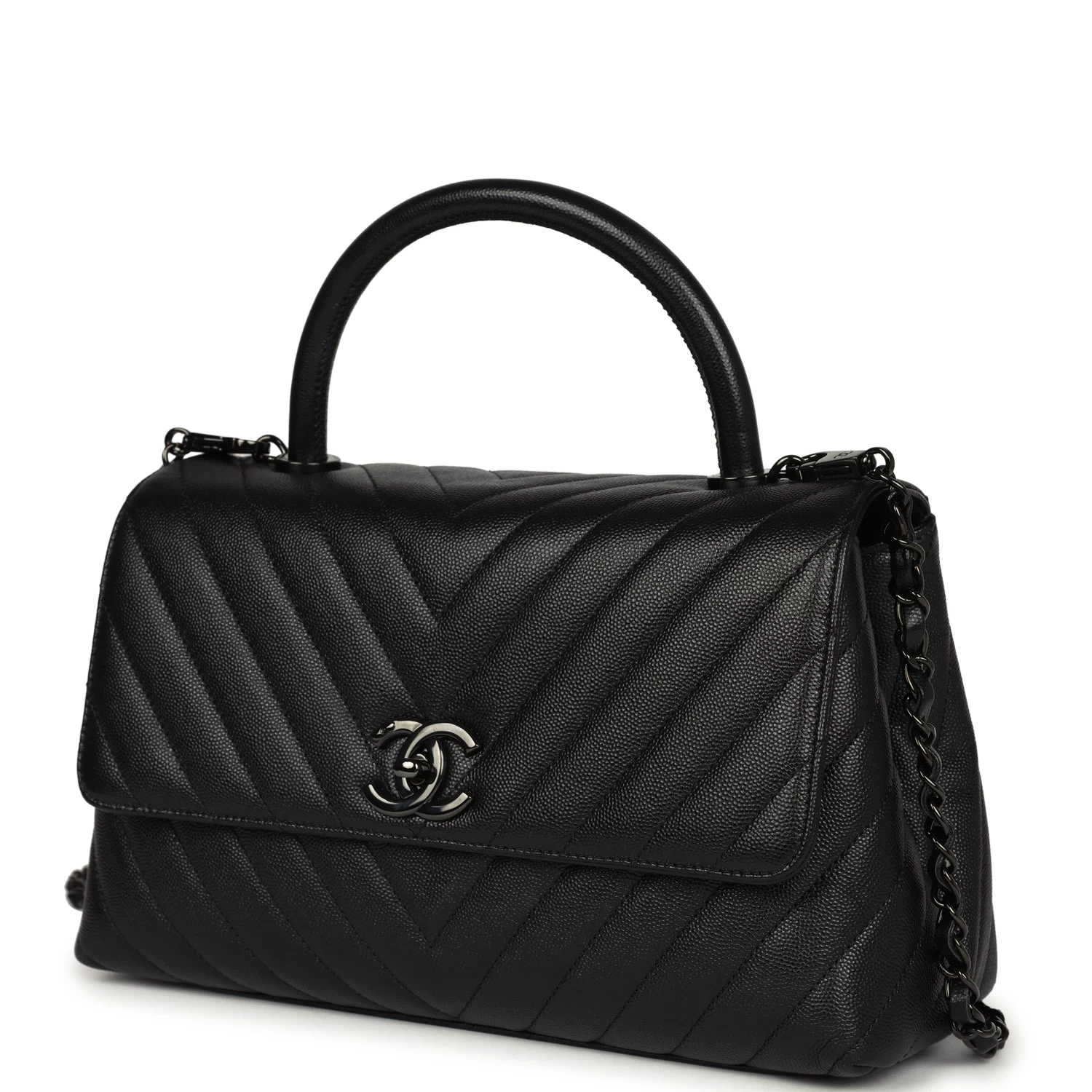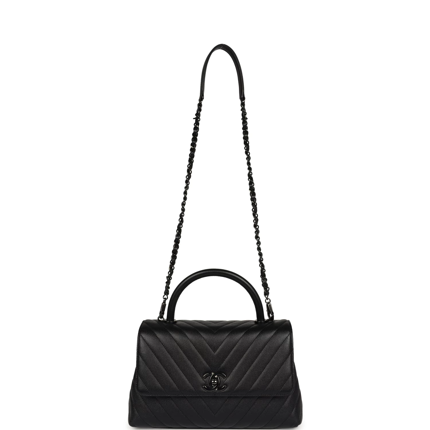 This Medium Coco Handle Flap bag is in Black Caviar leather with Black tone hardware, a signature CC interlocking closure, rolled leather top handle, halfmoon back packet, and a long black leather/metal chain.