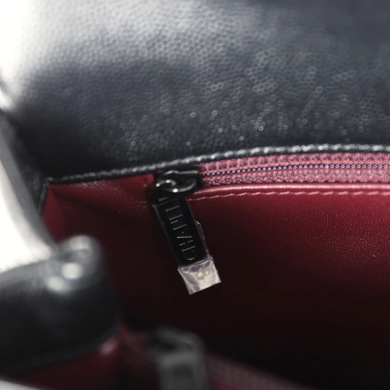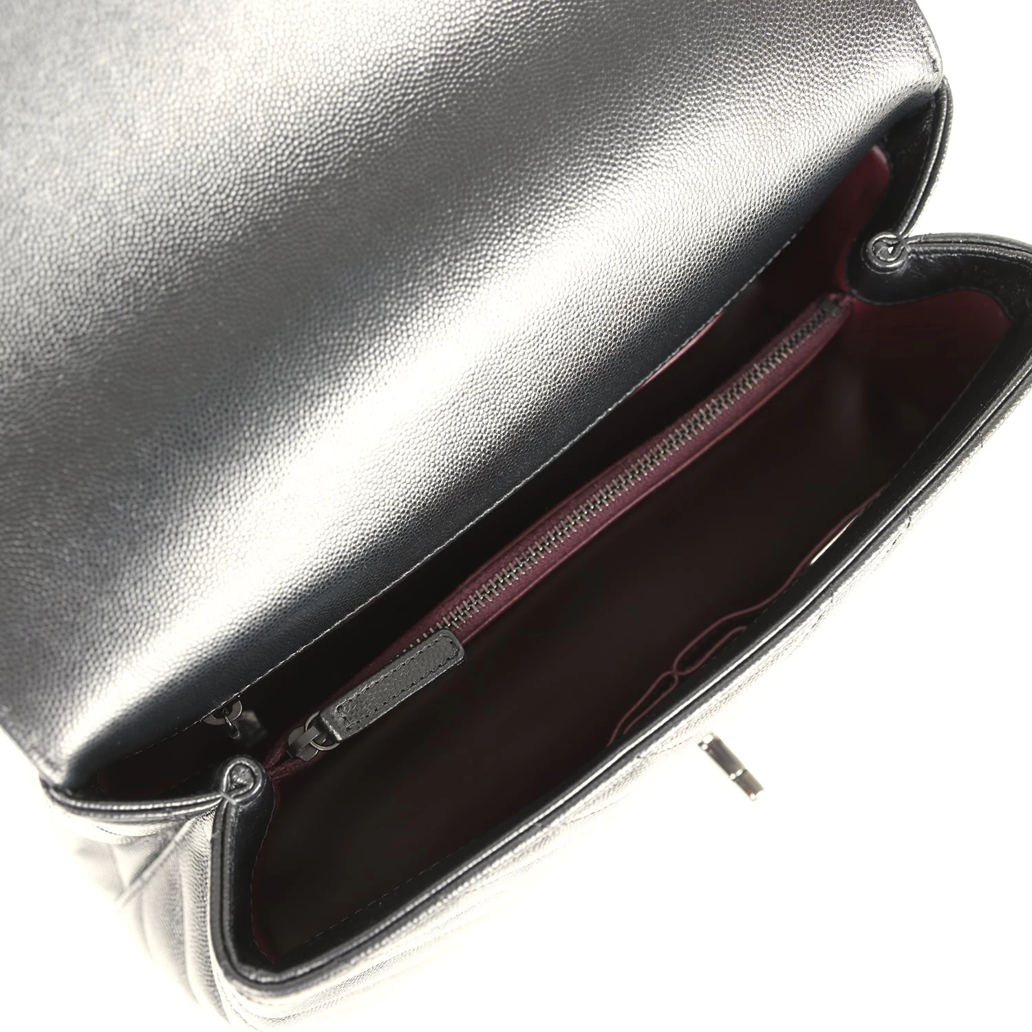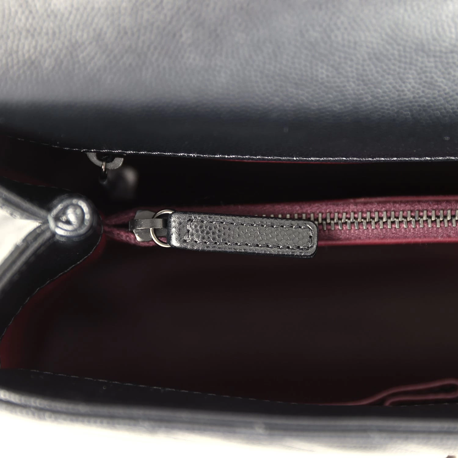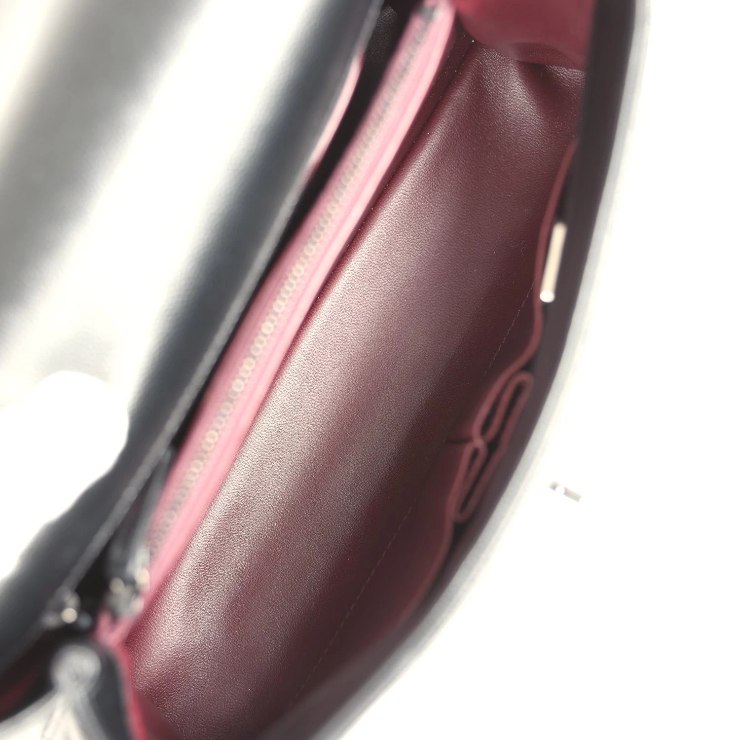 The interior is lined in burgundy leather with one zip pocket on the rear wall, one center divide zip pocket, and two slip pockets on the front wall.
