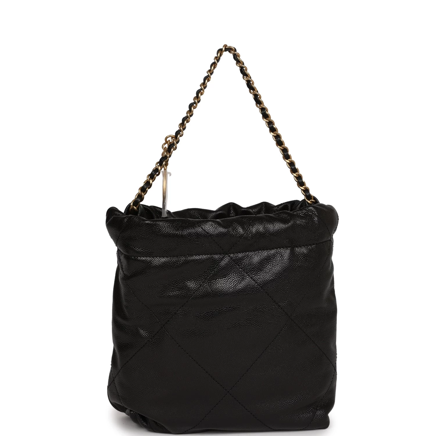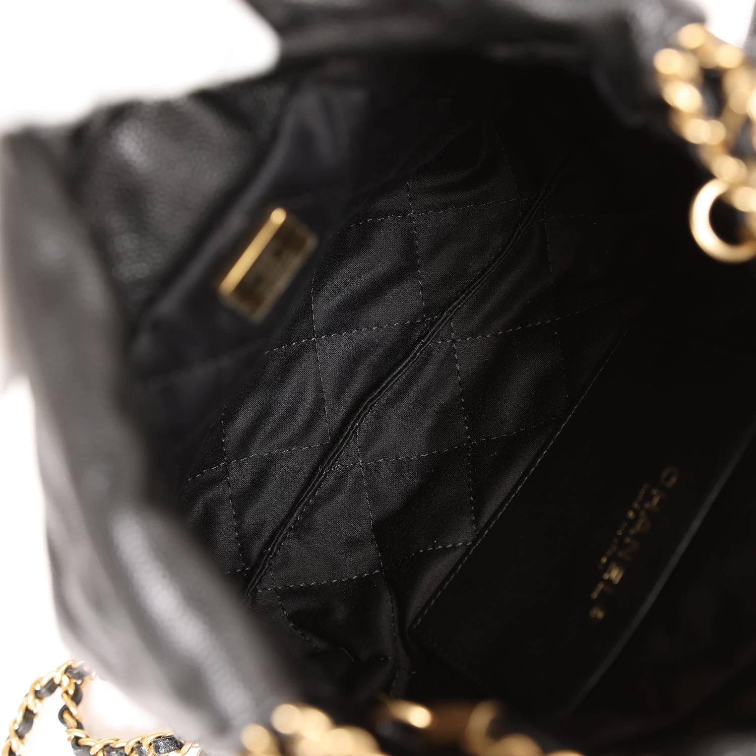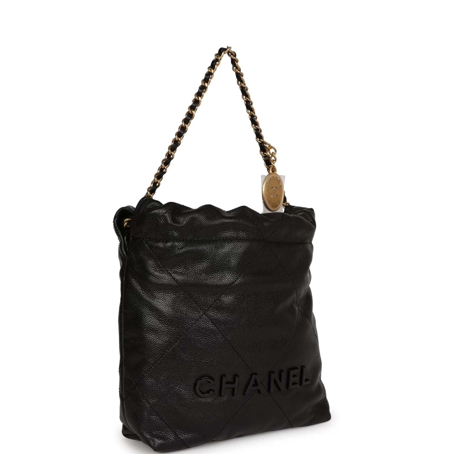 This Mini 22 Hobo Bag is in black caviar with gold tone hardware, CHANEL on the front in black tone metal, a short gold tone and leather interwoven chain, a long one, and a long leather cord strap.