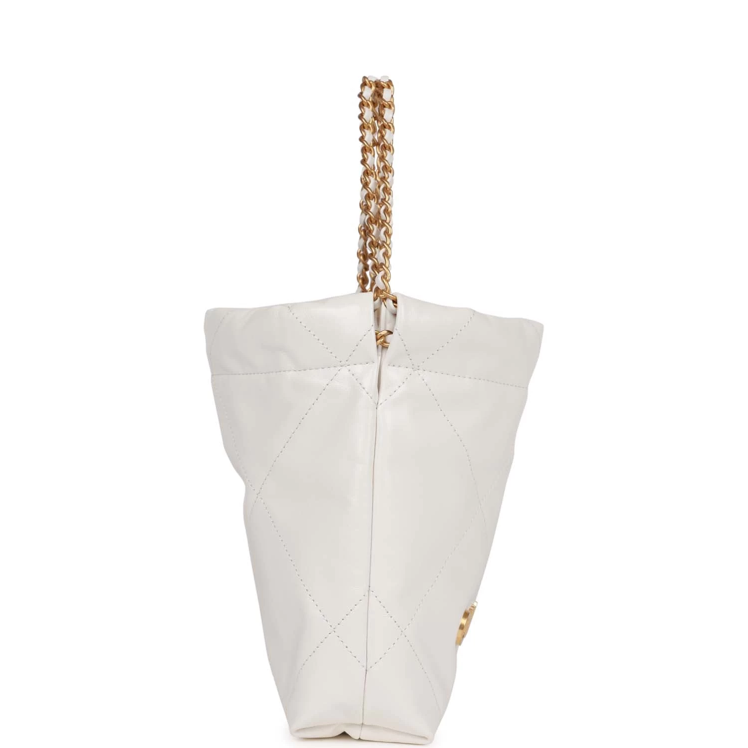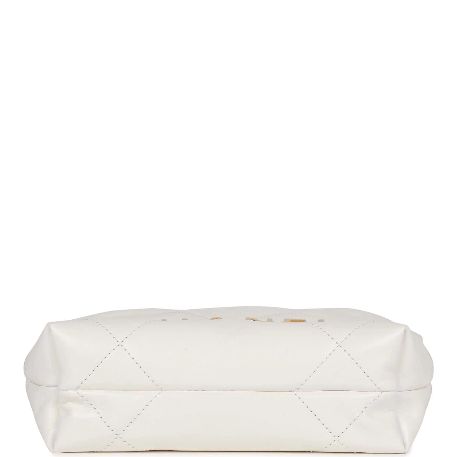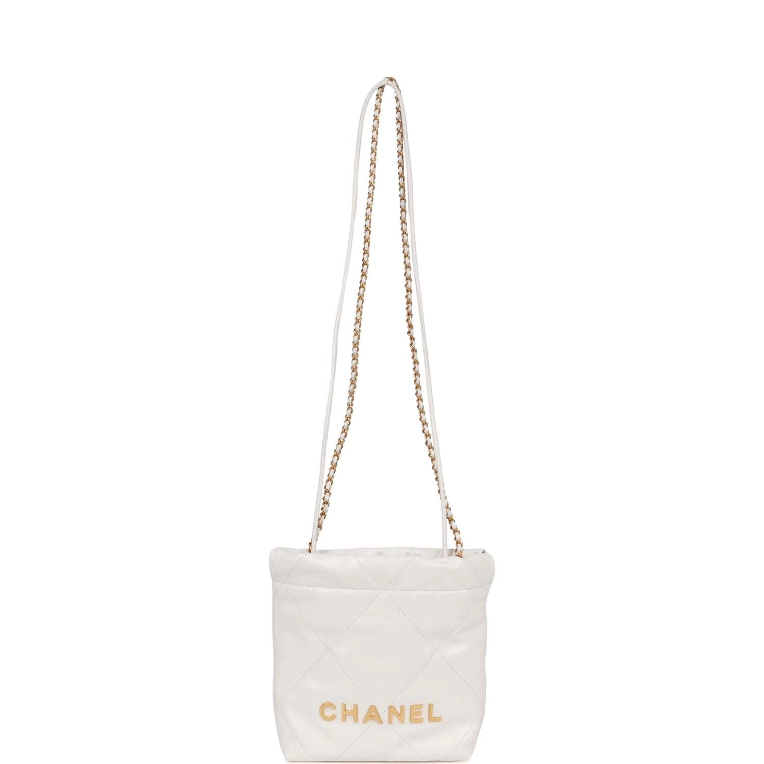 This mini 22 hobo bag in white calfskin with gold tone hardware and has the signature diamond quilting, CHANEL on the front in gold metal, and long gold tone and white leather interwoven chain.