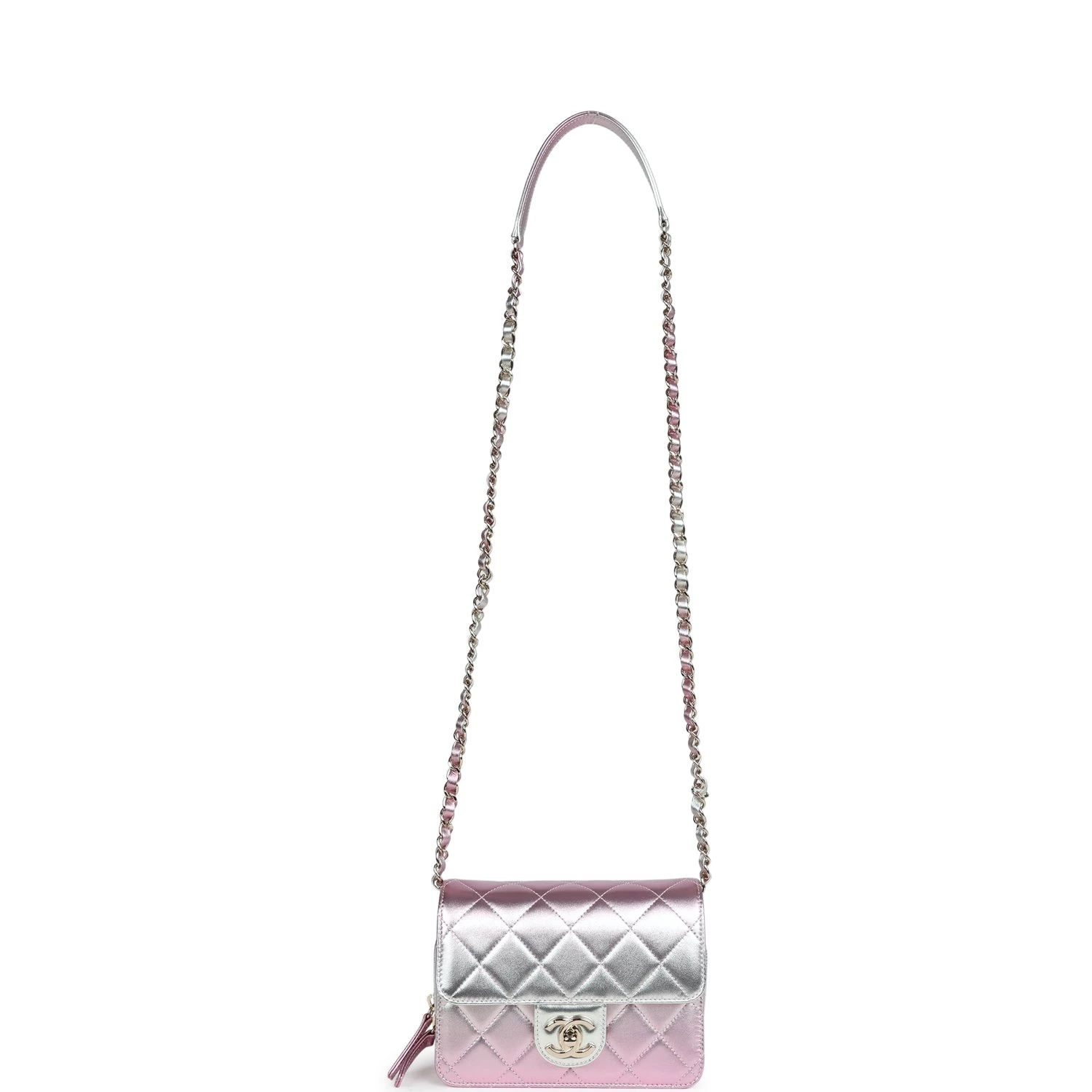 This Mini Flap Bag Ombre Pink Metallic Lambskin leather with Light Gold Hardware, features contrast stitching, flap CC turnlock closure, 3 interior pockets; one open pocket, one main zippered comparment, and one slip pocket on rear wall.Â
